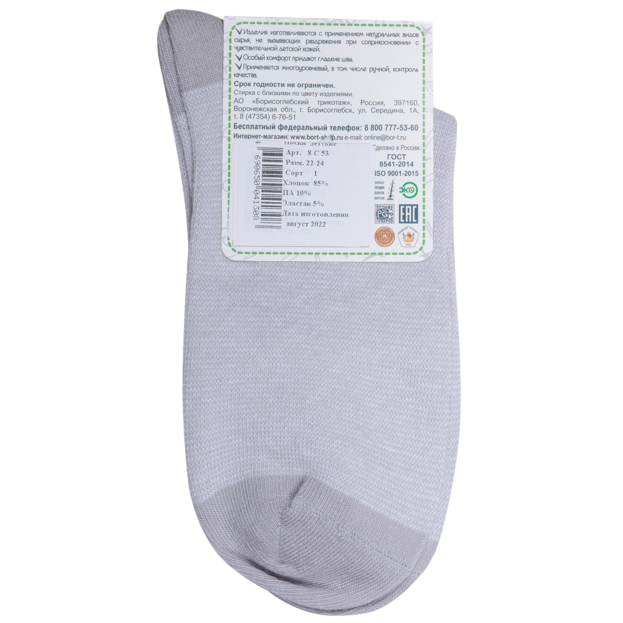 Круглогодичные укороченные детские носки, цвет серый, классические, шов обычный (не бесшовные), принт (рисунок): полоски, с узором, состав: 85% хлопок, 10% полиамид, 5% эластан, арт. 8С53. Производитель «АО Борисоглебский трикотаж, Воронежская обл, Россия» под брендом «Борисоглебский трикотаж».