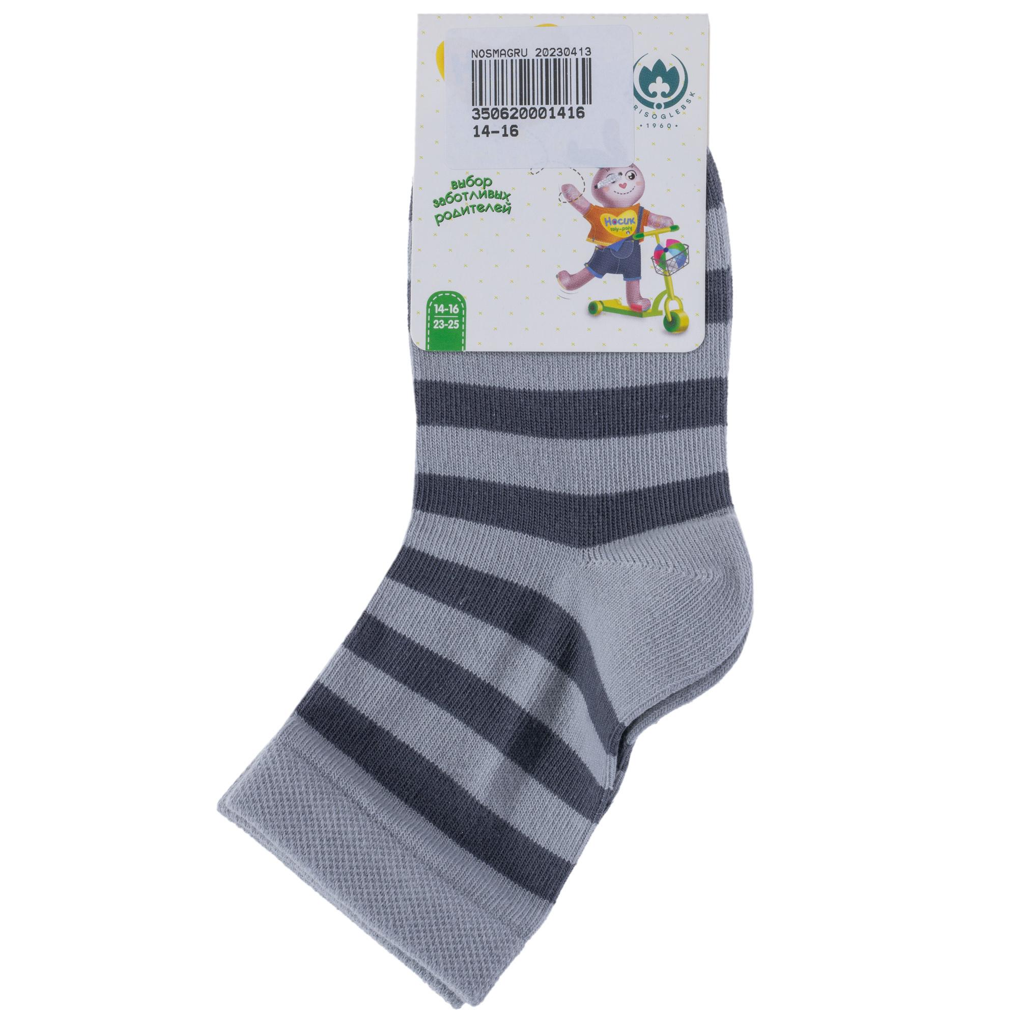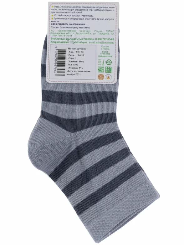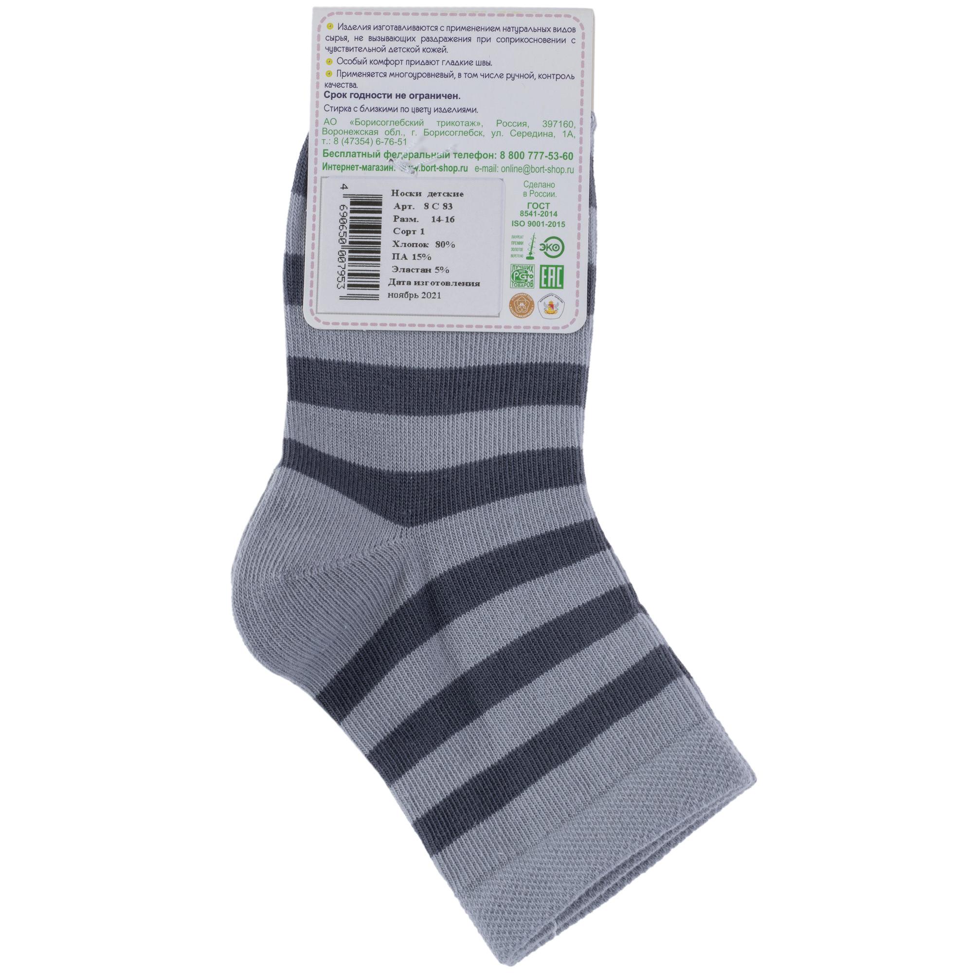 Круглогодичные укороченные детские носки, цвет серый, классические, шов обычный (не бесшовные), принт (рисунок): полоски, с узором, состав: 80% хлопок, 15% полиамид, 5% эластан, арт. 8С83. Производитель «АО Борисоглебский трикотаж, Воронежская обл, Россия» под брендом «Борисоглебский трикотаж».