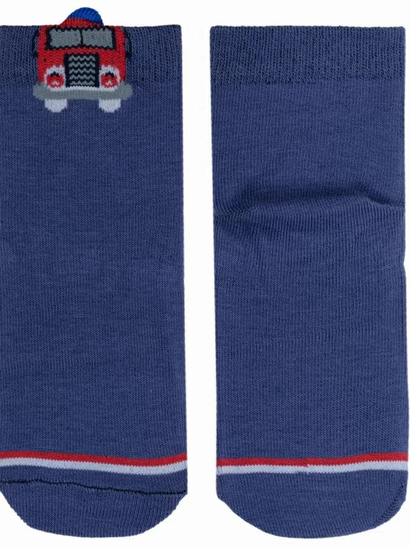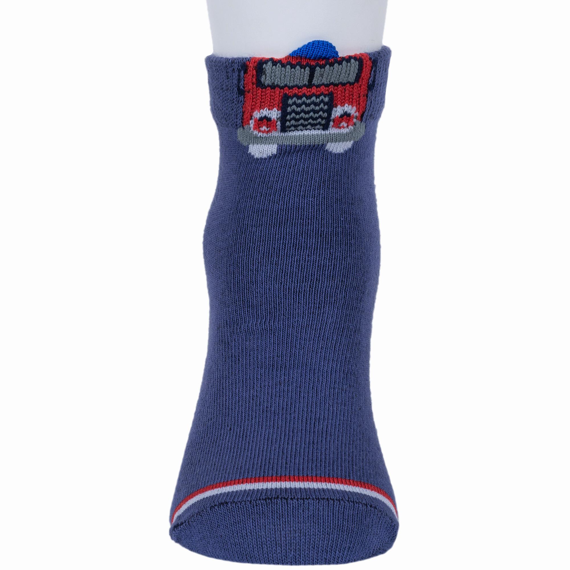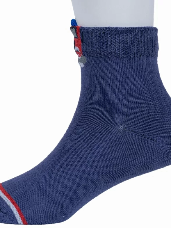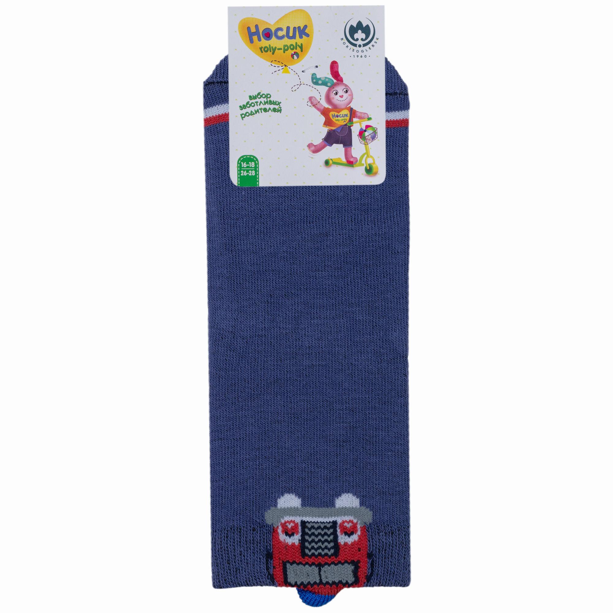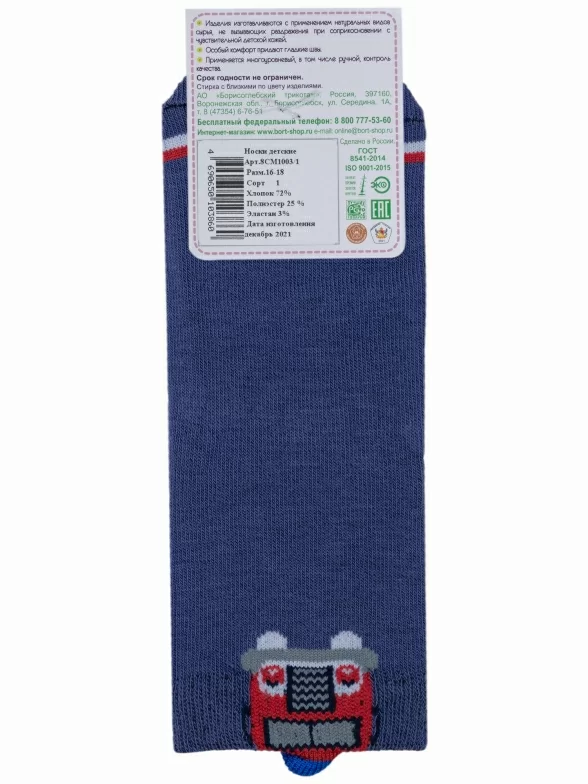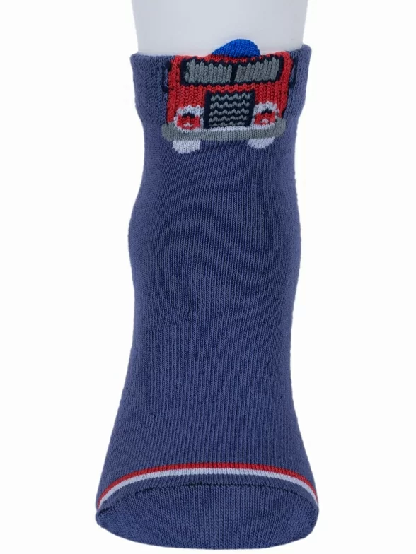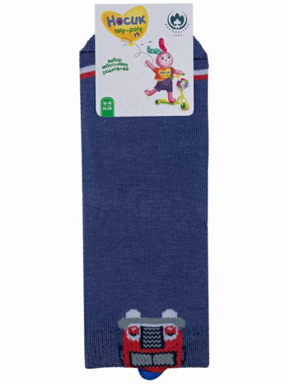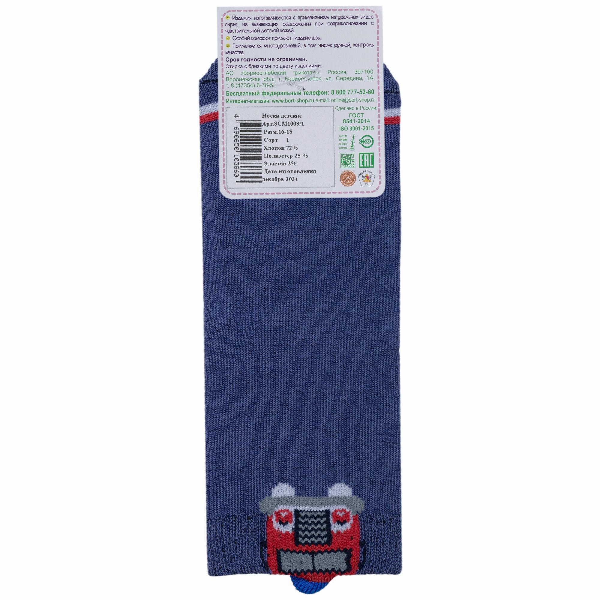 Круглогодичные укороченные детские носки, цвет синий-джинс, повседневные, шов обычный (не бесшовные), принт (рисунок): транспорт, с узором, состав: 72% хлопок, 25% полиэстер, 3% эластан, арт. 8СМ1003/1. Производитель «АО Борисоглебский трикотаж, Воронежская обл, Россия» под брендом «Борисоглебский трикотаж».