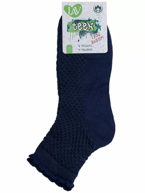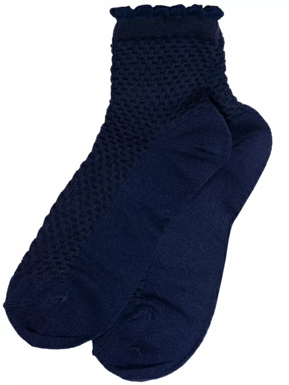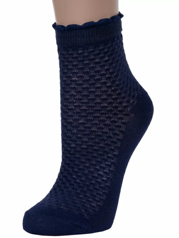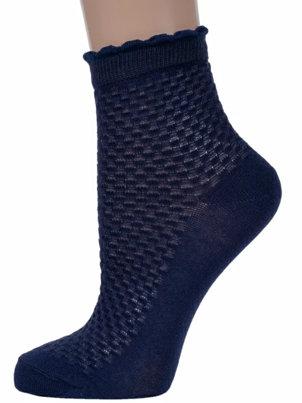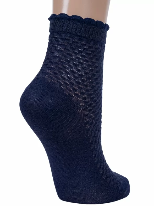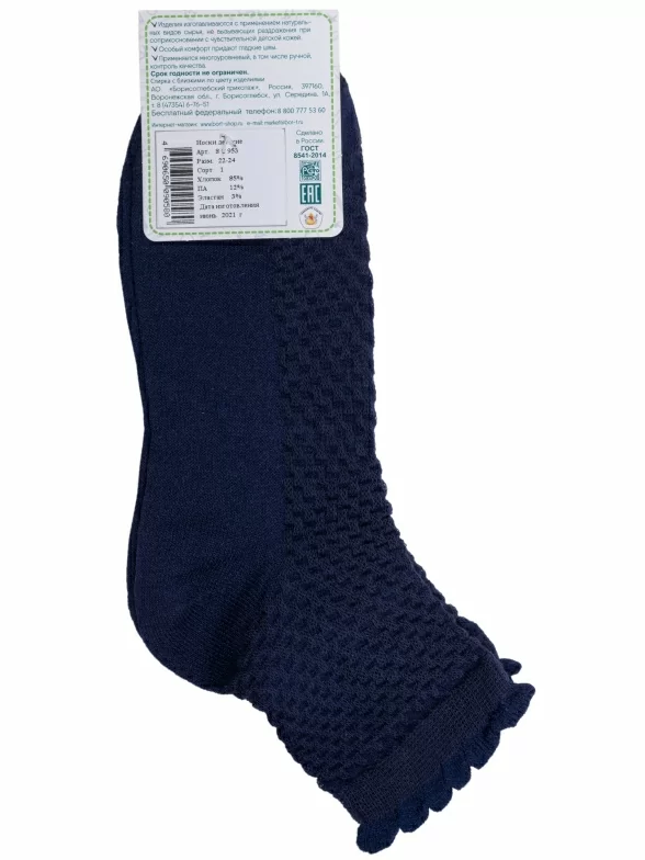 Летние укороченные детские носки, цвет темно-синий, в сеточку, классические, шов обычный (не бесшовные), принт (рисунок): с узором, состав: 85% хлопок, 12% полиамид, 3% эластан, арт. 8С953. Производитель «АО Борисоглебский трикотаж, Воронежская обл, Россия» под брендом «Борисоглебский трикотаж».