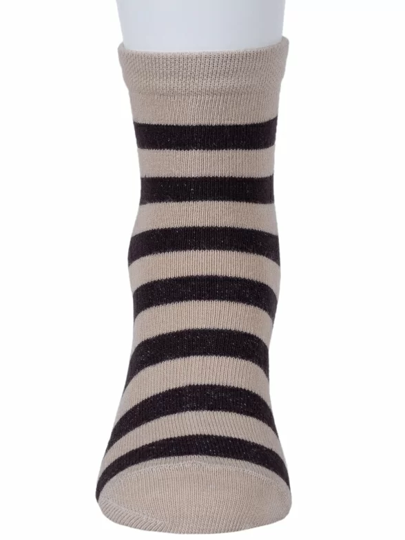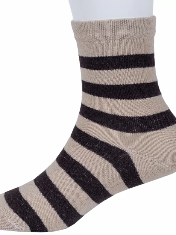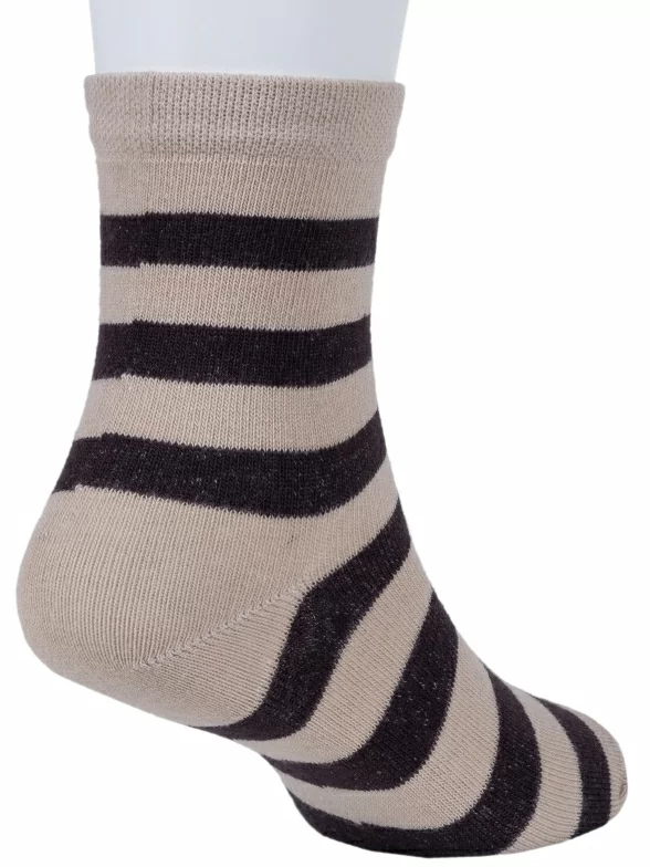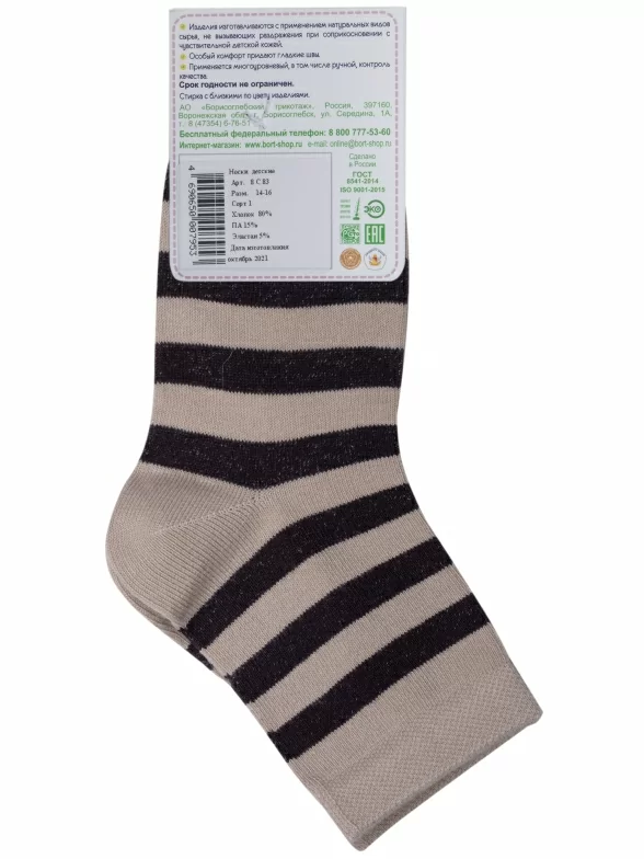 Круглогодичные укороченные детские носки, цвет бежевый, классические, шов обычный (не бесшовные), принт (рисунок): полоски, с узором, состав: 80% хлопок, 15% полиамид, 5% эластан, арт. 8С83. Производитель «АО Борисоглебский трикотаж, Воронежская обл, Россия» под брендом «Борисоглебский трикотаж».