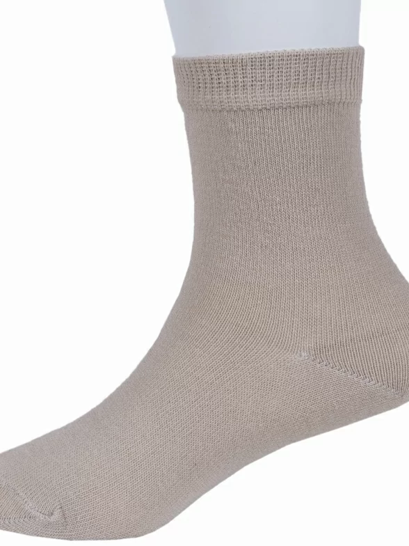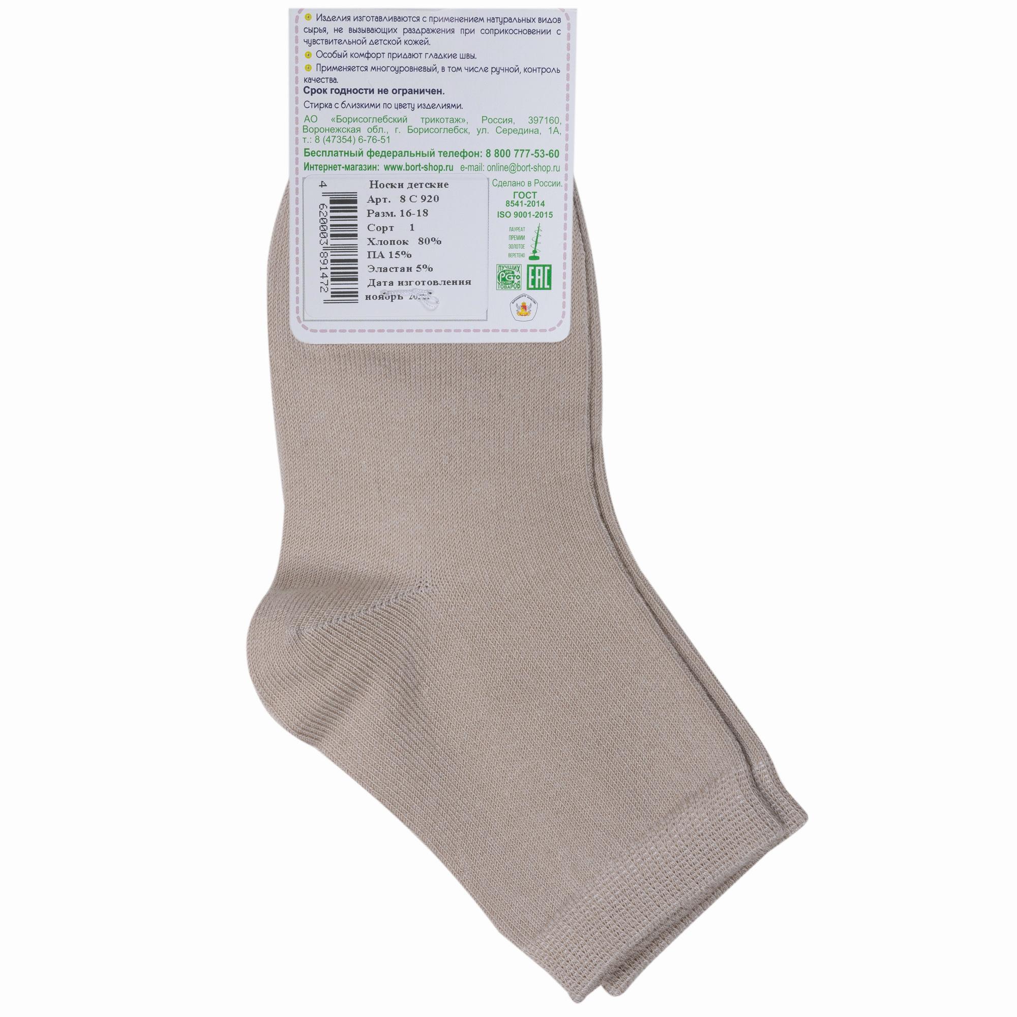 Круглогодичные укороченные детские носки, цвет бежевый, классические, шов обычный (не бесшовные), принт (рисунок): однотонный, без рисунков/узоров, состав: 80% хлопок, 15% полиамид, 5% эластан, арт. 8С920. Производитель «АО Борисоглебский трикотаж, Воронежская обл, Россия» под брендом «Борисоглебский трикотаж».