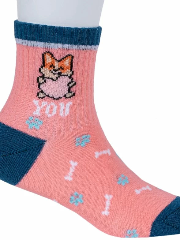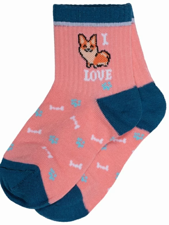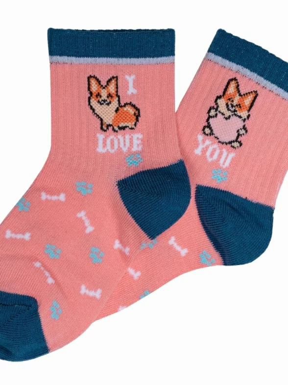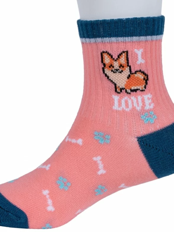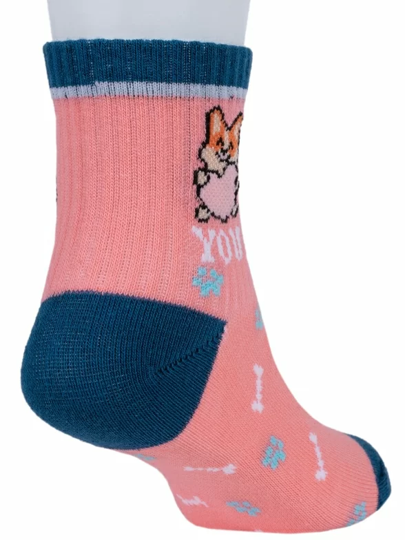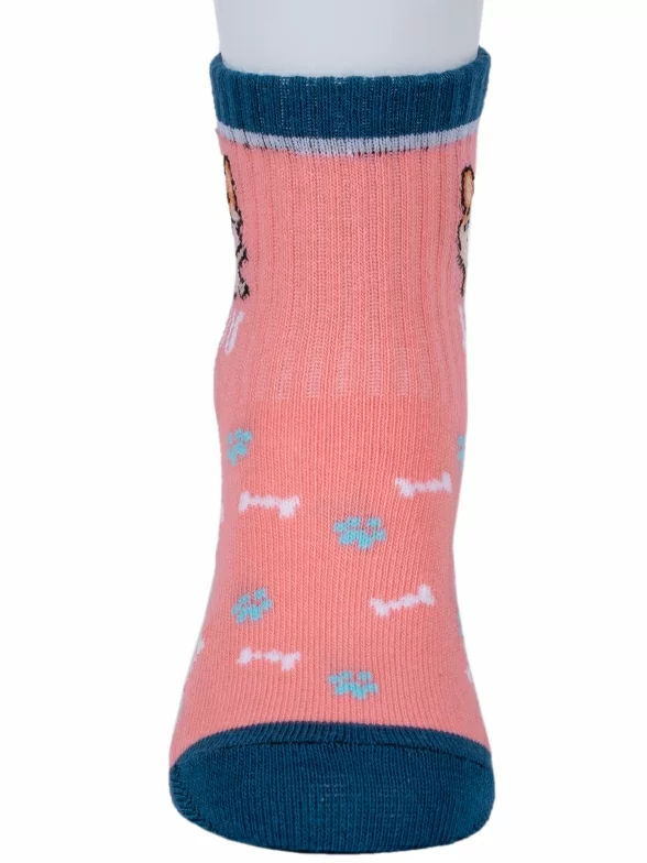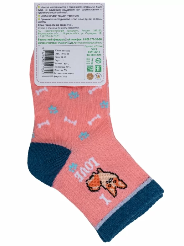 Круглогодичные укороченные детские носки, цвет розовый, повседневные, шов обычный (не бесшовные), принт (рисунок): сердечки / поцелуи / любовь, животные, в рубчик, с узором, состав: 60% хлопок, 33% полиэстер, 7% эластан, арт. 8С232. Производитель «АО Борисоглебский трикотаж, Воронежская обл, Россия» под брендом «Борисоглебский трикотаж».