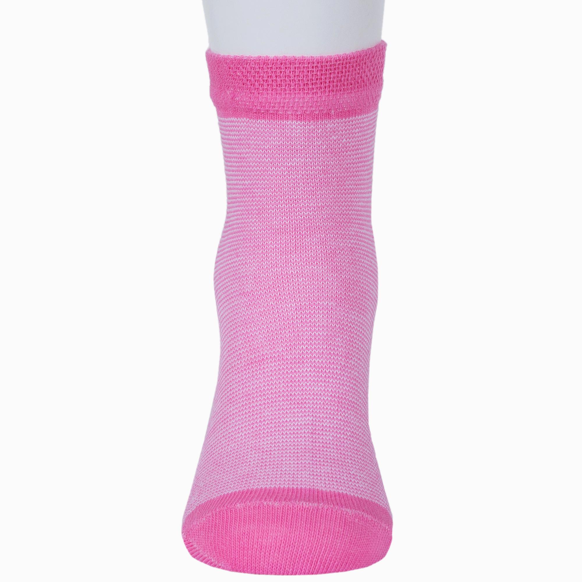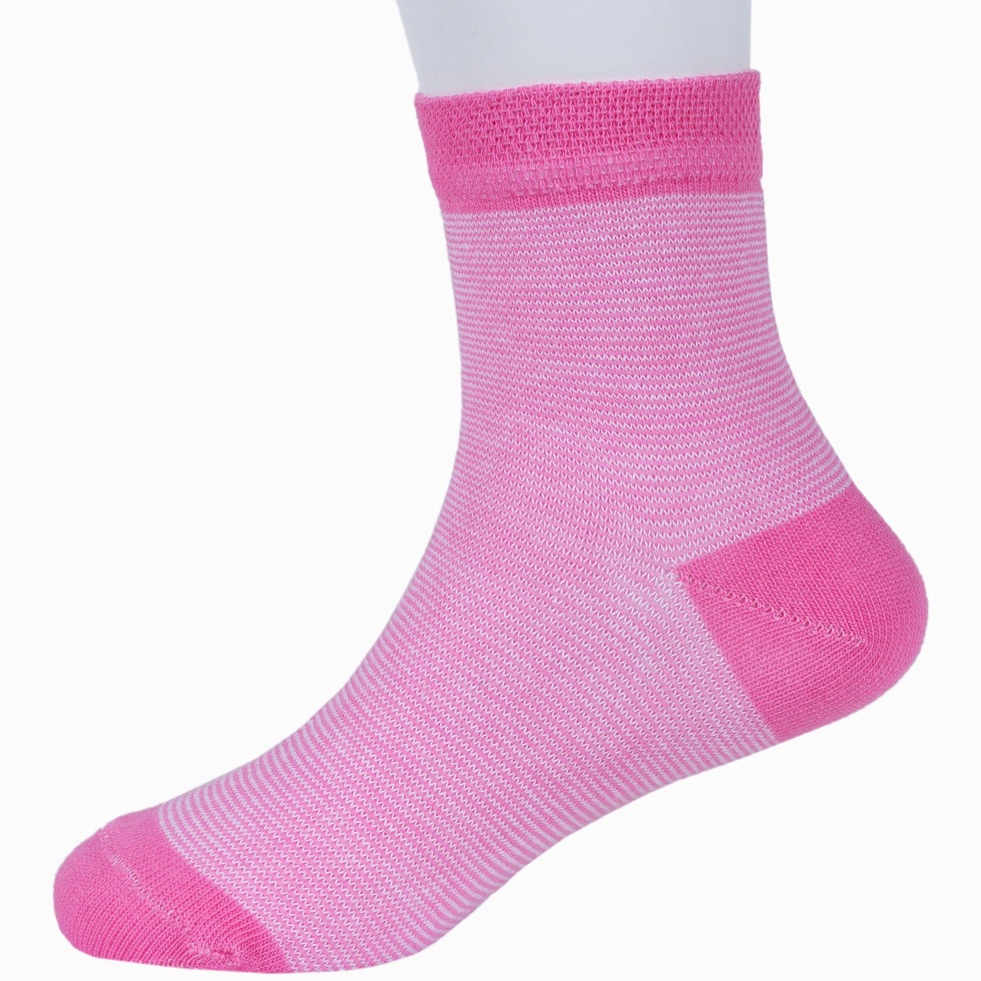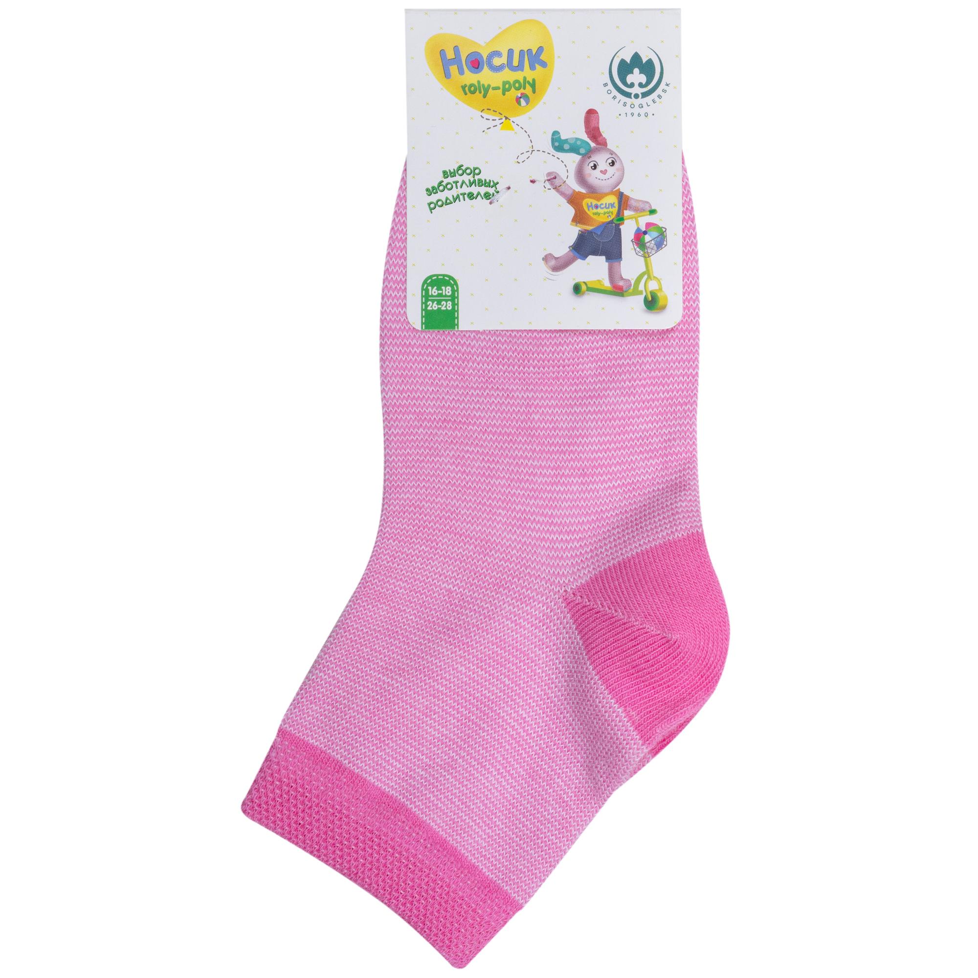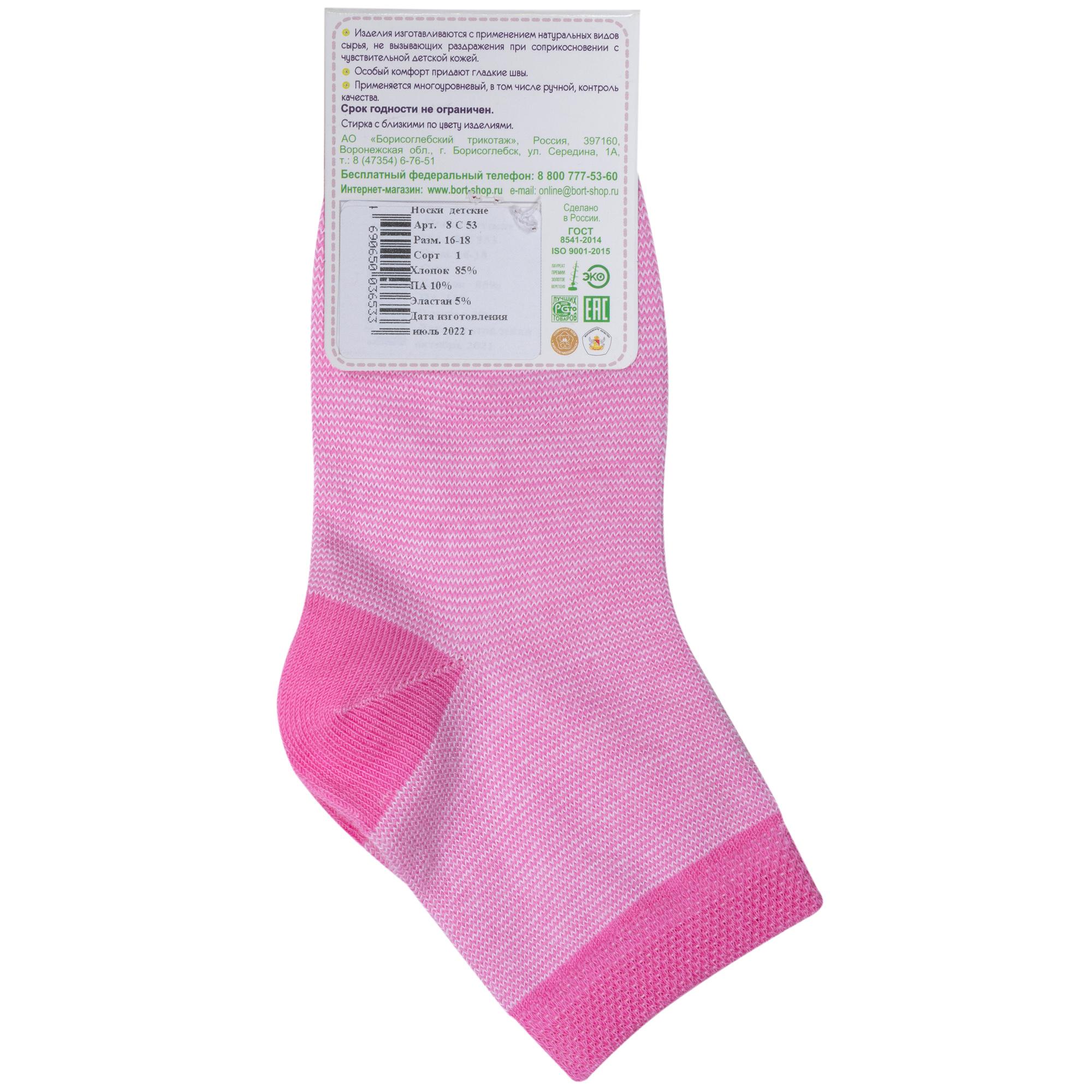 Круглогодичные укороченные детские носки, цвет розовый, классические, шов обычный (не бесшовные), принт (рисунок): полоски, с узором, состав: 85% хлопок, 10% полиамид, 5% эластан, арт. 8С53. Производитель «АО Борисоглебский трикотаж, Воронежская обл, Россия» под брендом «Борисоглебский трикотаж».