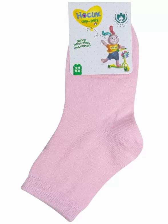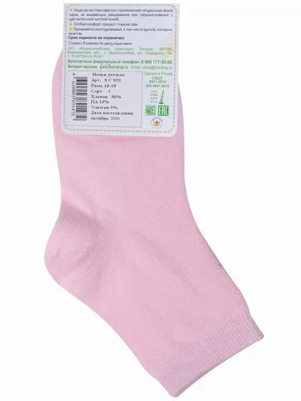 Круглогодичные укороченные детские носки, цвет розовый, классические, шов обычный (не бесшовные), принт (рисунок): однотонный, без рисунков/узоров, состав: 80% хлопок, 15% полиамид, 5% эластан, арт. 8С920. Производитель «АО Борисоглебский трикотаж, Воронежская обл, Россия» под брендом «Борисоглебский трикотаж».