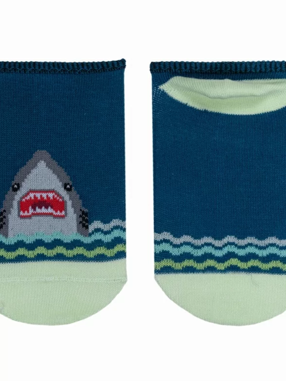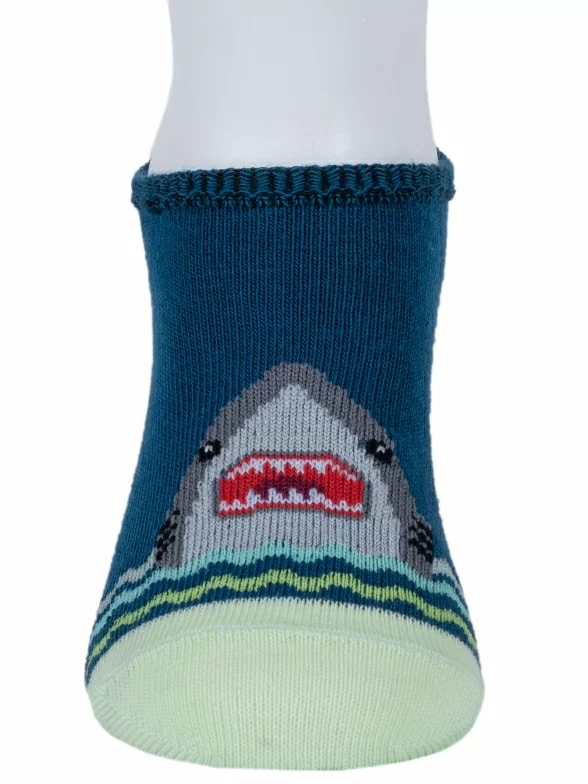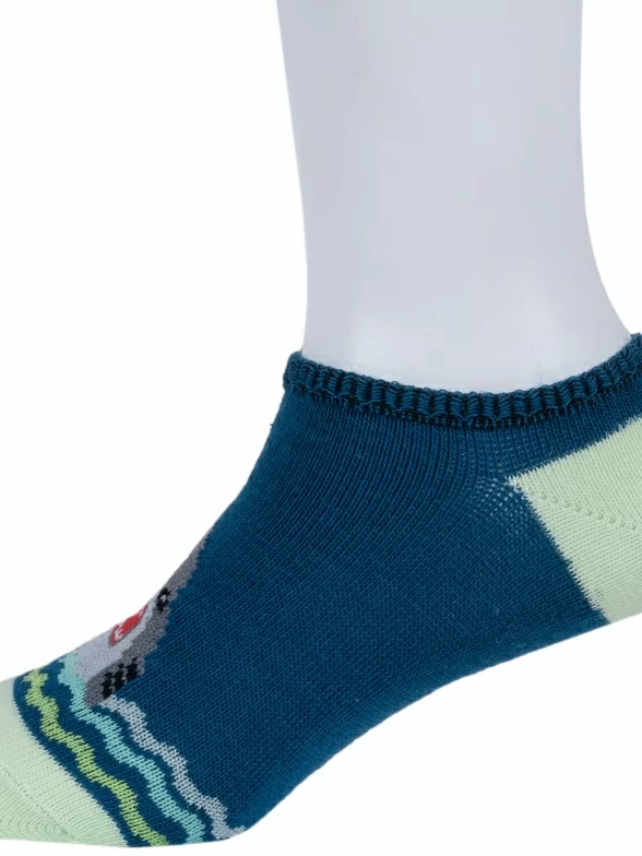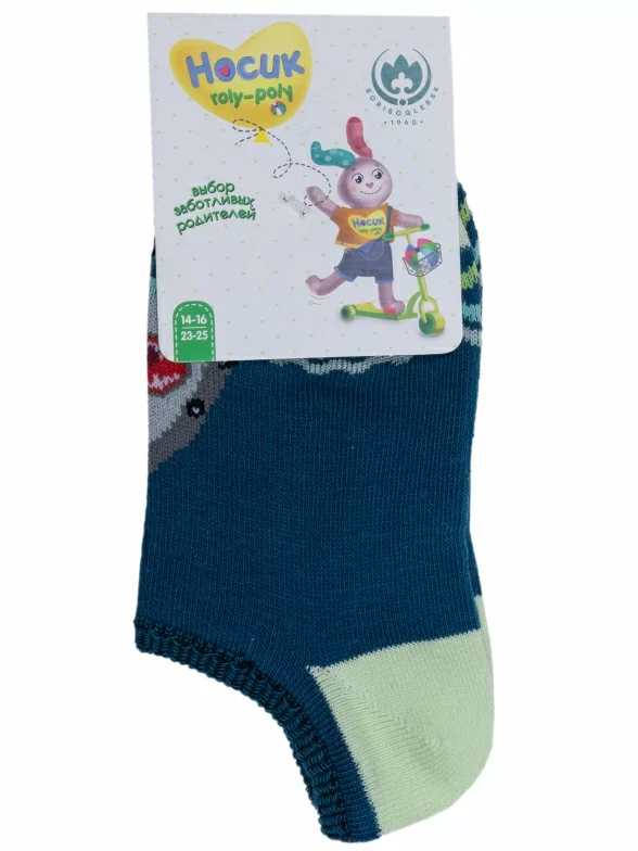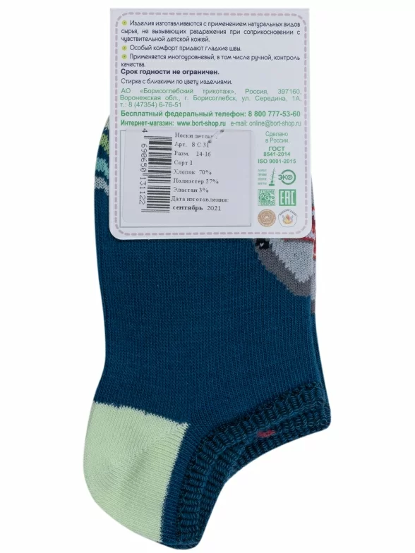 Летние ультракороткие детские носки, цвет синий, повседневные, шов обычный (не бесшовные), принт (рисунок): животные, с узором, состав: 70% хлопок, 27% полиэстер, 3% эластан, арт. 8С31. Производитель «АО Борисоглебский трикотаж, Воронежская обл, Россия» под брендом «Борисоглебский трикотаж».