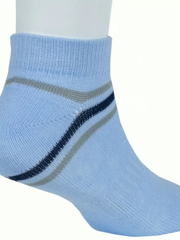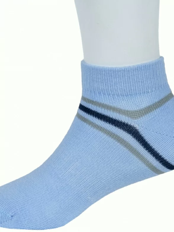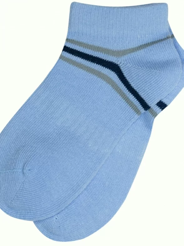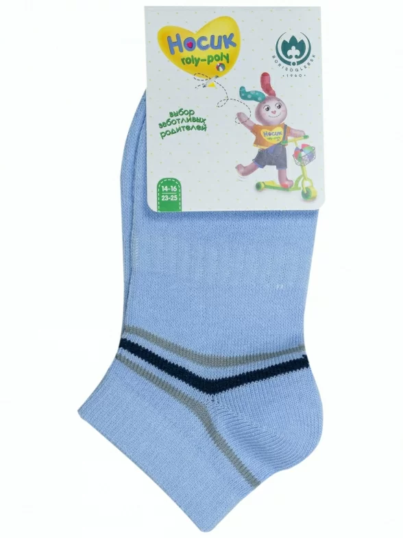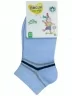 Круглогодичные короткие детские носки, цвет голубой, спортивные, шов кеттельный (бесшовная технология), принт (рисунок): спортивные, с узором, состав: 73% хлопок, 24% полиэстер, 3% эластан, арт. 8С1801-К. Производитель «АО Борисоглебский трикотаж, Воронежская обл, Россия» под брендом «Борисоглебский трикотаж».