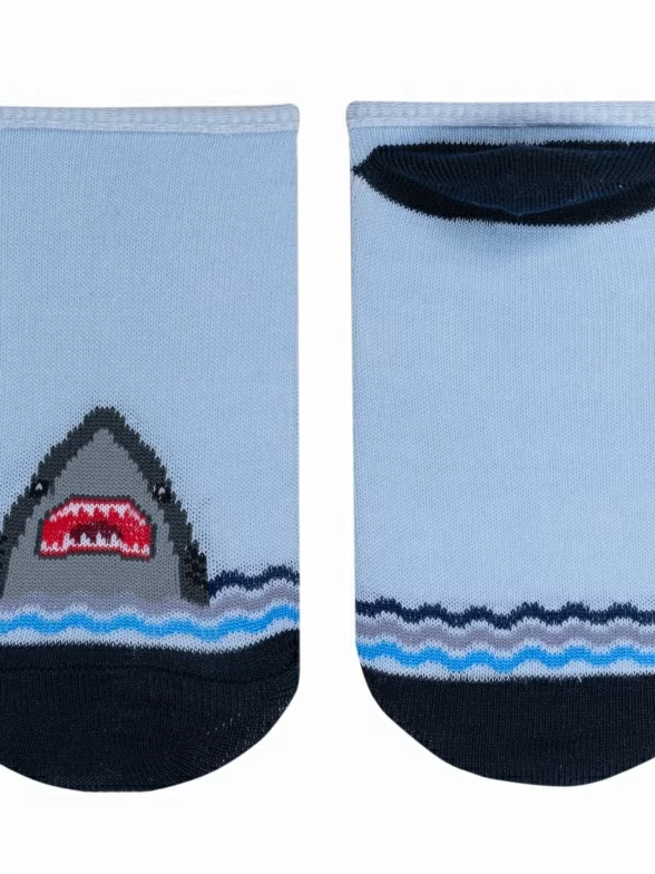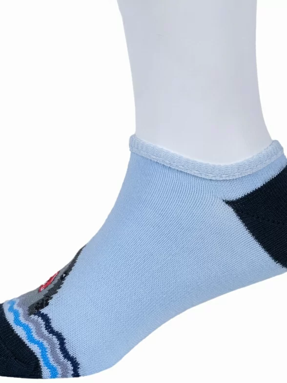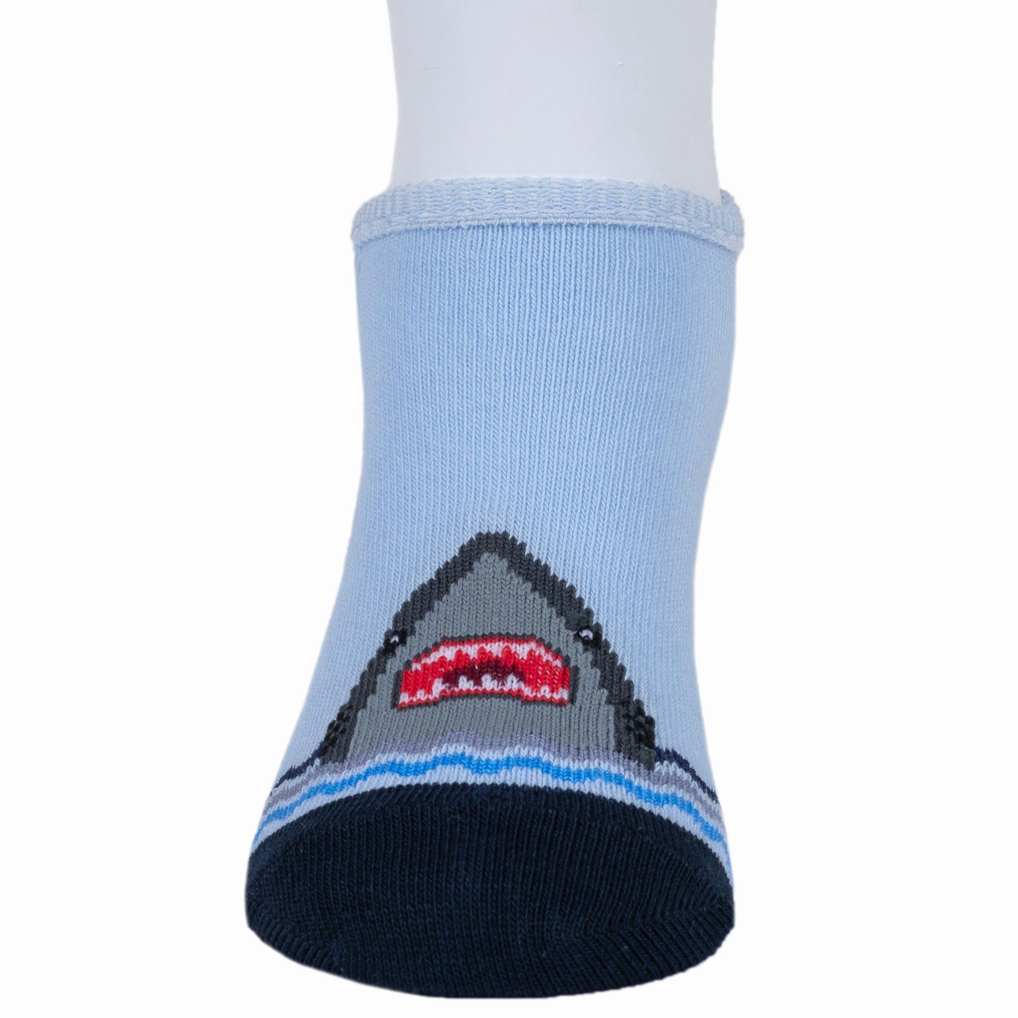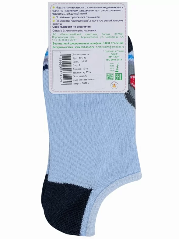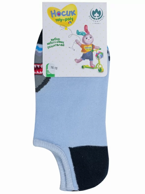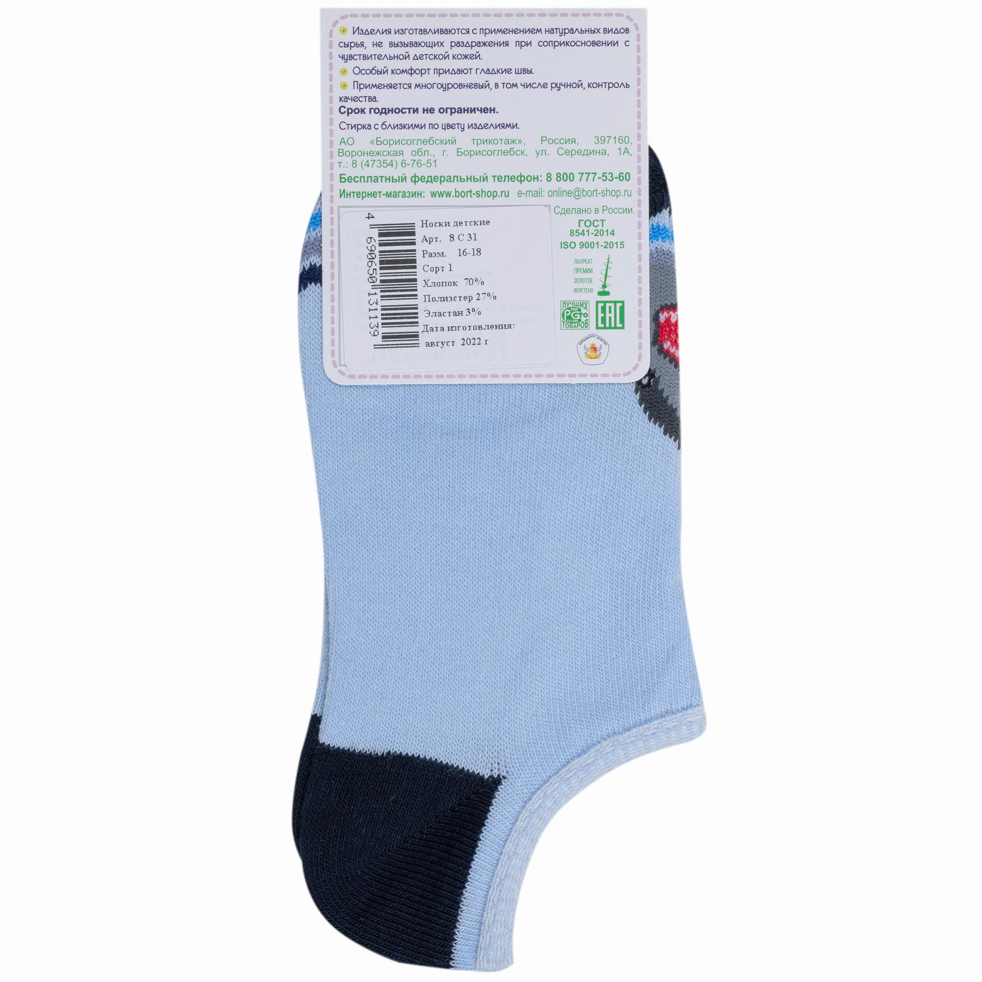 Летние ультракороткие детские носки, цвет голубой, повседневные, шов обычный (не бесшовные), принт (рисунок): животные, с узором, состав: 70% хлопок, 27% полиэстер, 3% эластан, арт. 8С31. Производитель «АО Борисоглебский трикотаж, Воронежская обл, Россия» под брендом «Борисоглебский трикотаж».