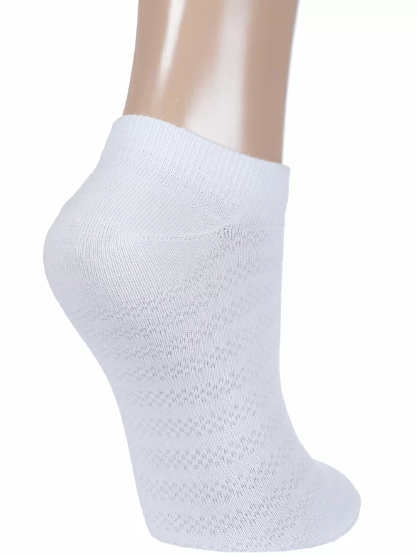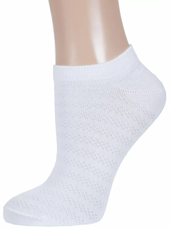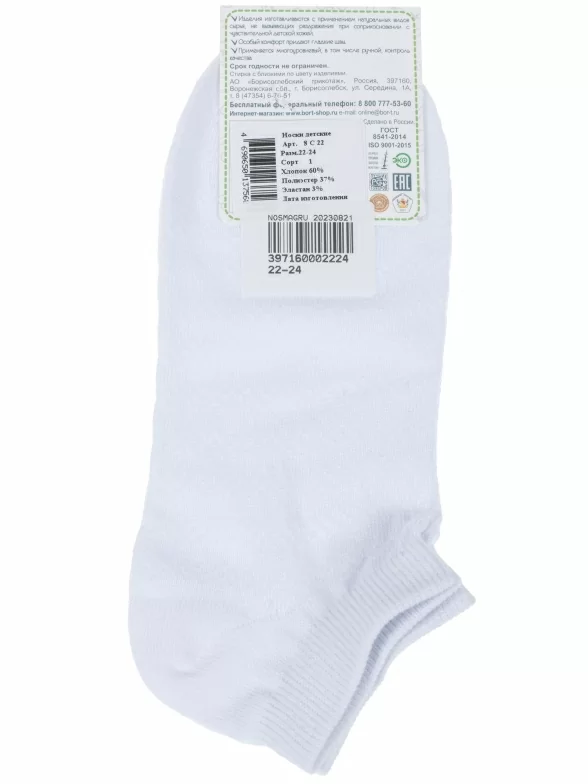Летние ультракороткие детские носки, цвет белый, в сеточку, ажурные, классические, шов обычный (не бесшовные), принт (рисунок): полоски, с узором, однотонный, состав: 60% хлопок, 37% полиэстер, 3% эластан, арт. 8С22. Производитель «АО Борисоглебский трикотаж, Воронежская обл, Россия» под брендом «Борисоглебский трикотаж».