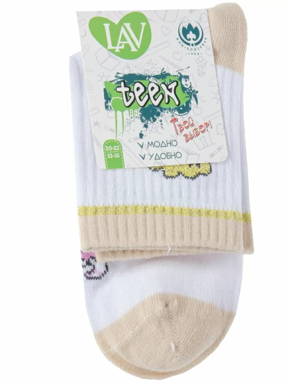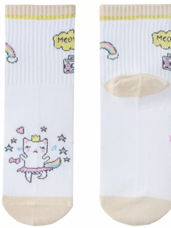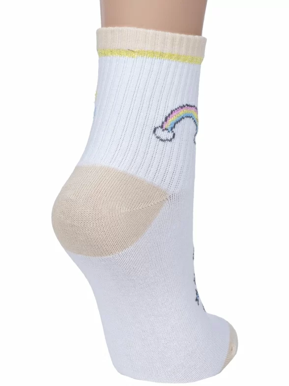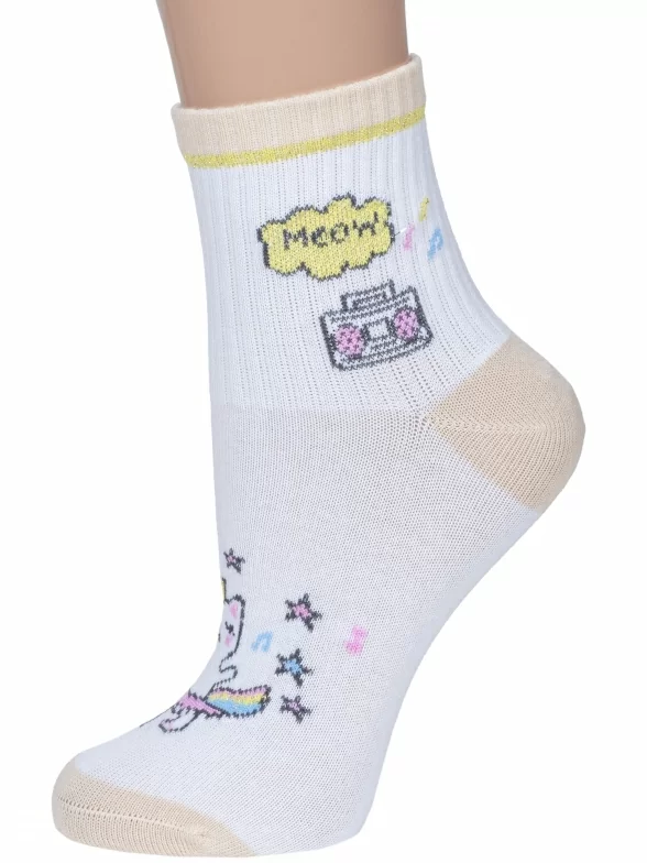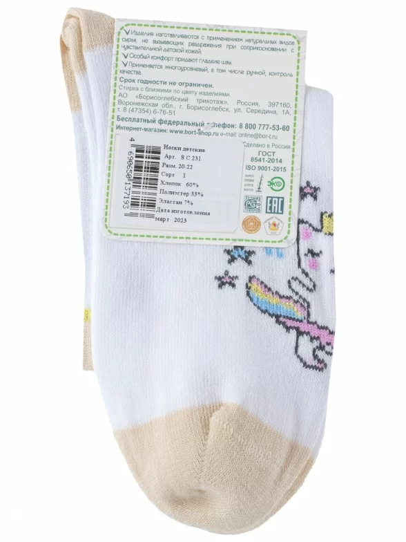 Круглогодичные укороченные детские носки, цвет белый, повседневные, шов кеттельный (бесшовная технология), принт (рисунок): надписи, контрастные пятка / мысок / резинка, животные, блеск люрекса, с узором, состав: 60% хлопок, 33% полиамид, 7% эластан, арт. 8С231. Производитель «АО Борисоглебский трикотаж, Воронежская обл, Россия» под брендом «Борисоглебский трикотаж».