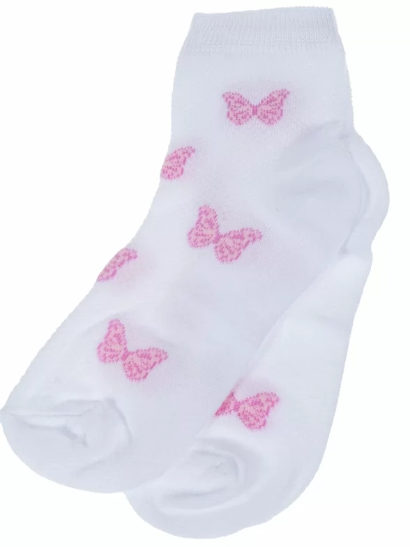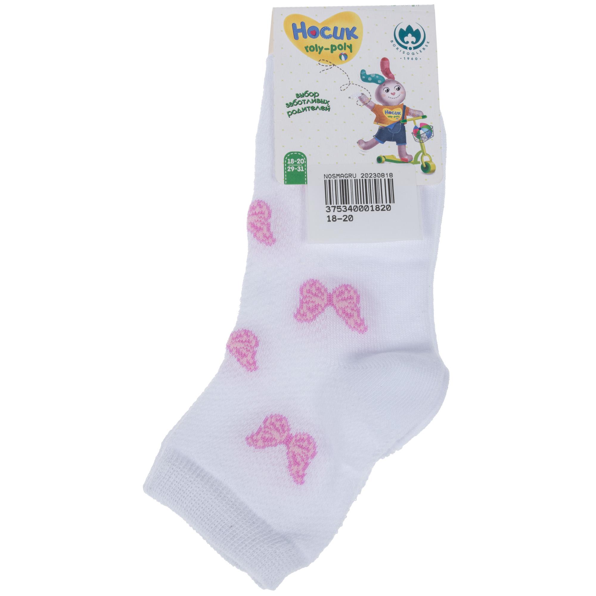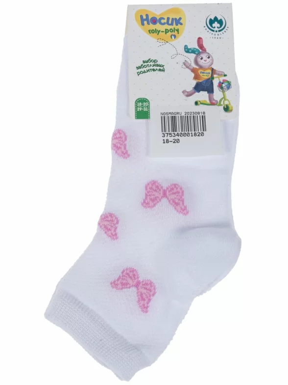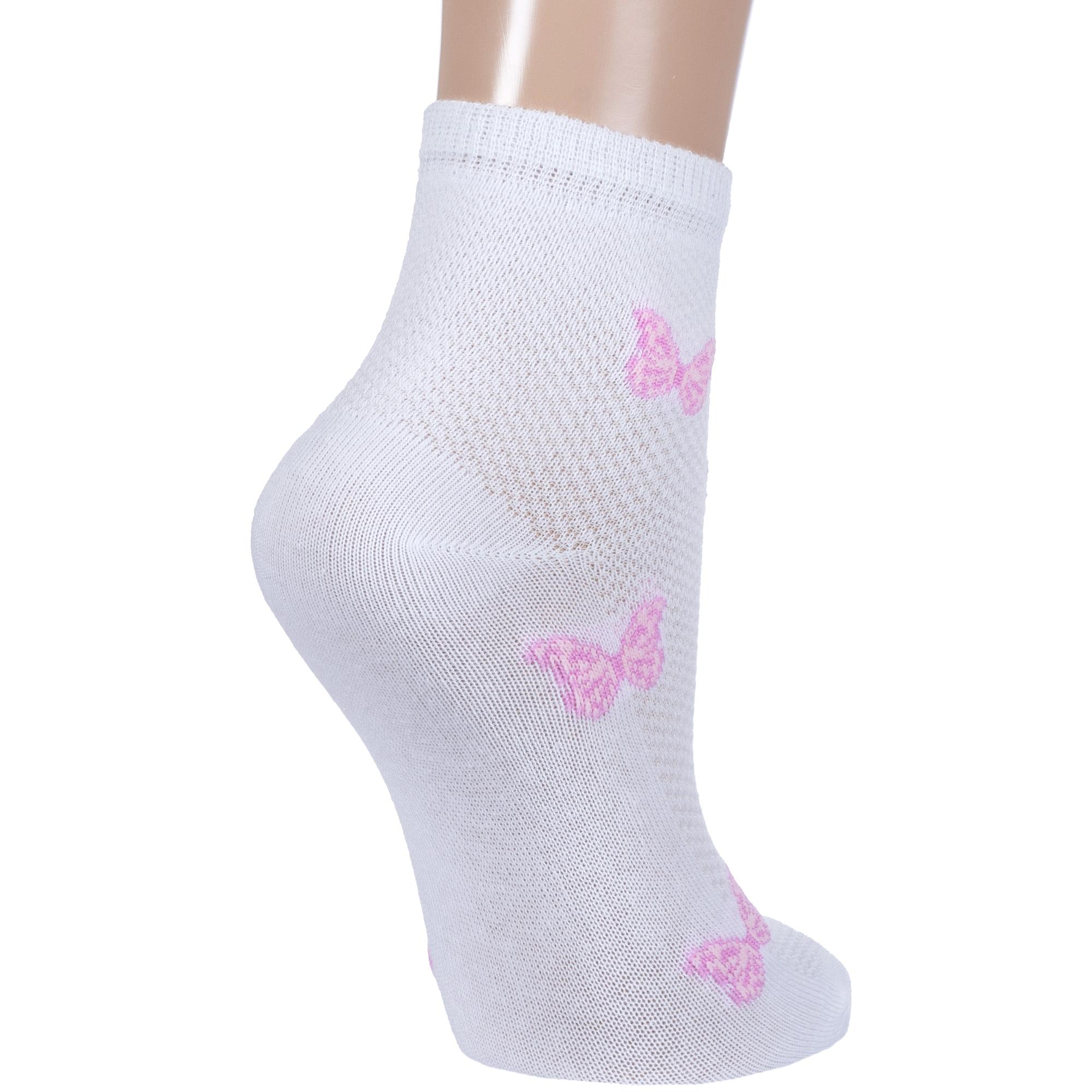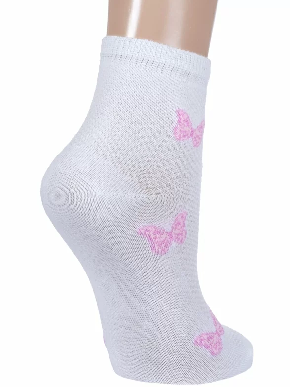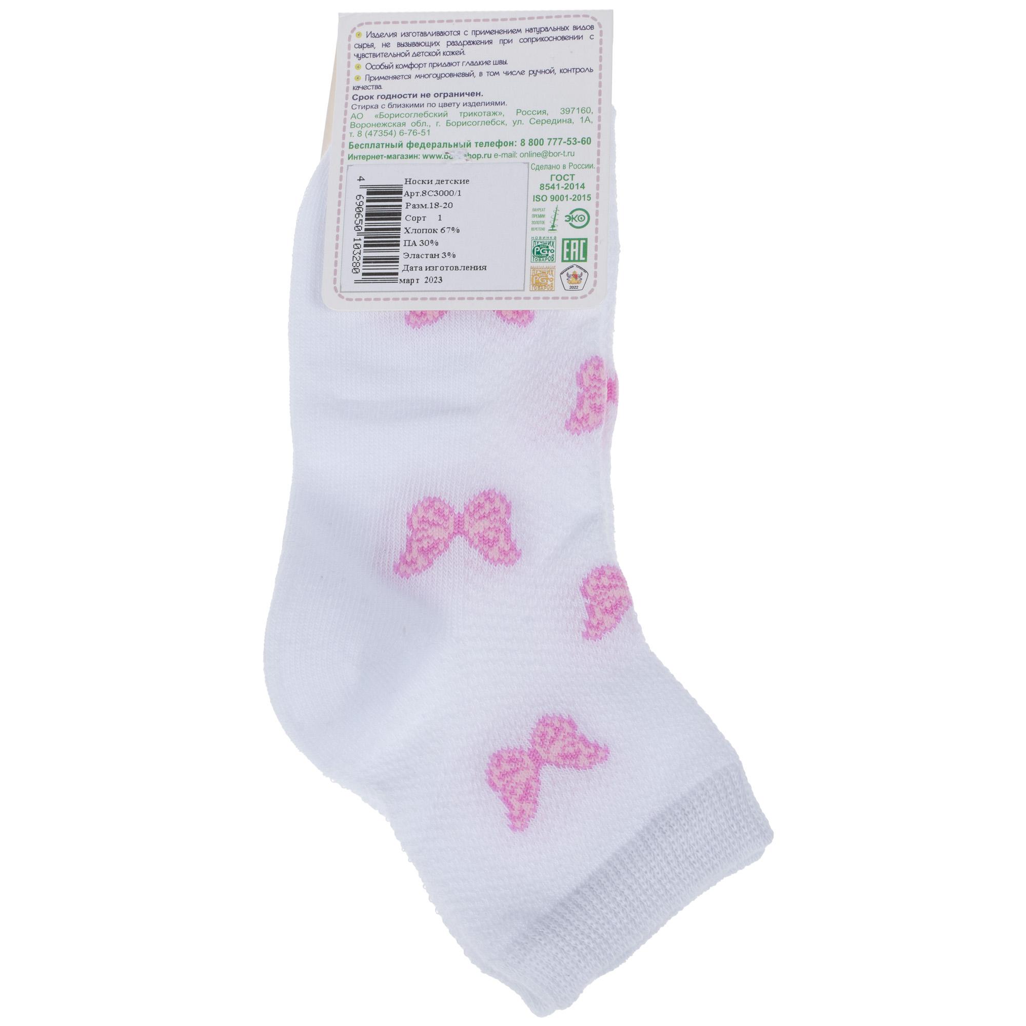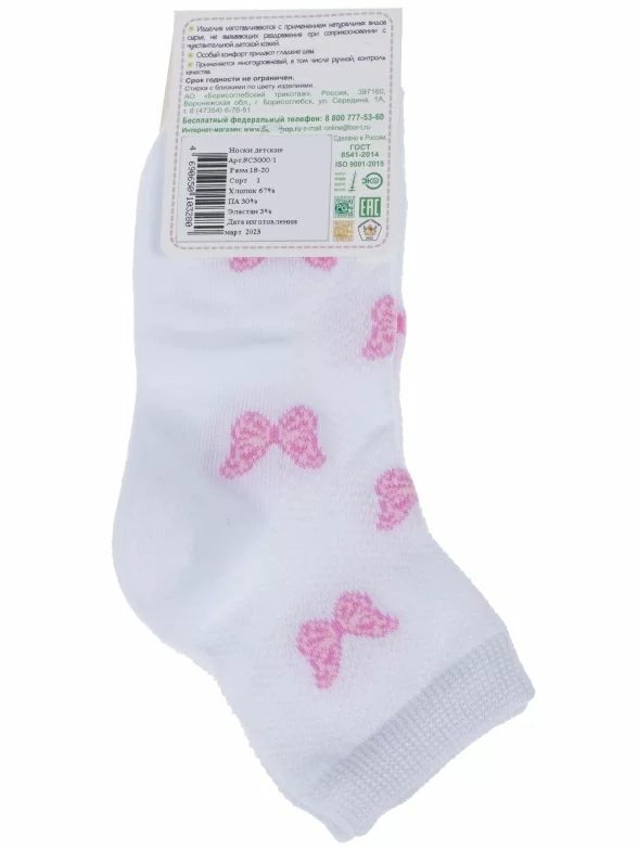 Летние укороченные детские носки, цвет белый, в сеточку, ажурные, повседневные, шов обычный (не бесшовные), принт (рисунок): бабочки / бантики, с узором, состав: 67% хлопок, 30% полиамид, 3% эластан, арт. 8С3000/1. Производитель «АО Борисоглебский трикотаж, Воронежская обл, Россия» под брендом «Борисоглебский трикотаж».