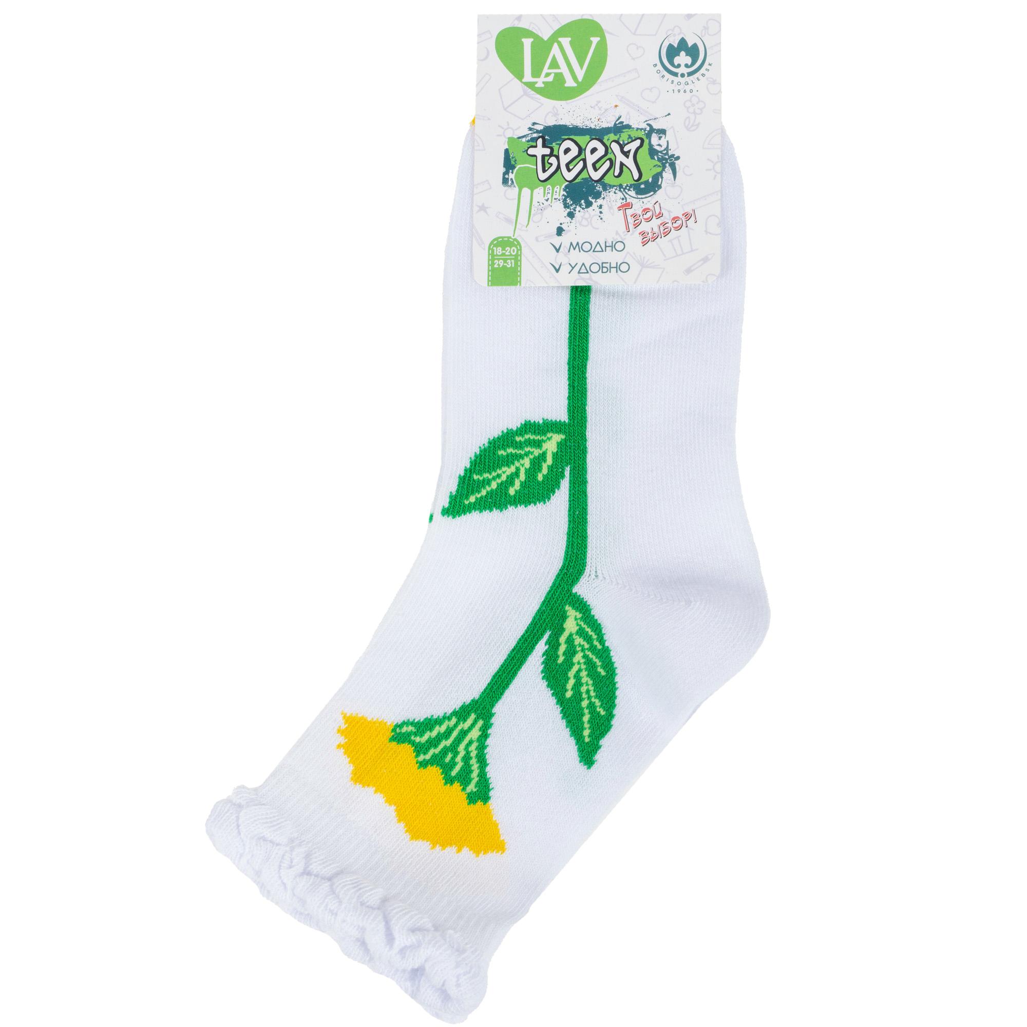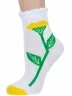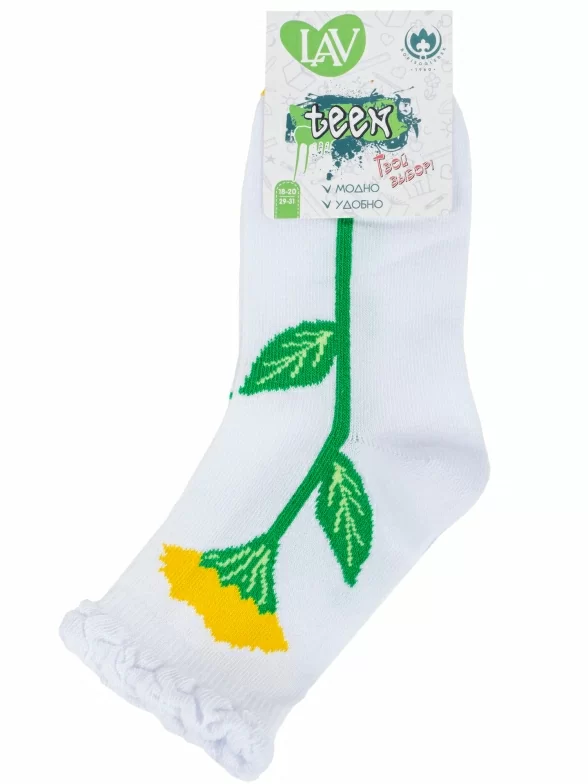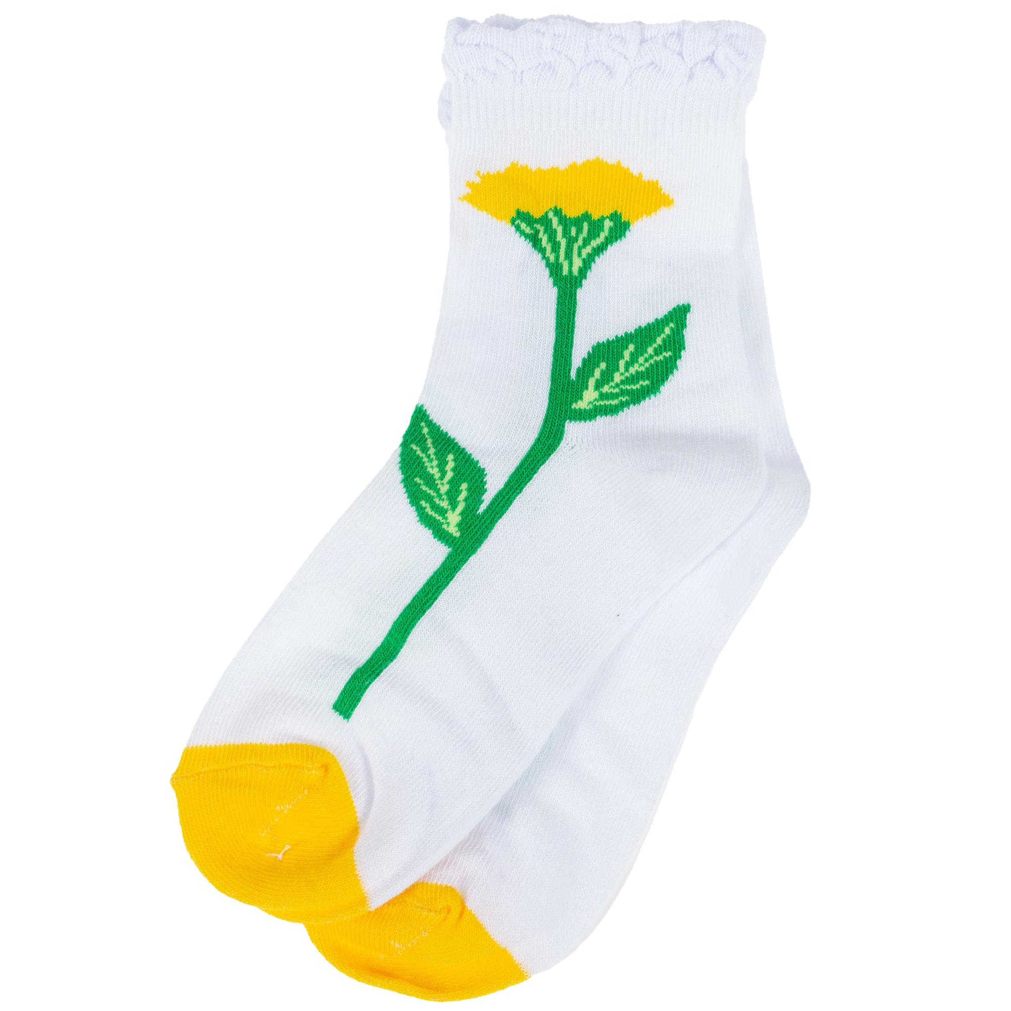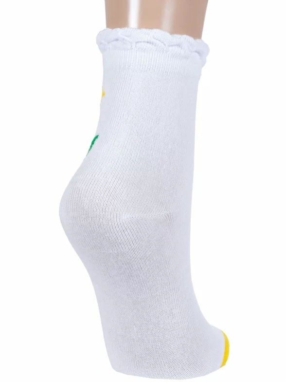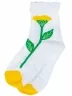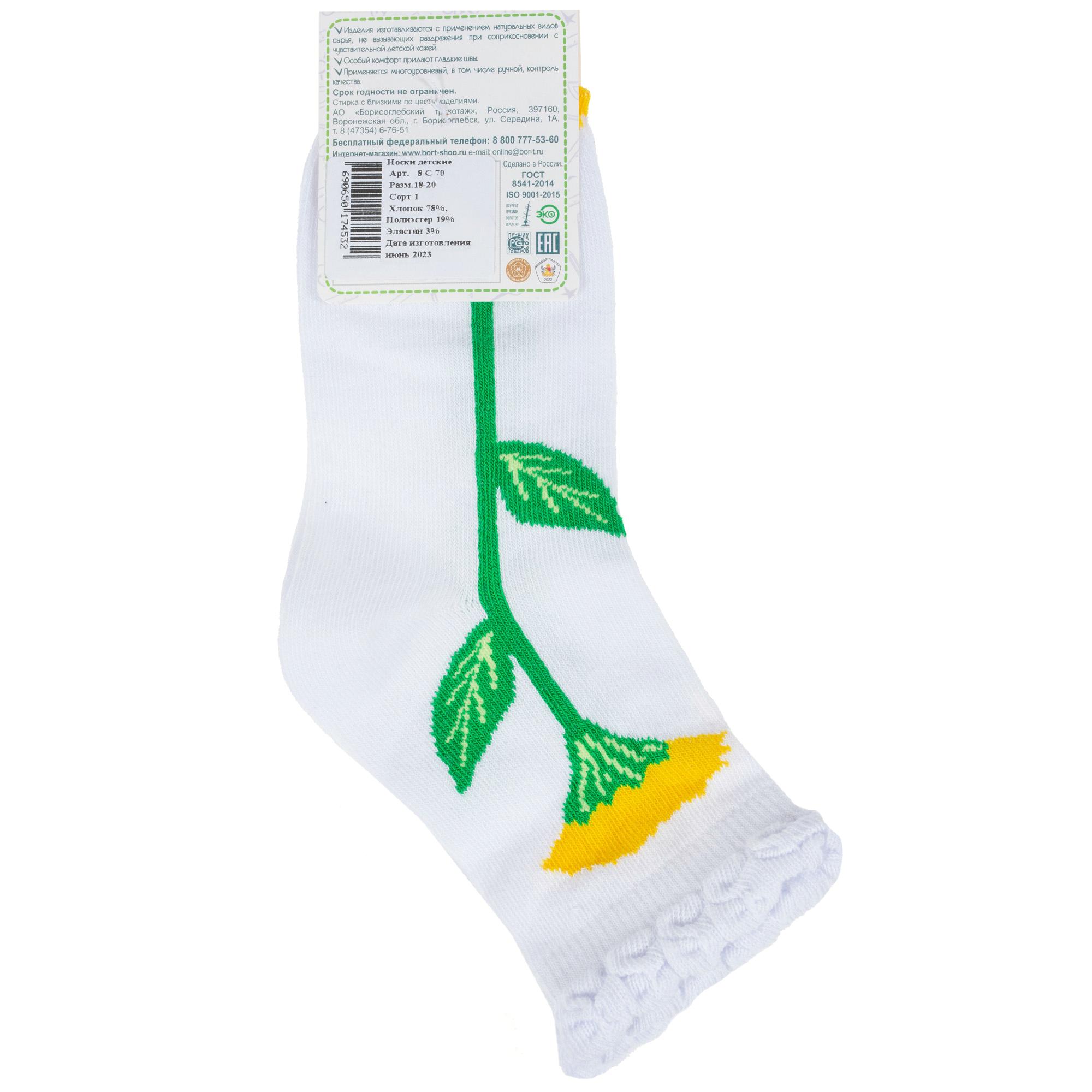 Круглогодичные укороченные детские носки, цвет белый, с отворотом, повседневные, шов обычный (не бесшовные), принт (рисунок): цветы / растения, контрастные пятка / мысок / резинка, с узором, состав: 78% хлопок, 19% полиэстер, 3% эластан, арт. 8С70. Производитель «АО Борисоглебский трикотаж, Воронежская обл, Россия» под брендом «Борисоглебский трикотаж».