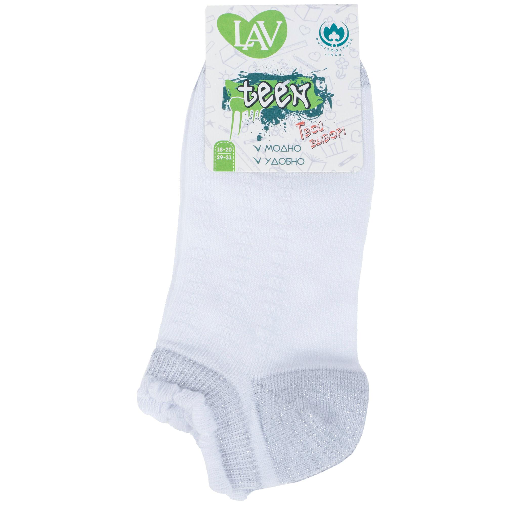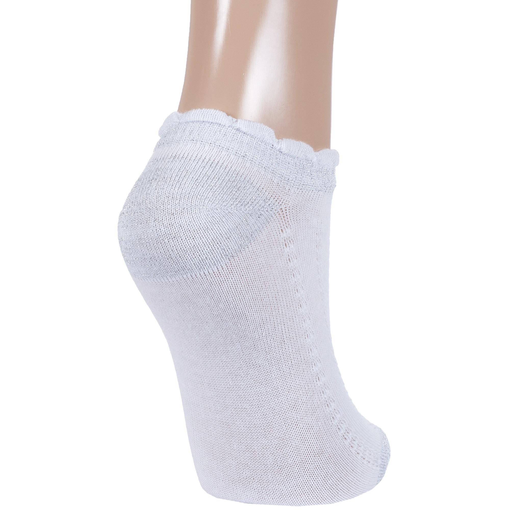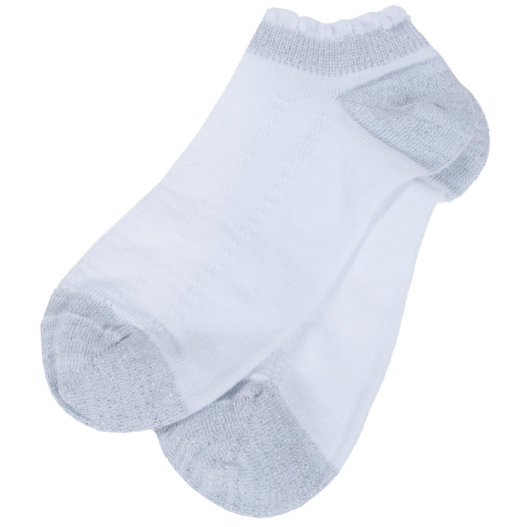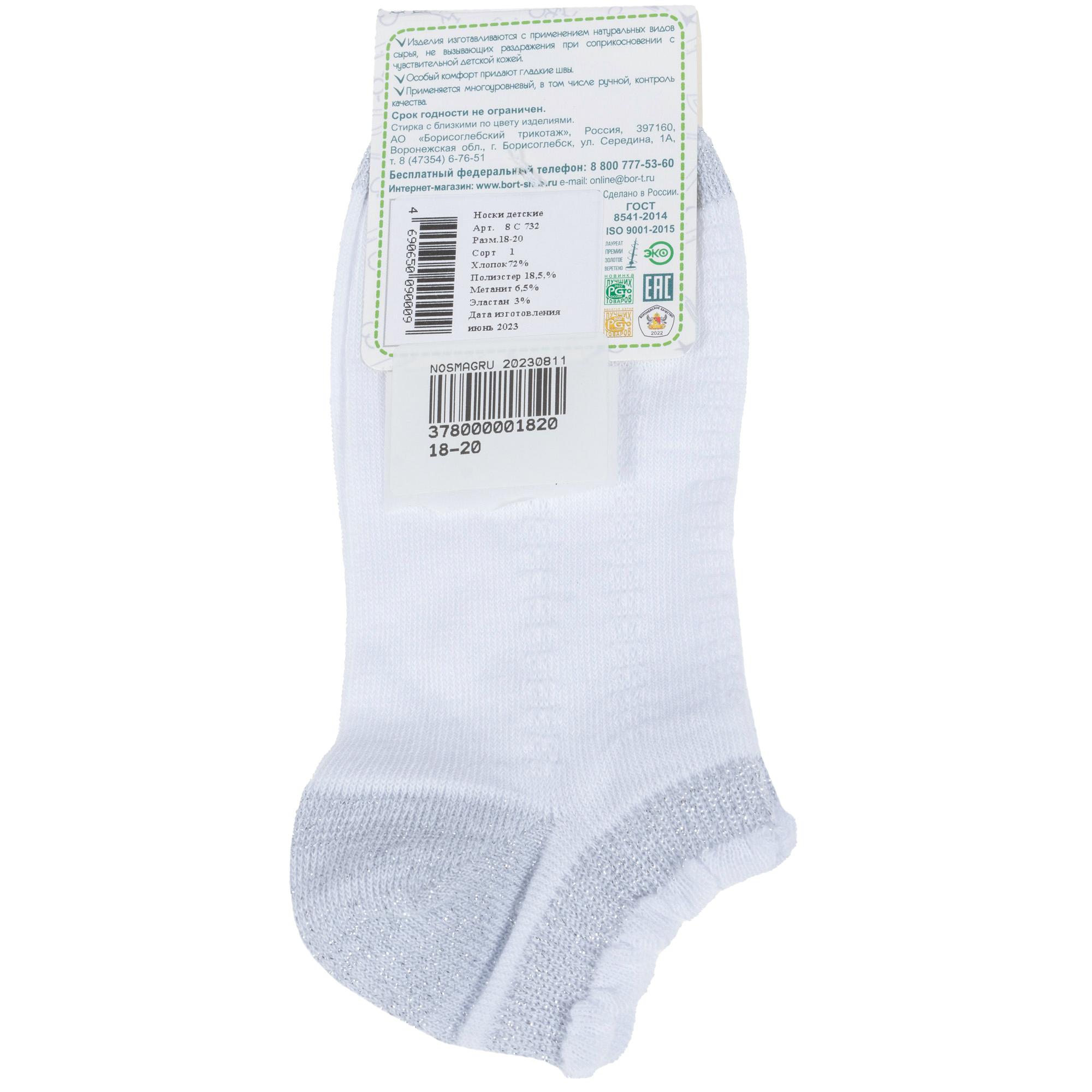 Летние ультракороткие детские носки, цвет белый, в сеточку, классические, шов кеттельный (бесшовная технология), принт (рисунок): контрастные пятка / мысок / резинка, блеск люрекса, однотонный, состав: 72% хлопок, 18.5% полиэстер, 6.5% метанит, 3% эластан, арт. 8С732. Производитель «АО Борисоглебский трикотаж, Воронежская обл, Россия» под брендом «Борисоглебский трикотаж».