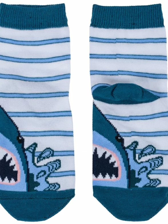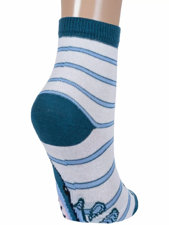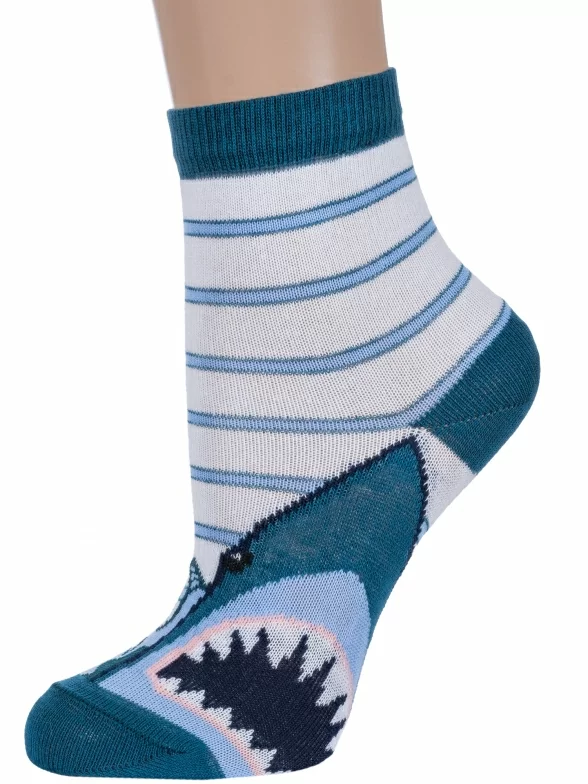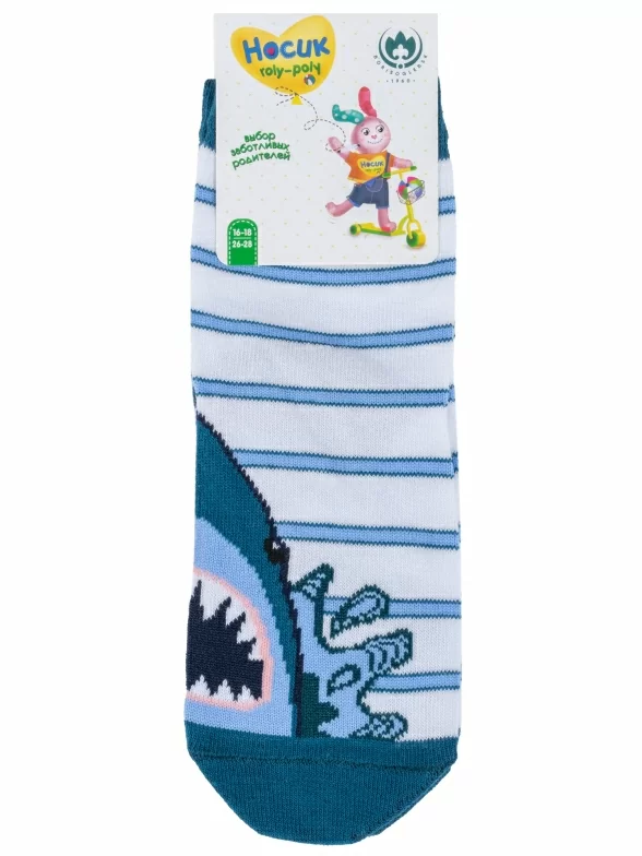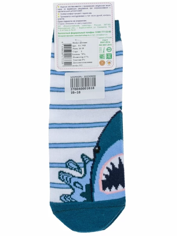 Круглогодичные укороченные детские носки, цвет белый, повседневные, шов обычный (не бесшовные), принт (рисунок): полоски, море, контрастные пятка / мысок / резинка, животные, с узором, состав: 70% хлопок, 27% полиэстер, 3% эластан, арт. 8С918. Производитель «АО Борисоглебский трикотаж, Воронежская обл, Россия» под брендом «Борисоглебский трикотаж».