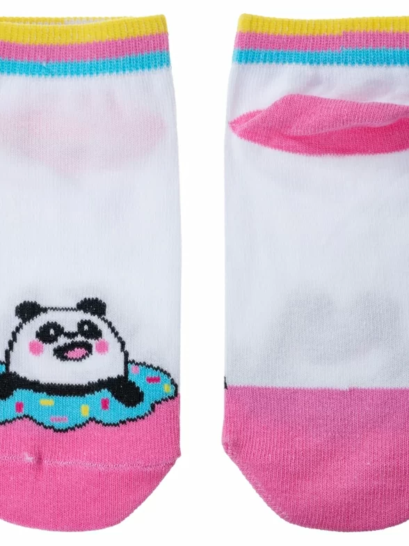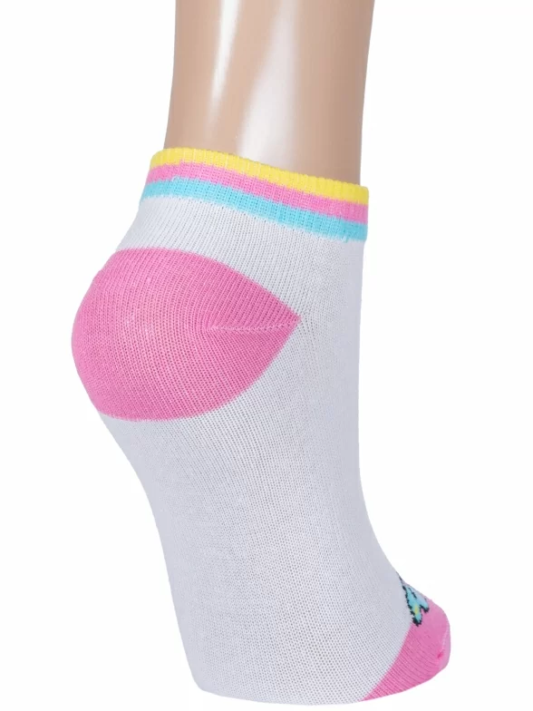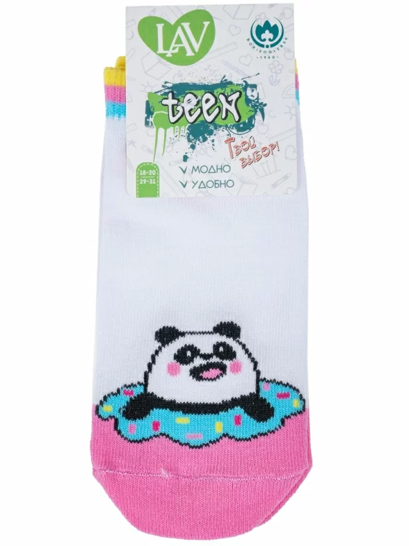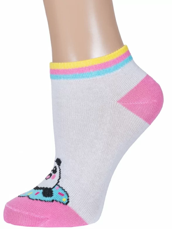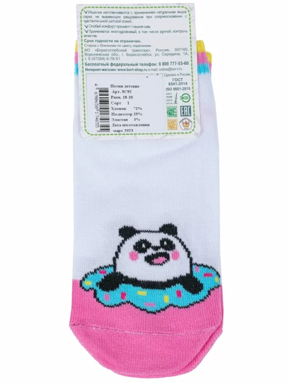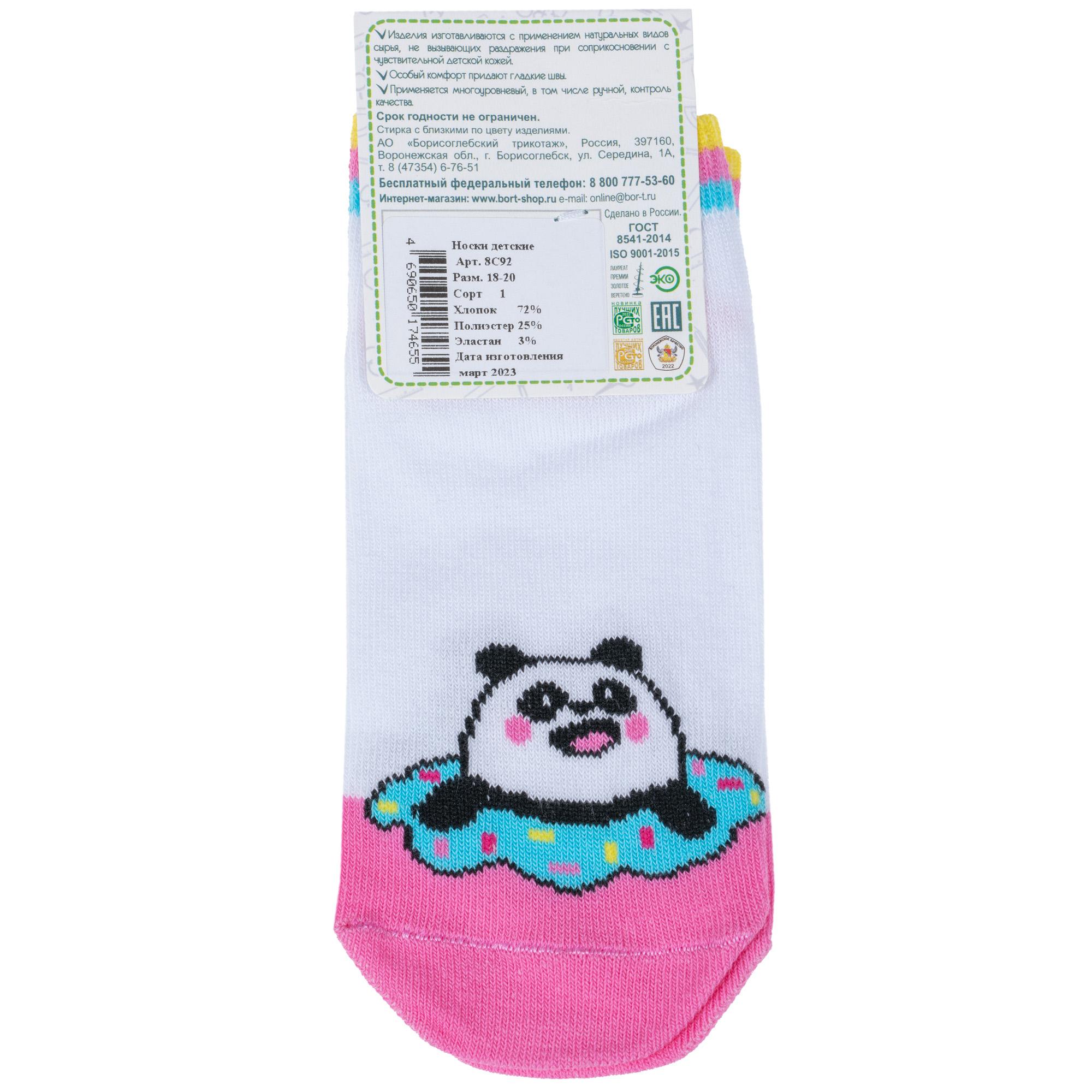 Круглогодичные короткие детские носки, цвет белый, повседневные, шов обычный (не бесшовные), принт (рисунок): контрастные пятка / мысок / резинка, животные, с узором, состав: 72% хлопок, 25% полиэстер, 3% эластан, арт. 8С92. Производитель «АО Борисоглебский трикотаж, Воронежская обл, Россия» под брендом «Борисоглебский трикотаж».