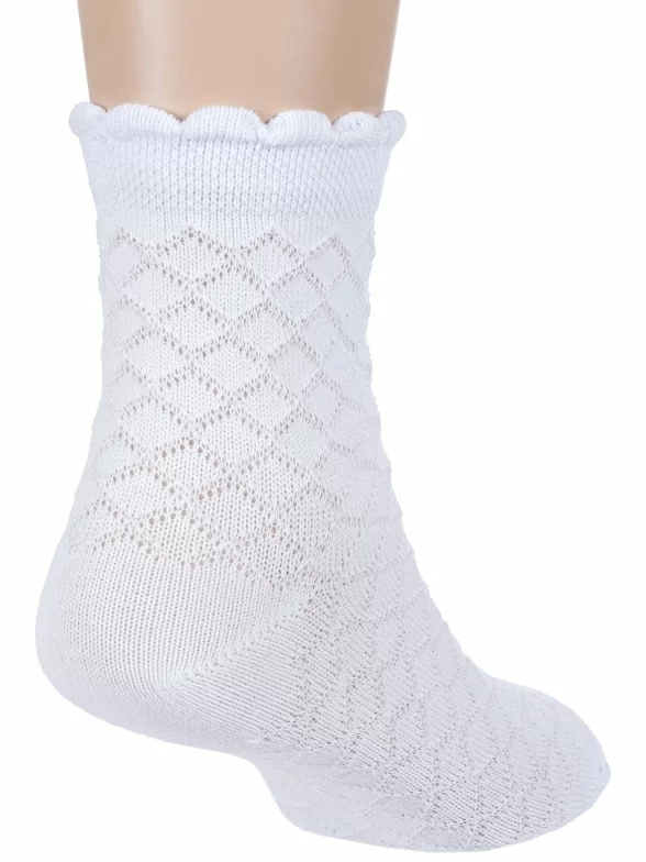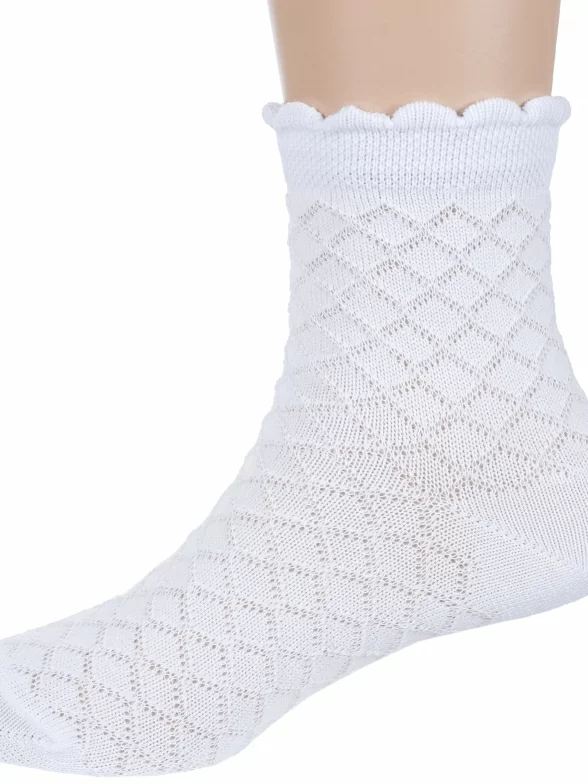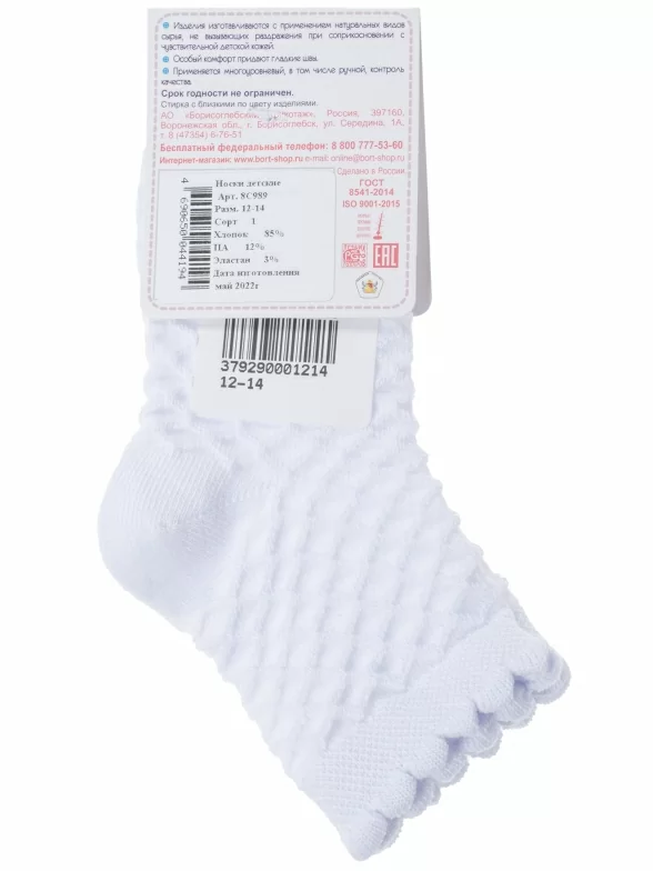 Летние укороченные детские носки, цвет белый, ажурные, классические, шов обычный (не бесшовные), принт (рисунок): клетка, геометрия, с узором, однотонный, состав: 85% хлопок, 12% полиамид, 3% эластан, арт. 8С989. Производитель «АО Борисоглебский трикотаж, Воронежская обл, Россия» под брендом «Борисоглебский трикотаж».