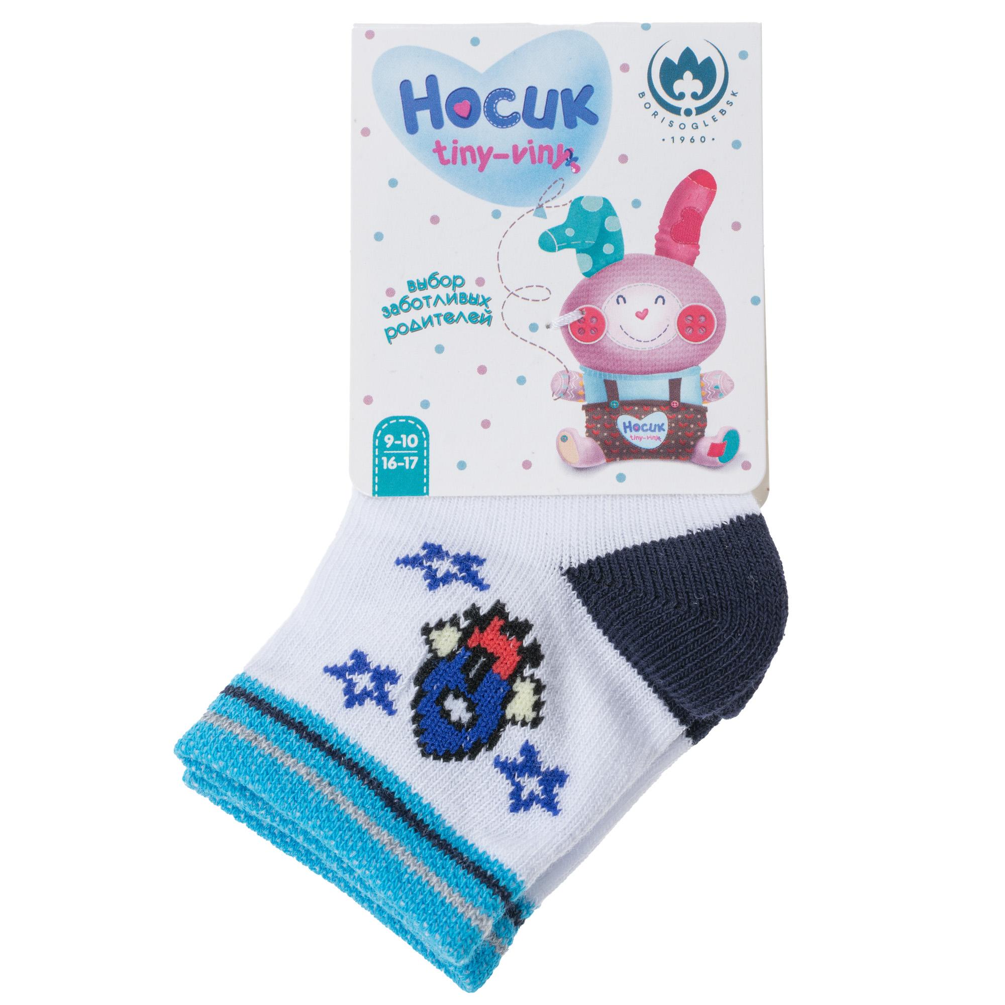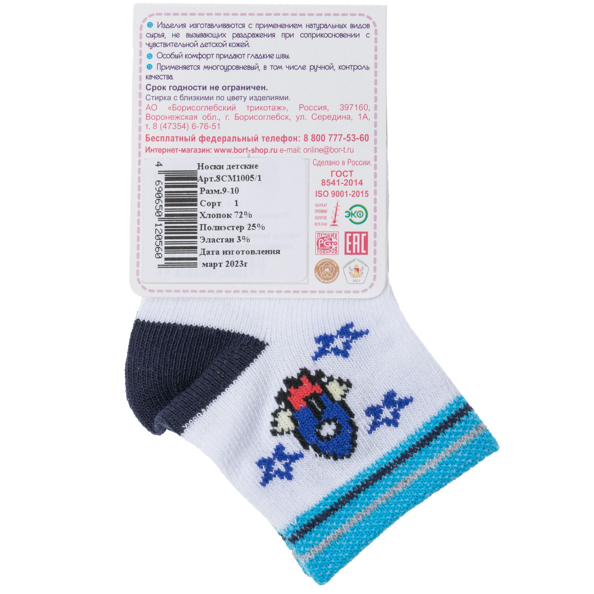 Круглогодичные укороченные детские носки, цвет белый, повседневные, шов обычный (не бесшовные), принт (рисунок): транспорт, космос, контрастные пятка / мысок / резинка, звезды / небо, с узором, состав: 72% хлопок, 25% полиэстер, 3% эластан, арт. 8СМ1005/1. Производитель «АО Борисоглебский трикотаж, Воронежская обл, Россия» под брендом «Борисоглебский трикотаж».