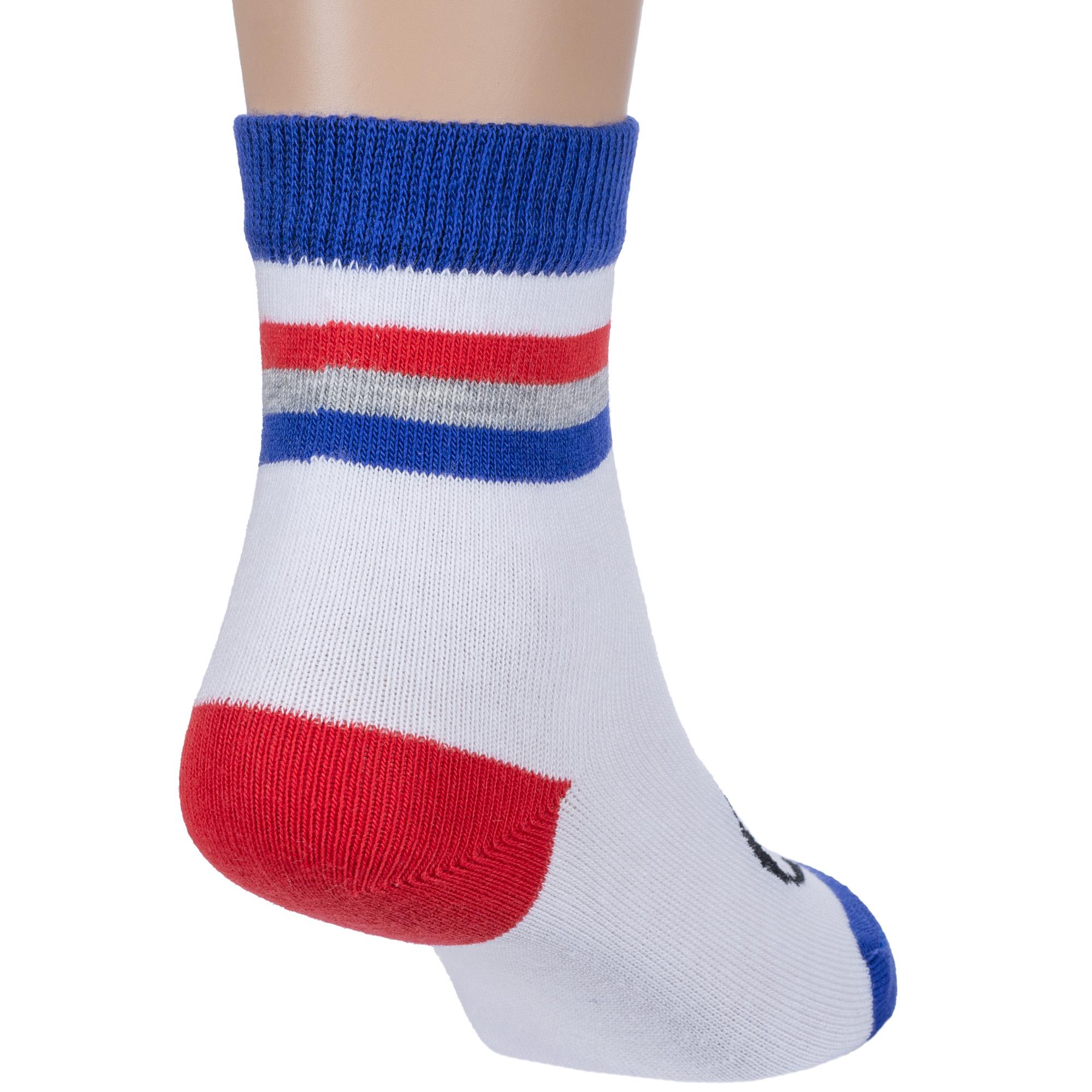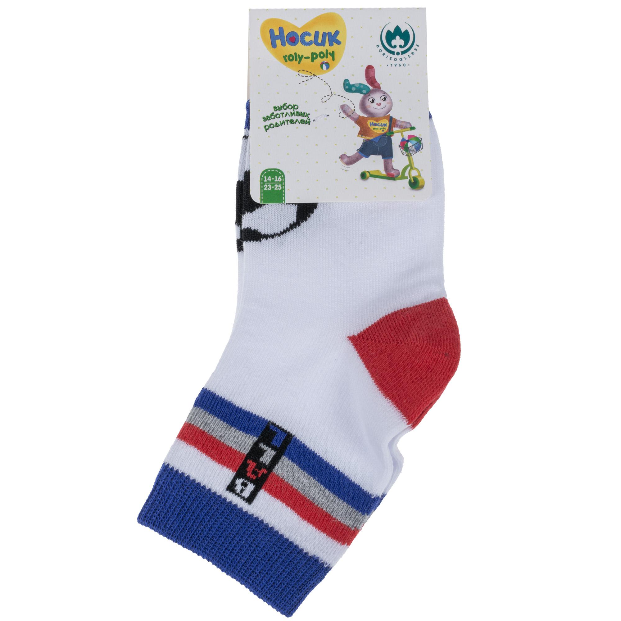 Круглогодичные укороченные детские носки, цвет белый, повседневные, шов обычный (не бесшовные), принт (рисунок): спортивные, надписи, контрастные пятка / мысок / резинка, игры, с узором, состав: 65% хлопок, 32% полиэстер, 3% эластан, арт. 8СМ1007. Производитель «АО Борисоглебский трикотаж, Воронежская обл, Россия» под брендом «Борисоглебский трикотаж».