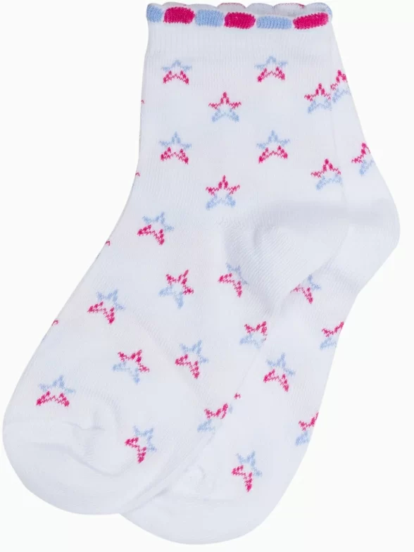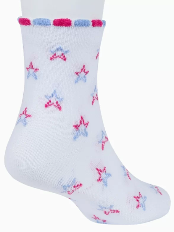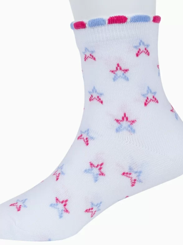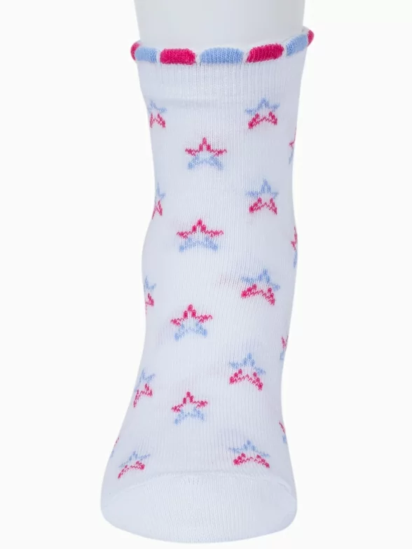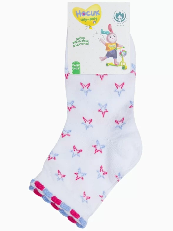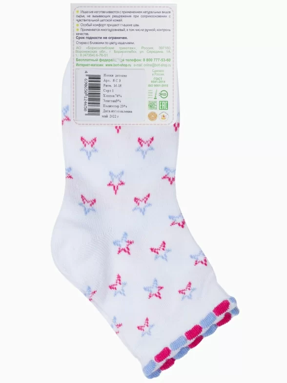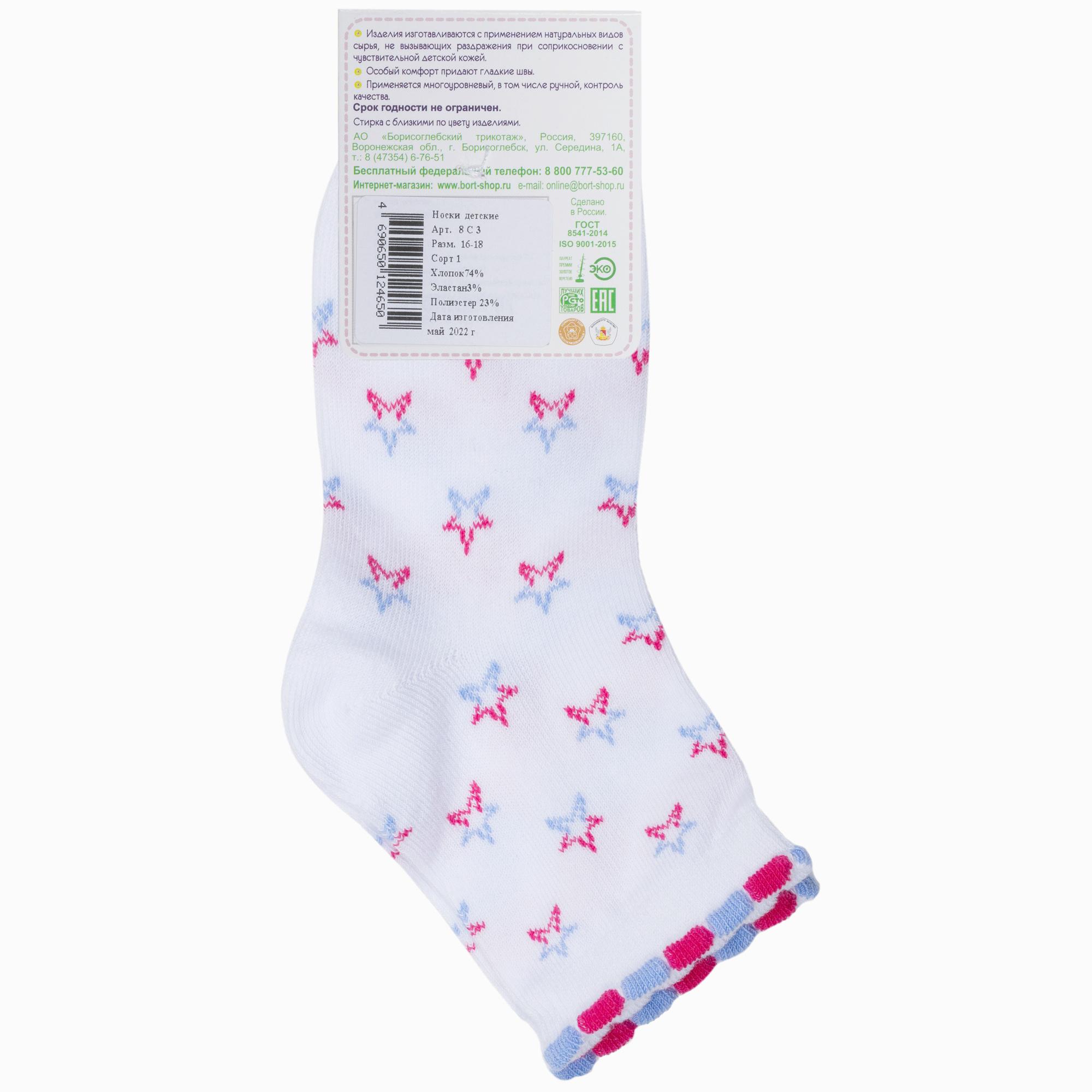 Круглогодичные укороченные детские носки, цвет белый, повседневные, шов обычный (не бесшовные), принт (рисунок): с узором, звезды / небо, состав: 72% хлопок, 25% полиэстер, 3% эластан, арт. 8С3. Производитель «АО Борисоглебский трикотаж, Воронежская обл, Россия» под брендом «Борисоглебский трикотаж».