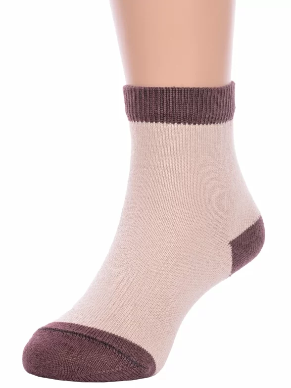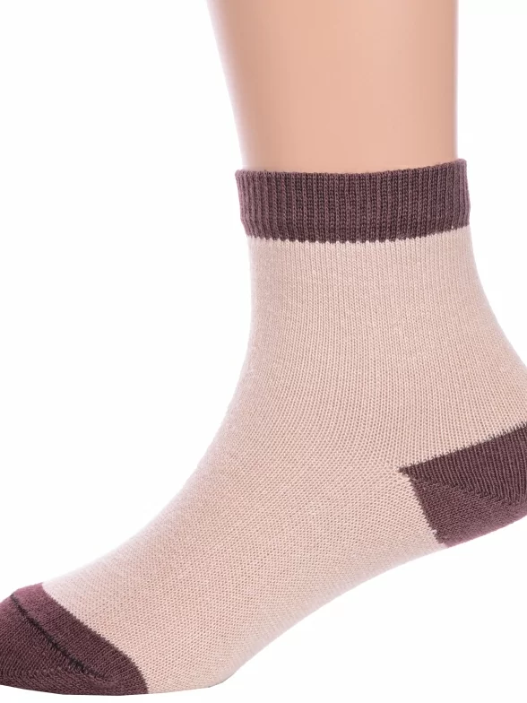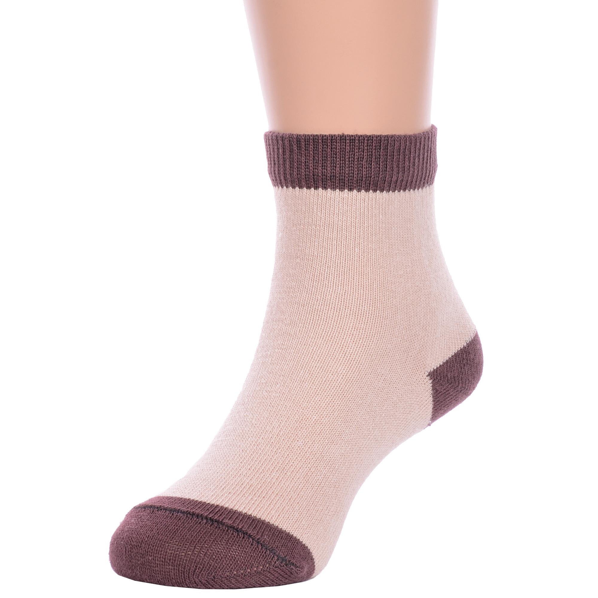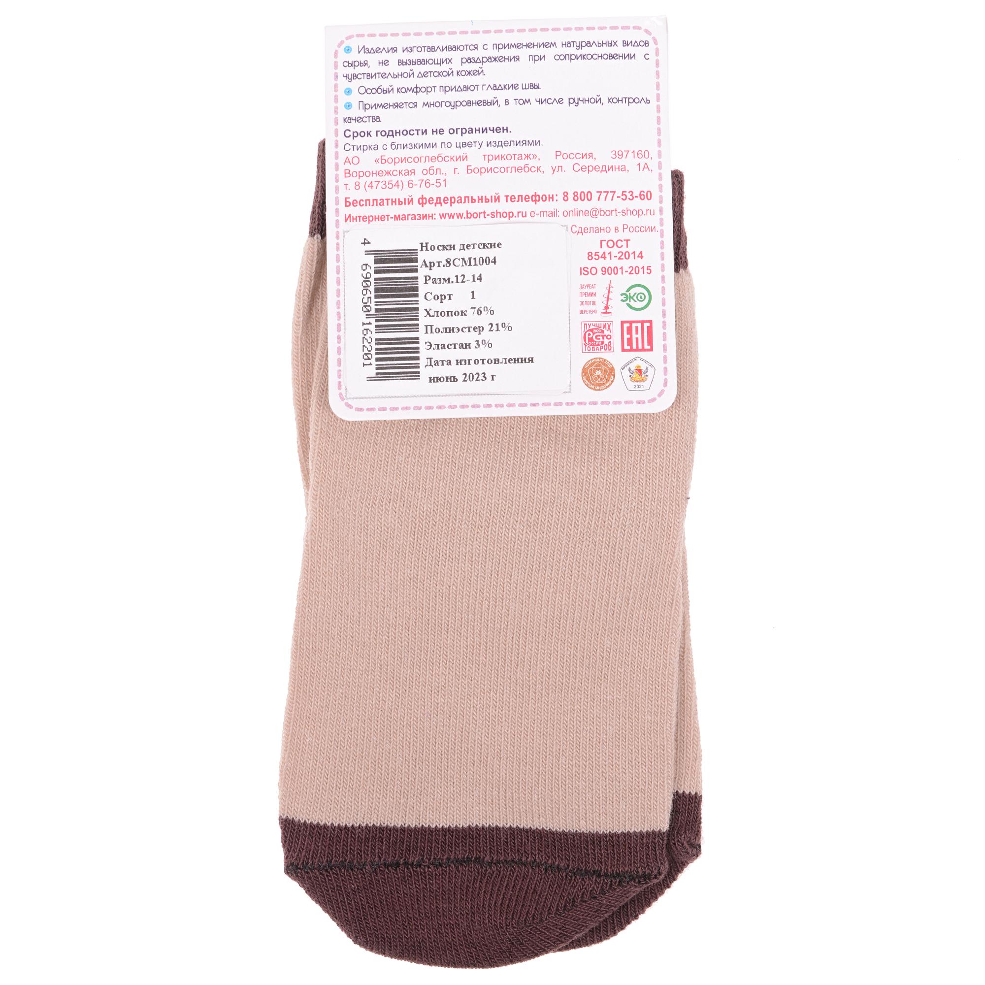 Круглогодичные укороченные детские носки, цвет бежевый, повседневные, шов обычный (не бесшовные), принт (рисунок): контрастные пятка / мысок / резинка, без рисунков/узоров, состав: 76% хлопок, 21% полиэстер, 3% эластан, арт. 8СМ1004. Производитель «АО Борисоглебский трикотаж, Воронежская обл, Россия» под брендом «Борисоглебский трикотаж».