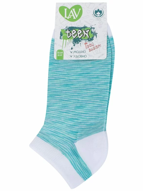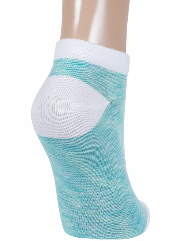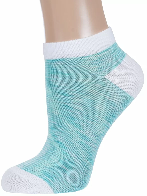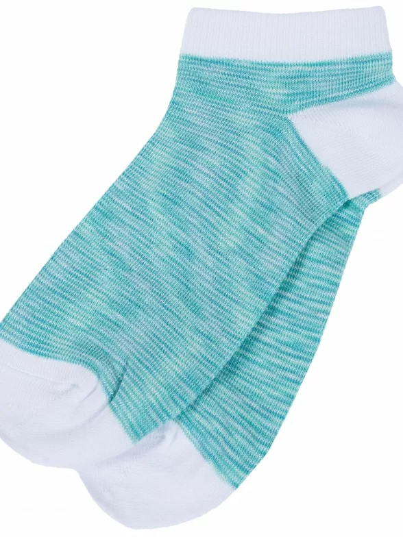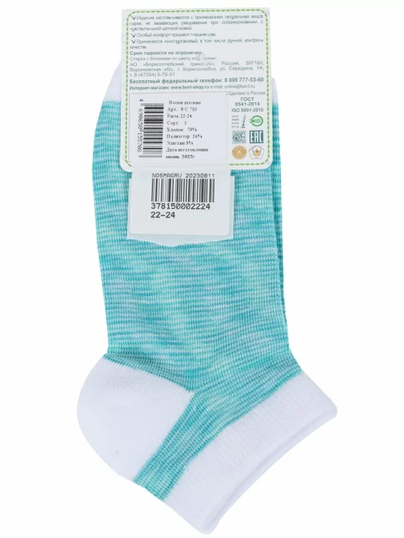 Летние короткие детские носки, цвет бирюзовый, классические, шов обычный (не бесшовные), принт (рисунок): полоски, мелкий принт, контрастные пятка / мысок / резинка, состав: 73% хлопок, 24% полиэстер, 3% эластан, арт. 8С710. Производитель «АО Борисоглебский трикотаж, Воронежская обл, Россия» под брендом «Борисоглебский трикотаж».