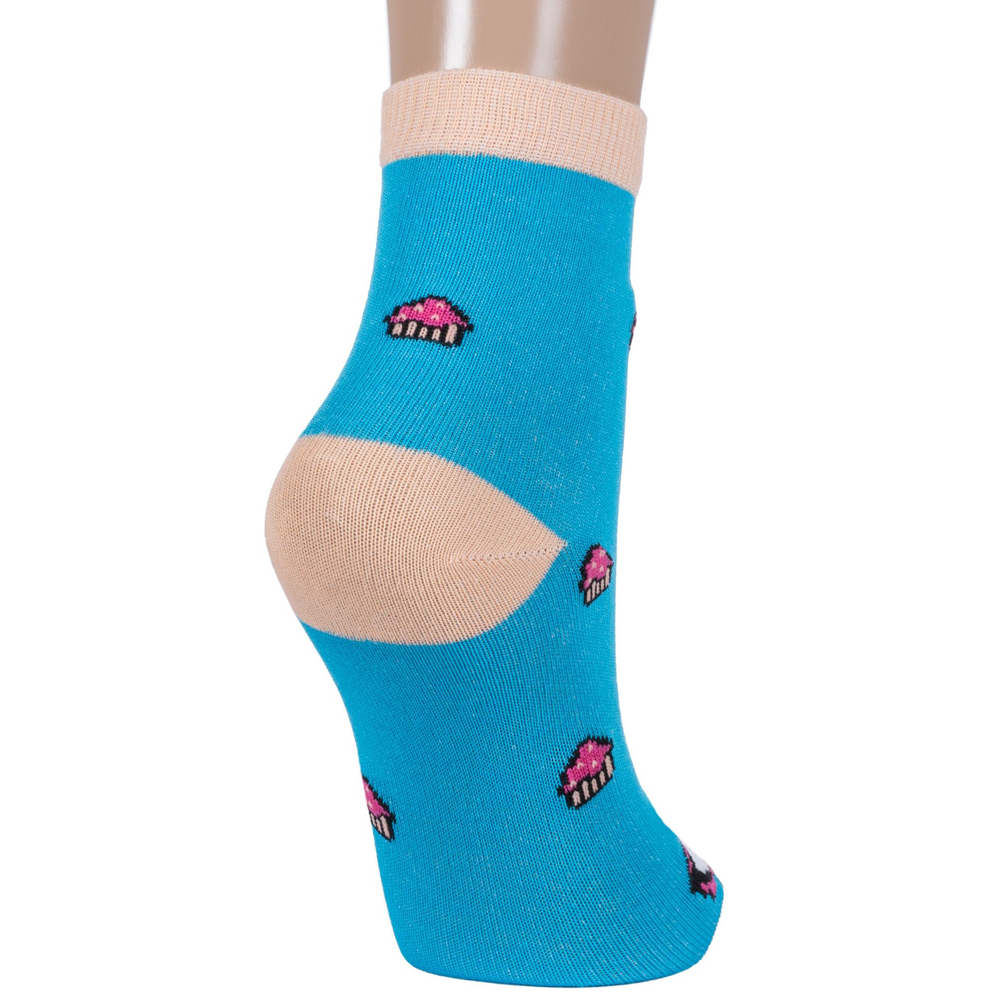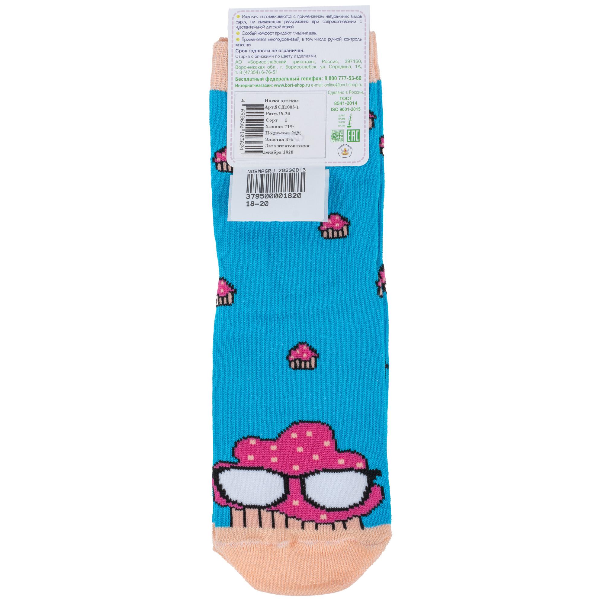 Круглогодичные укороченные детские носки, цвет бирюзовый, повседневные, шов обычный (не бесшовные), принт (рисунок): контрастные пятка / мысок / резинка, еда и напитки, с узором, состав: 71% хлопок, 26% полиэстер, 3% эластан, арт. 8СД1003/1. Производитель «АО Борисоглебский трикотаж, Воронежская обл, Россия» под брендом «Борисоглебский трикотаж».