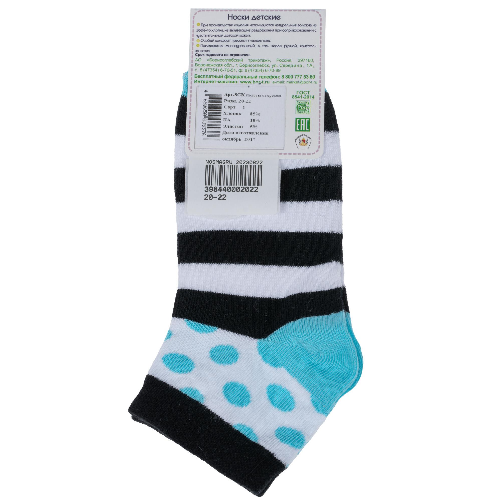 Межсезонные или летние короткие детские носки, цвет многоцветные (мультиколор), повседневные, шов обычный (не бесшовные), принт (рисунок): полоски, контрастные пятка / мысок / резинка, горох / точка, с узором, состав: 85% хлопок, 10% полиамид, 5% эластан, арт. 8СК. Производитель «АО Борисоглебский трикотаж, Воронежская обл, Россия» под брендом «Борисоглебский трикотаж».
