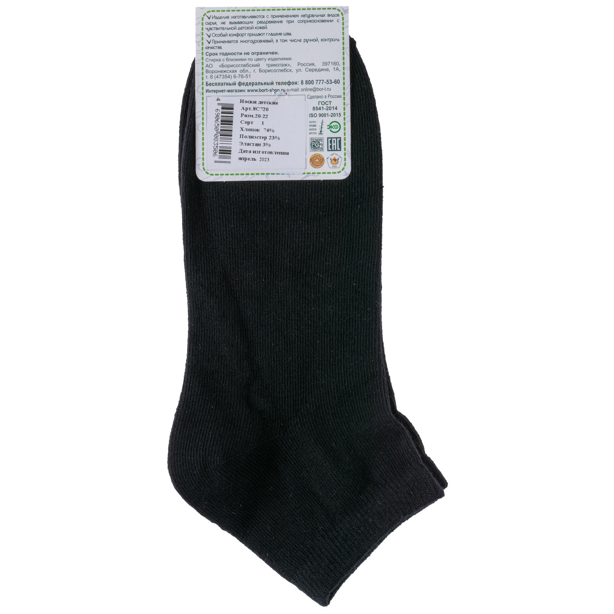 Круглогодичные короткие детские носки, цвет черный, классические, шов обычный (не бесшовные), принт (рисунок): однотонный, без рисунков/узоров, состав: 74% хлопок, 23% полиэстер, 3% эластан, арт. 8С720. Производитель «АО Борисоглебский трикотаж, Воронежская обл, Россия» под брендом «Борисоглебский трикотаж».