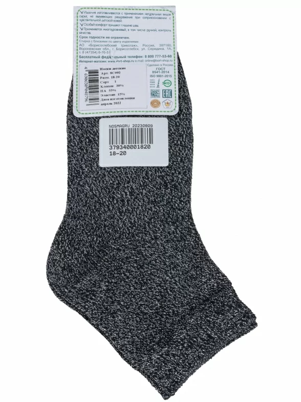 Круглогодичные укороченные детские носки, цвет черный, классические, состав: 30% хлопок, 55% полиамид, 15% эластан, арт. 8С992. Производитель «АО Борисоглебский трикотаж, Воронежская обл, Россия» под брендом «Борисоглебский трикотаж».
