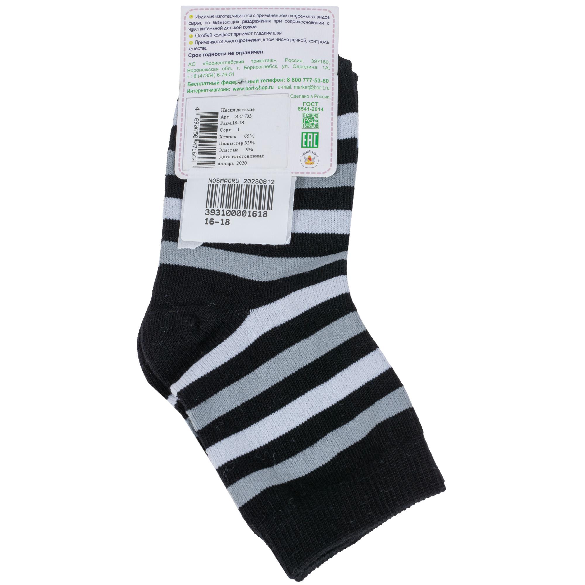 Круглогодичные укороченные детские носки, цвет черный, классические, шов обычный (не бесшовные), принт (рисунок): полоски, с узором, состав: 65% хлопок, 32% полиэстер, 3% эластан, арт. 8С703. Производитель «АО Борисоглебский трикотаж, Воронежская обл, Россия» под брендом «Борисоглебский трикотаж».