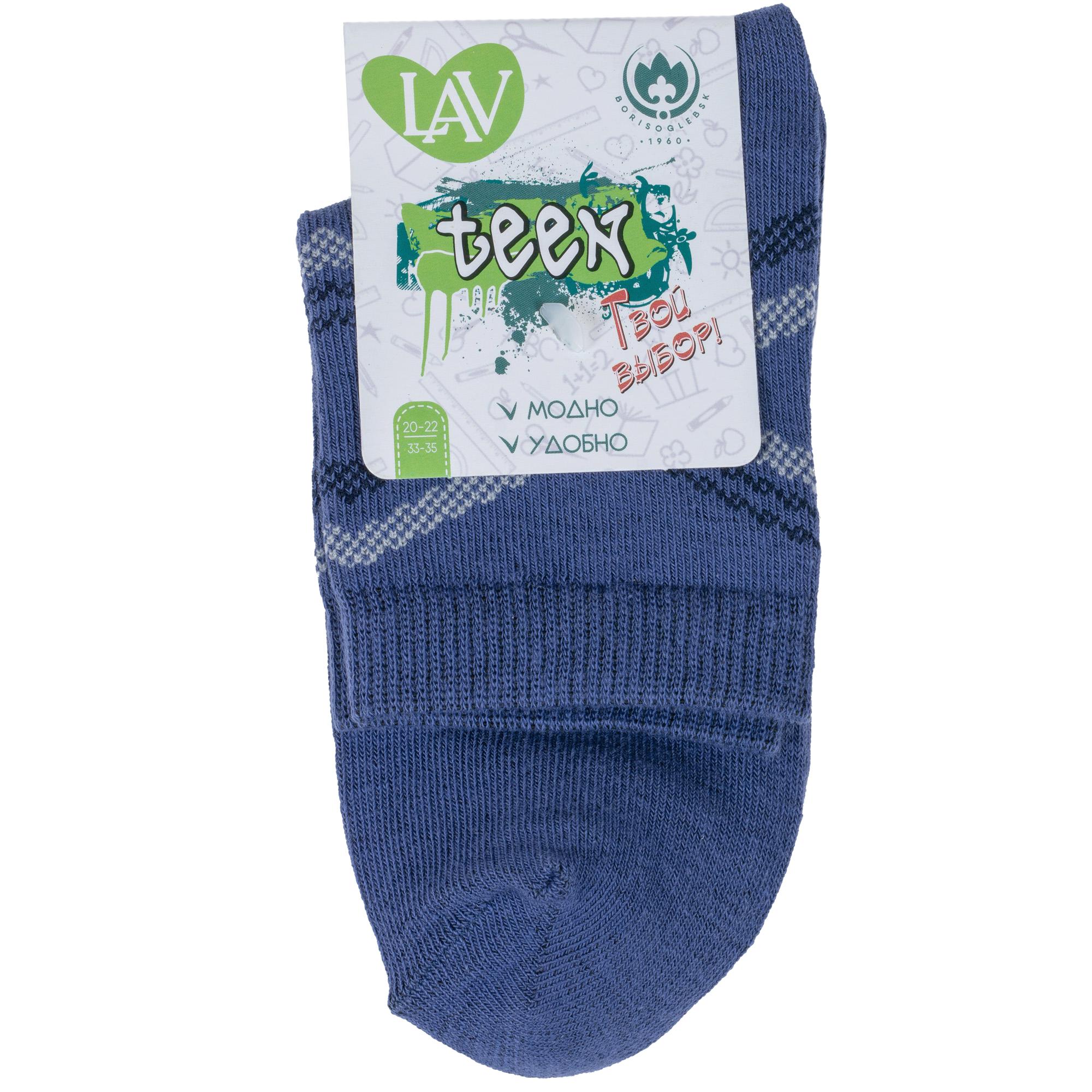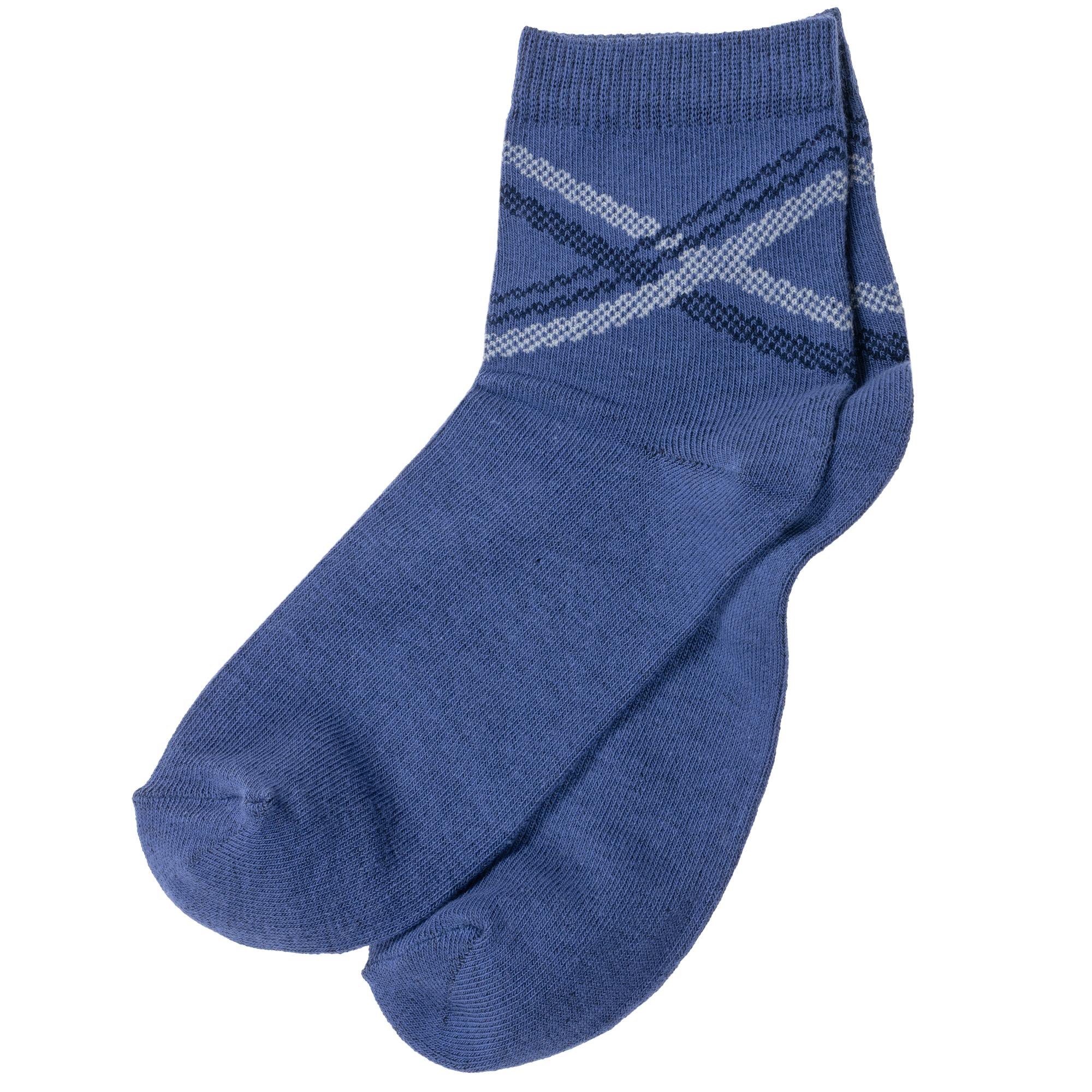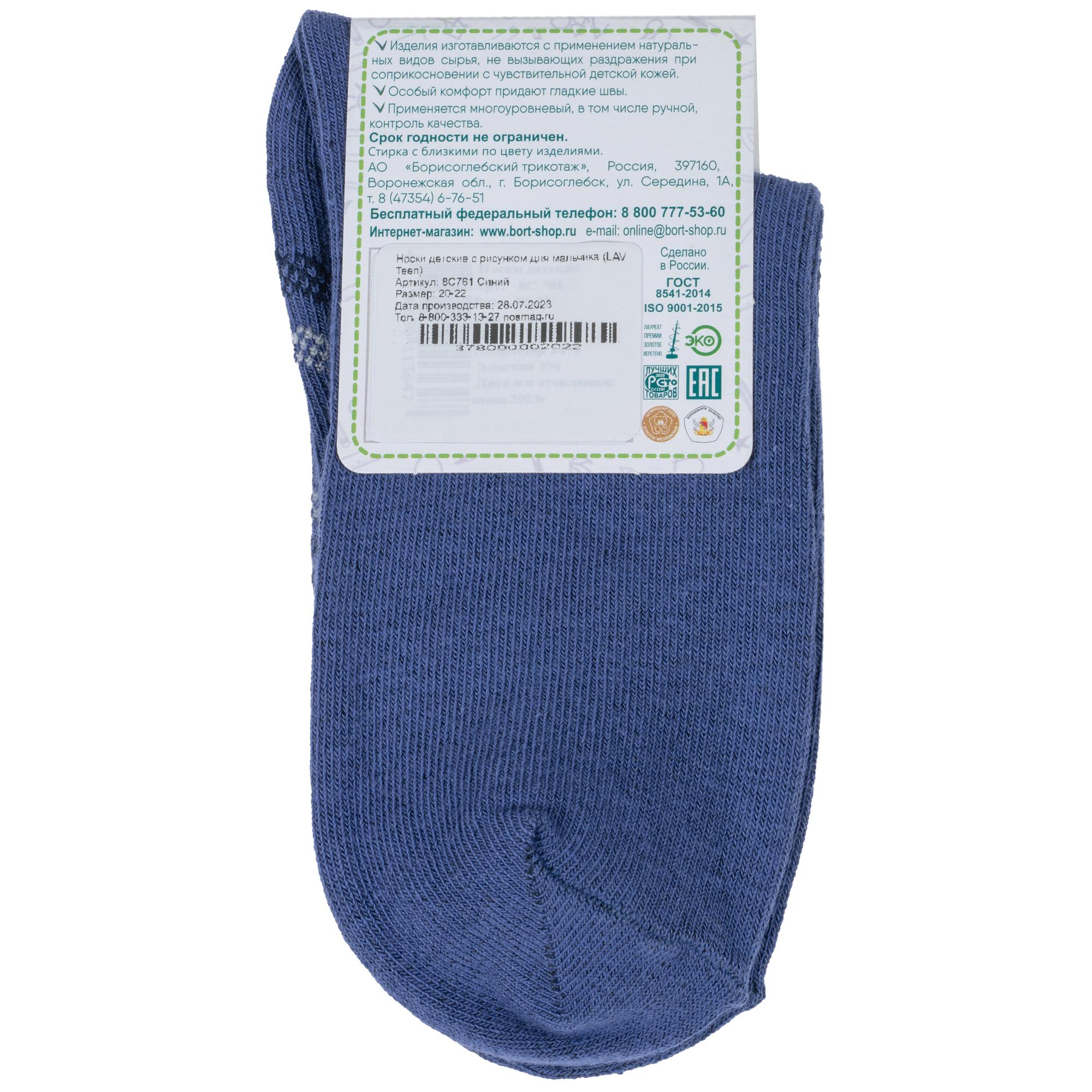 Круглогодичные укороченные детские носки, цвет синий, классические, шов обычный (не бесшовные), принт (рисунок): полоски, абстрактный, с узором, состав: 73% хлопок, 24% полиэстер, 3% эластан, арт. 8С761. Производитель «АО Борисоглебский трикотаж, Воронежская обл, Россия» под брендом «Борисоглебский трикотаж».