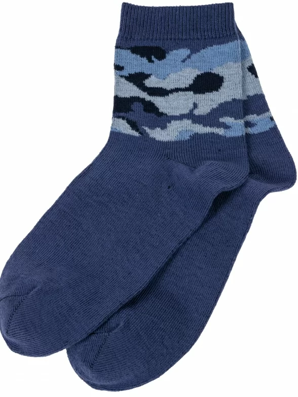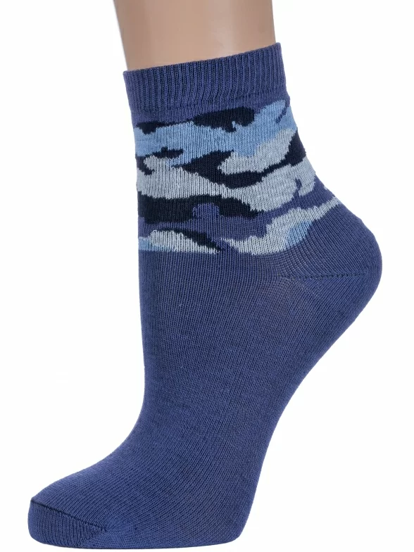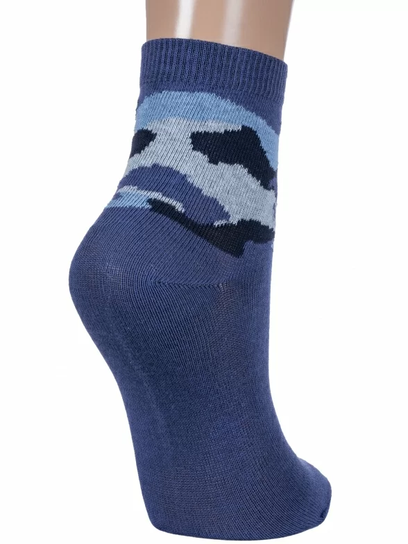 Круглогодичные укороченные детские носки, цвет джинс, повседневные, шов обычный (не бесшовные), принт (рисунок): милитари, с узором, состав: 76% хлопок, 21% полиэстер, 3% эластан, арт. 8С4. Производитель «АО Борисоглебский трикотаж, Воронежская обл, Россия» под брендом «Борисоглебский трикотаж».