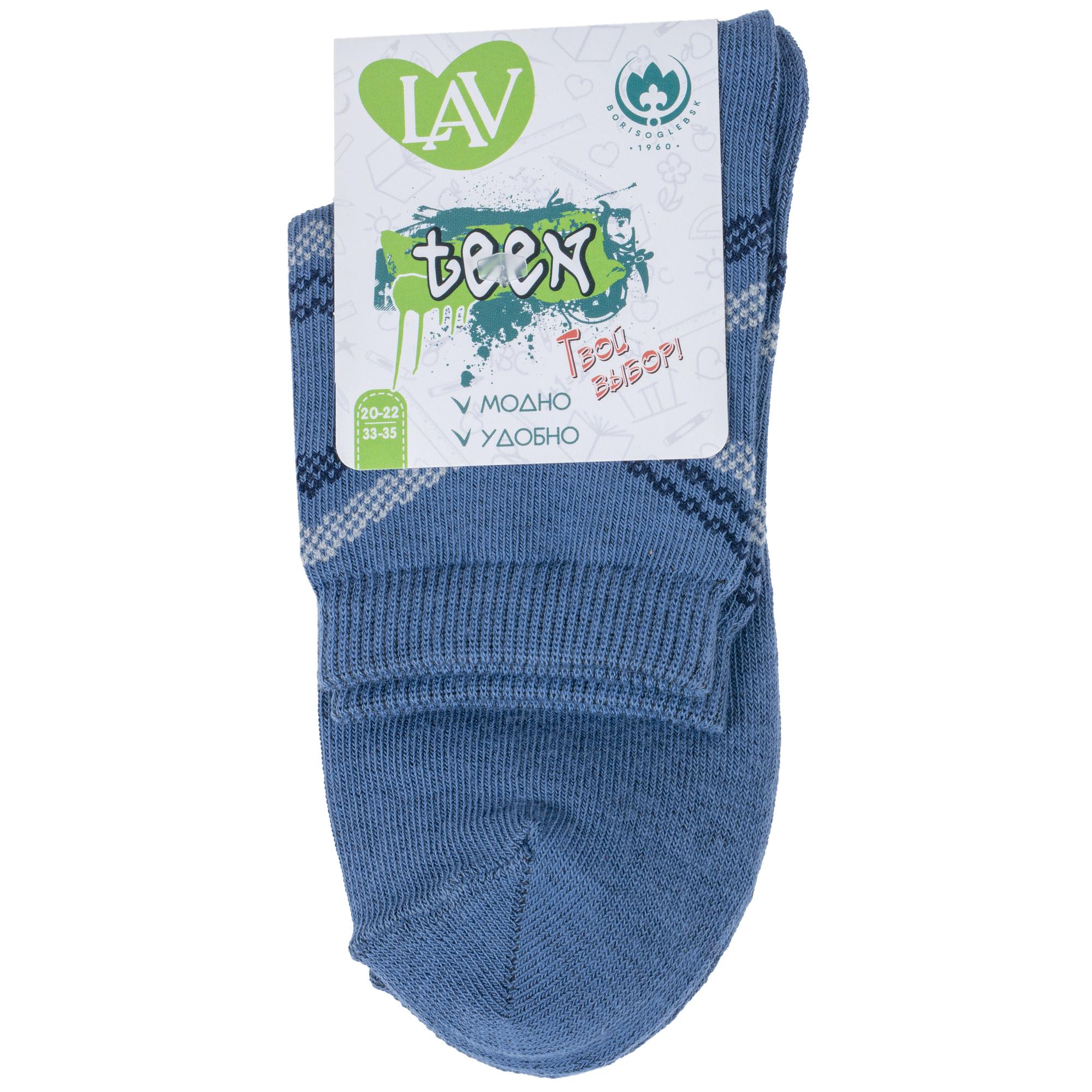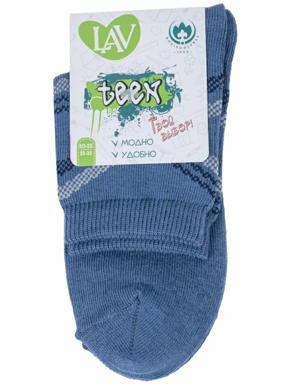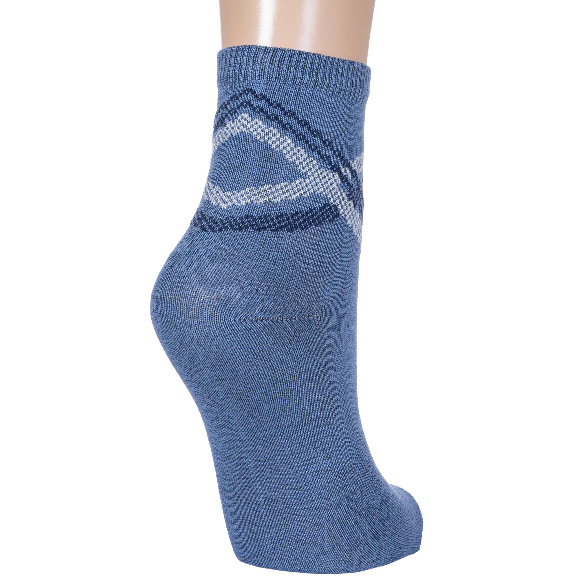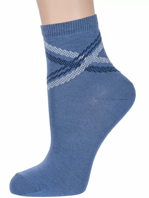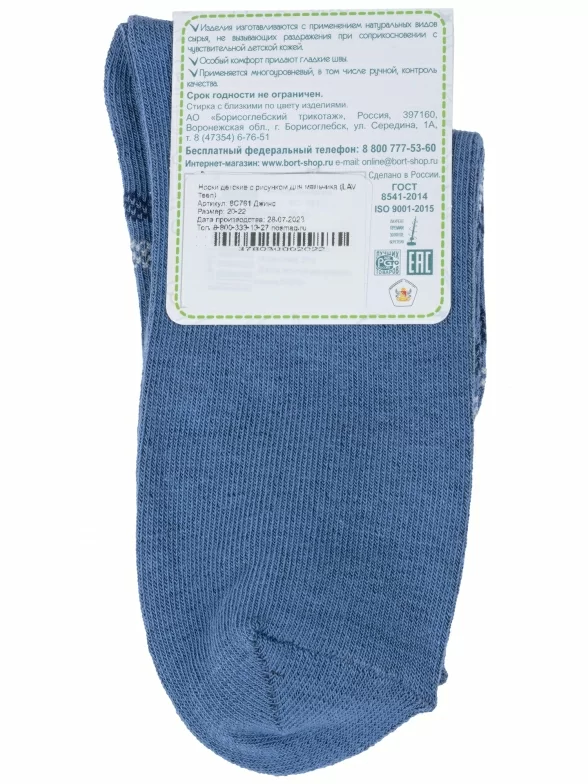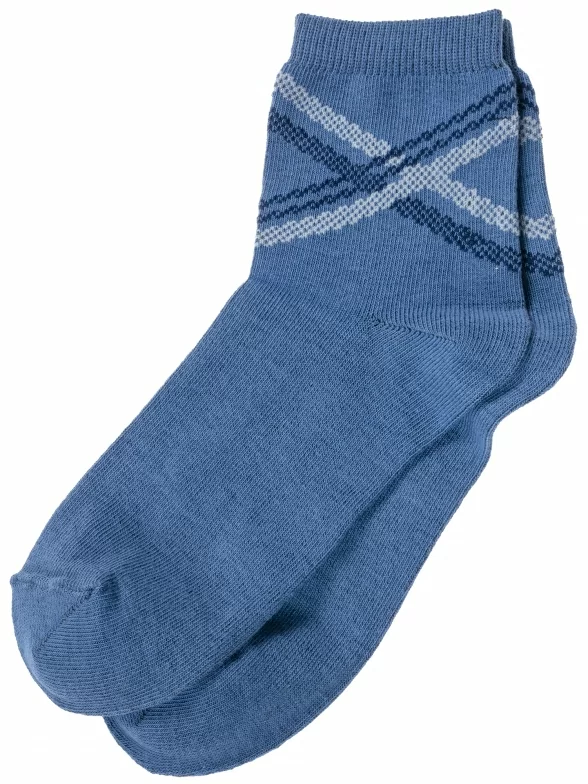 Круглогодичные укороченные детские носки, цвет джинс, классические, шов обычный (не бесшовные), принт (рисунок): полоски, абстрактный, с узором, состав: 73% хлопок, 24% полиэстер, 3% эластан, арт. 8С761. Производитель «АО Борисоглебский трикотаж, Воронежская обл, Россия» под брендом «Борисоглебский трикотаж».