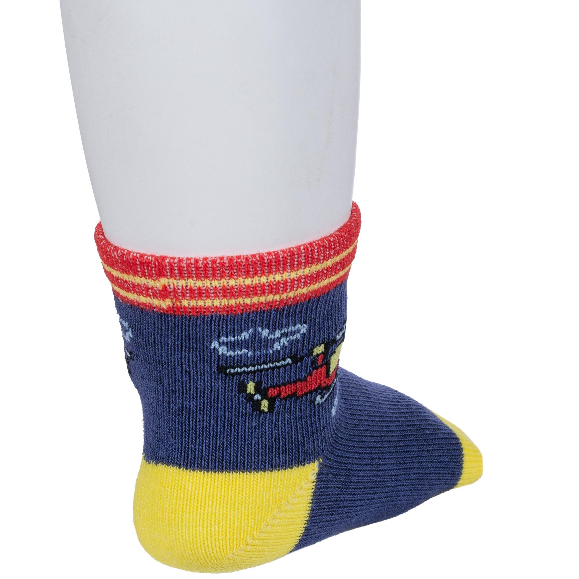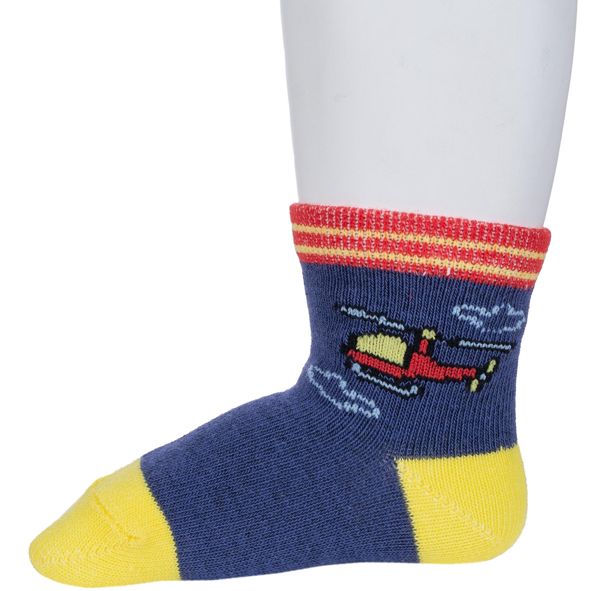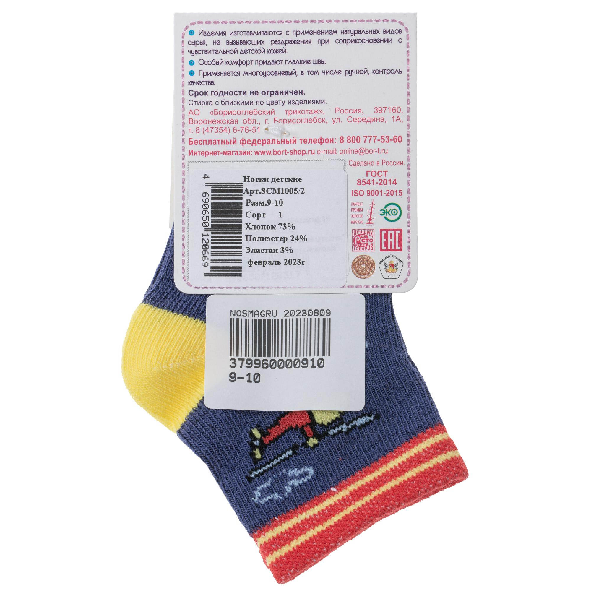 Круглогодичные укороченные детские носки, цвет джинс, повседневные, шов обычный (не бесшовные), принт (рисунок): транспорт, контрастные пятка / мысок / резинка, звезды / небо, с узором, состав: 73% хлопок, 24% полиэстер, 3% эластан, арт. 8СМ1005/2. Производитель «АО Борисоглебский трикотаж, Воронежская обл, Россия» под брендом «Борисоглебский трикотаж».
