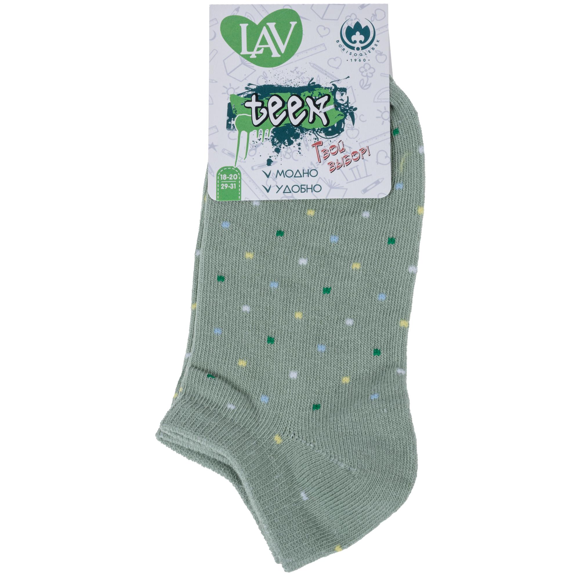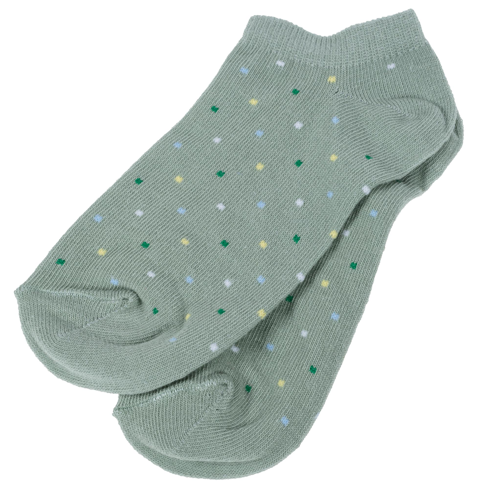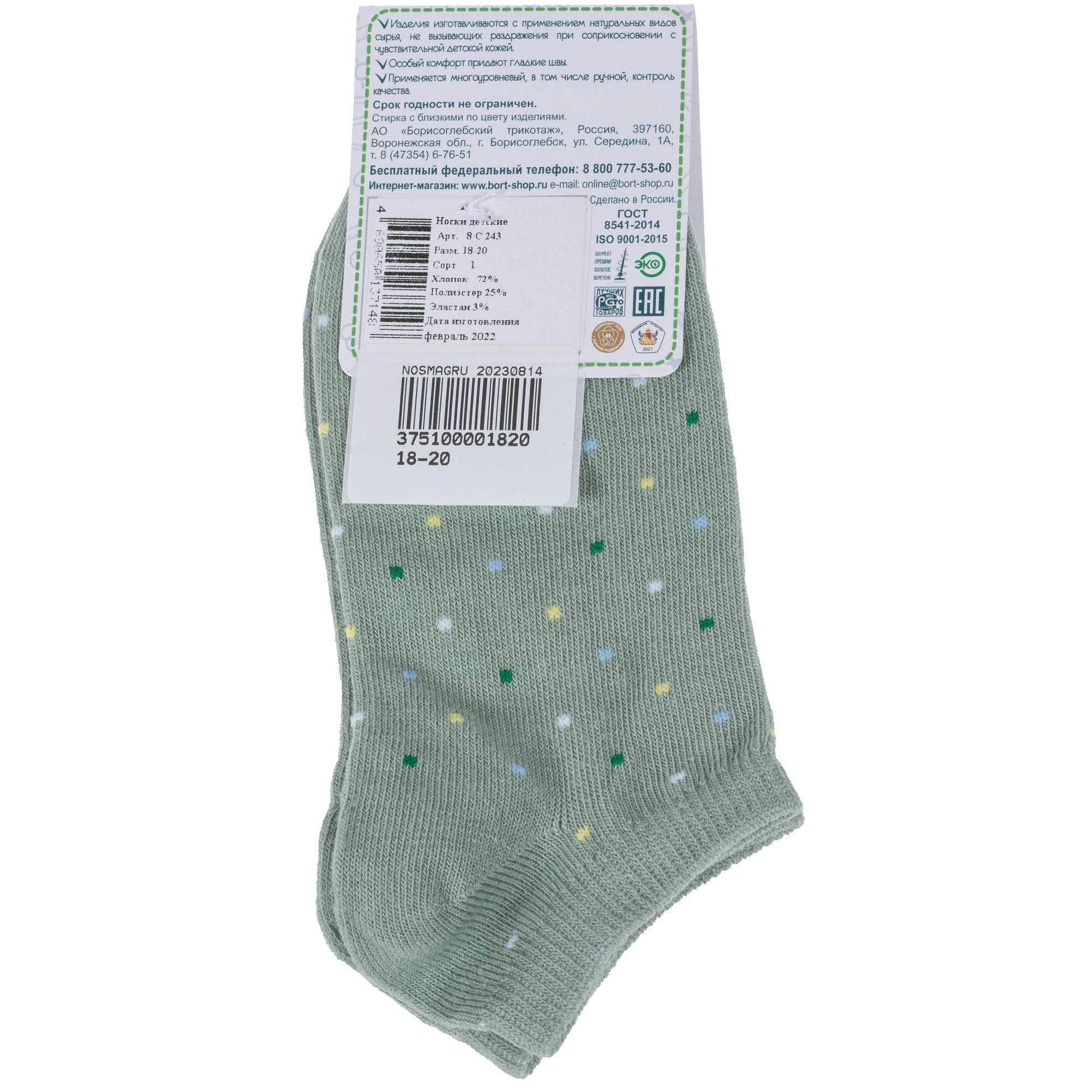 Летние ультракороткие детские носки, цвет зеленый, классические, шов обычный (не бесшовные), принт (рисунок): мелкий принт, горох / точка, с узором, состав: 72% хлопок, 25% полиэстер, 3% эластан, арт. 8С243. Производитель «АО Борисоглебский трикотаж, Воронежская обл, Россия» под брендом «Борисоглебский трикотаж».