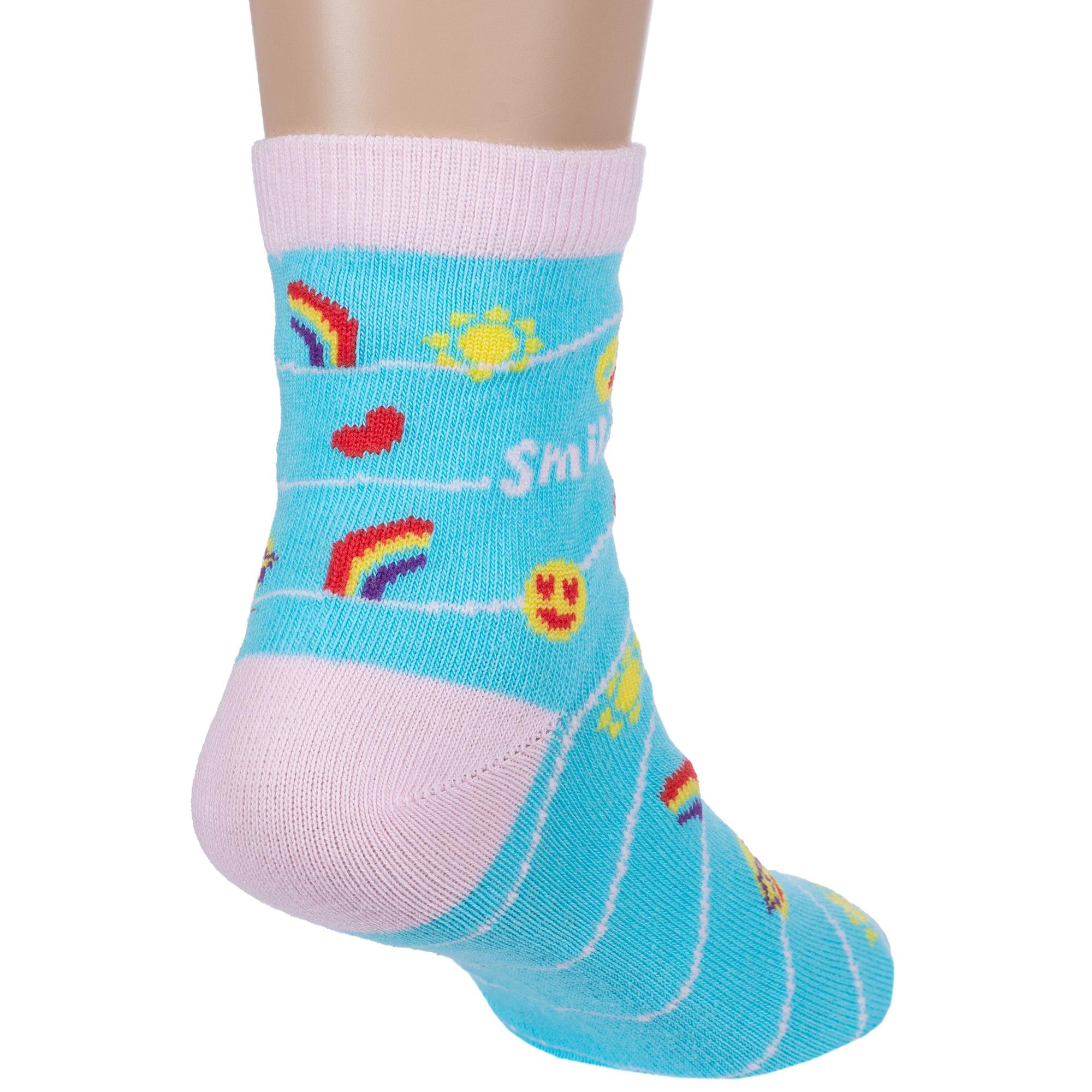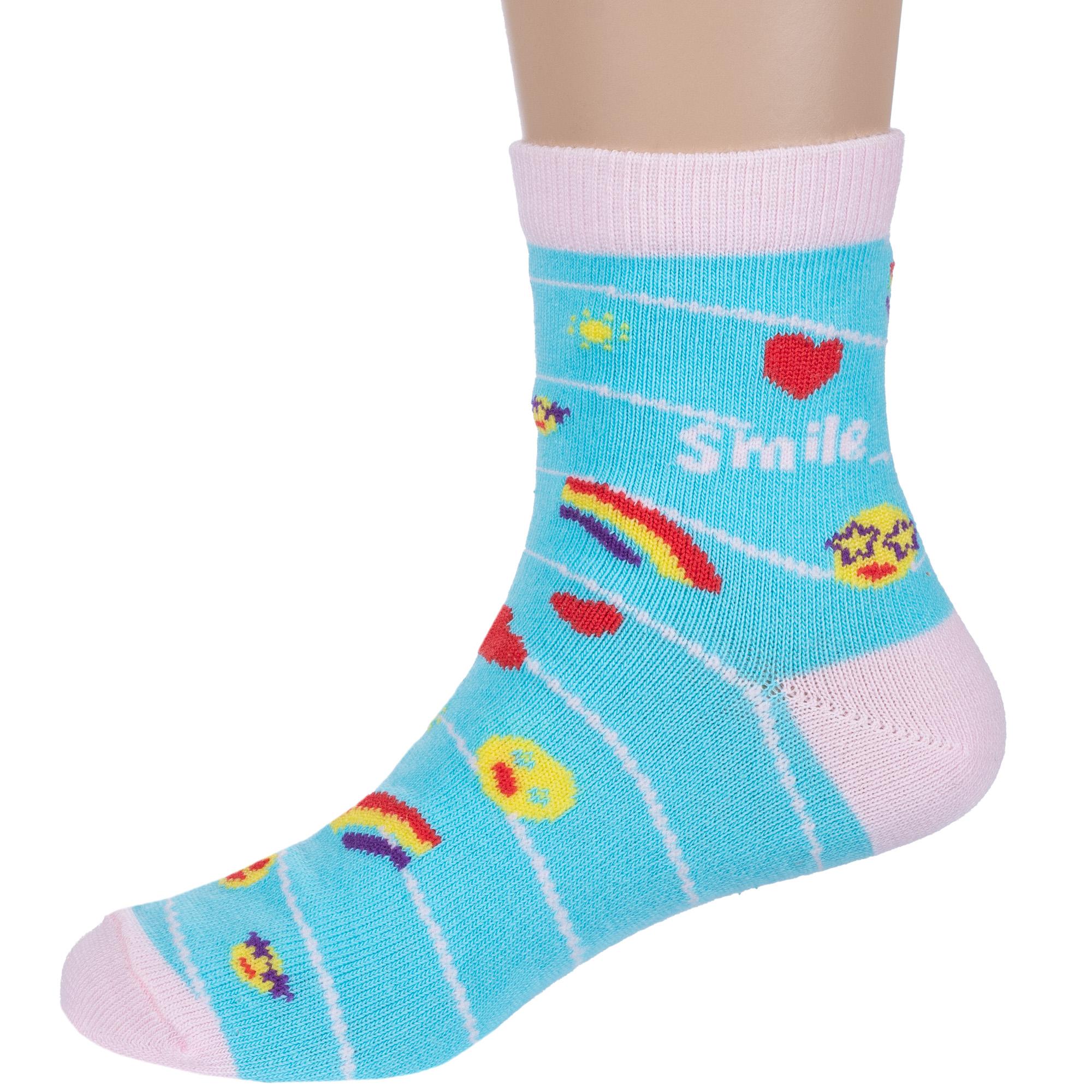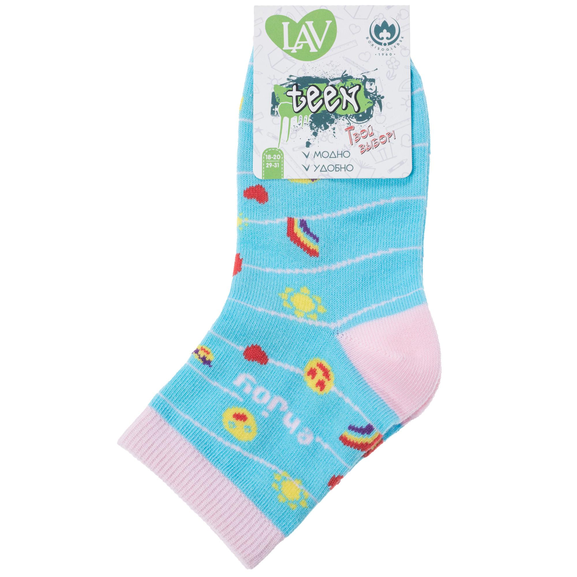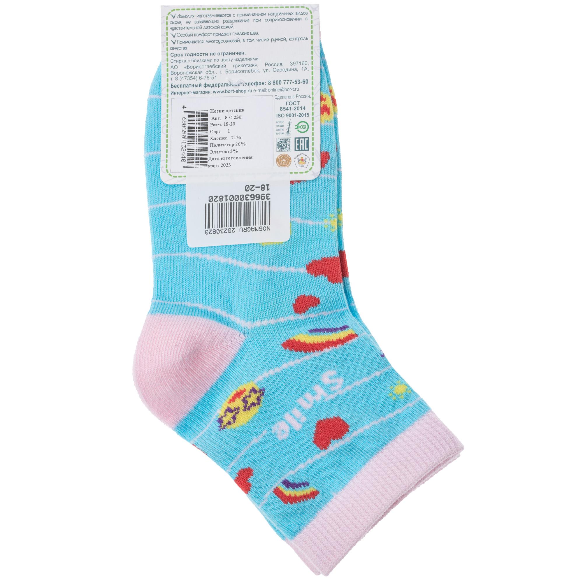 Круглогодичные укороченные детские носки, цвет голубой, повседневные, шов обычный (не бесшовные), принт (рисунок): сердечки / поцелуи / любовь, полоски, надписи, звезды / небо, с узором, состав: 71% хлопок, 26% полиэстер, 3% эластан, арт. 8С230. Производитель «АО Борисоглебский трикотаж, Воронежская обл, Россия» под брендом «Борисоглебский трикотаж».