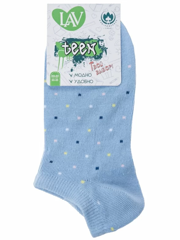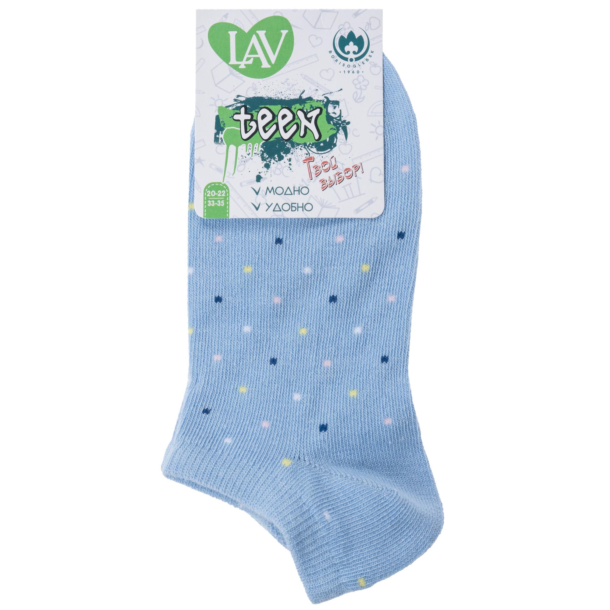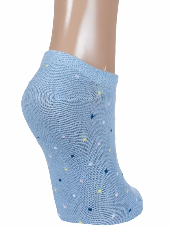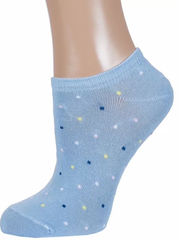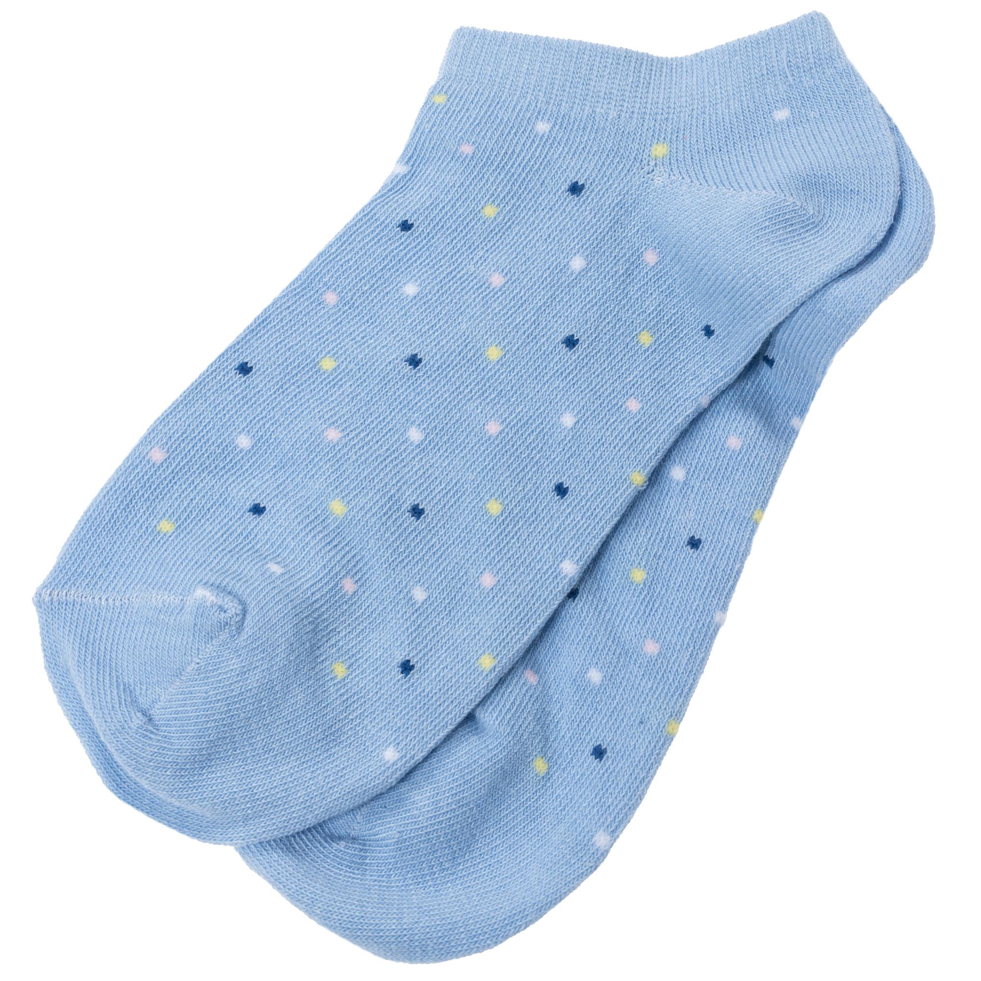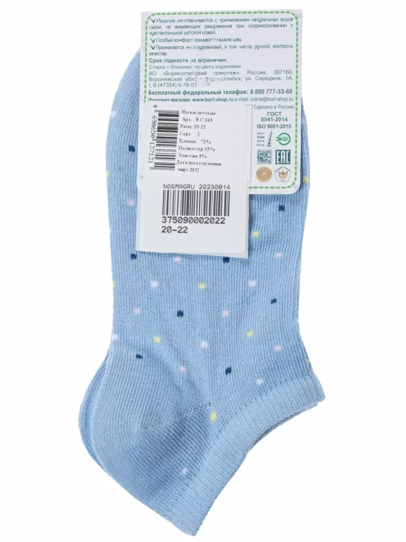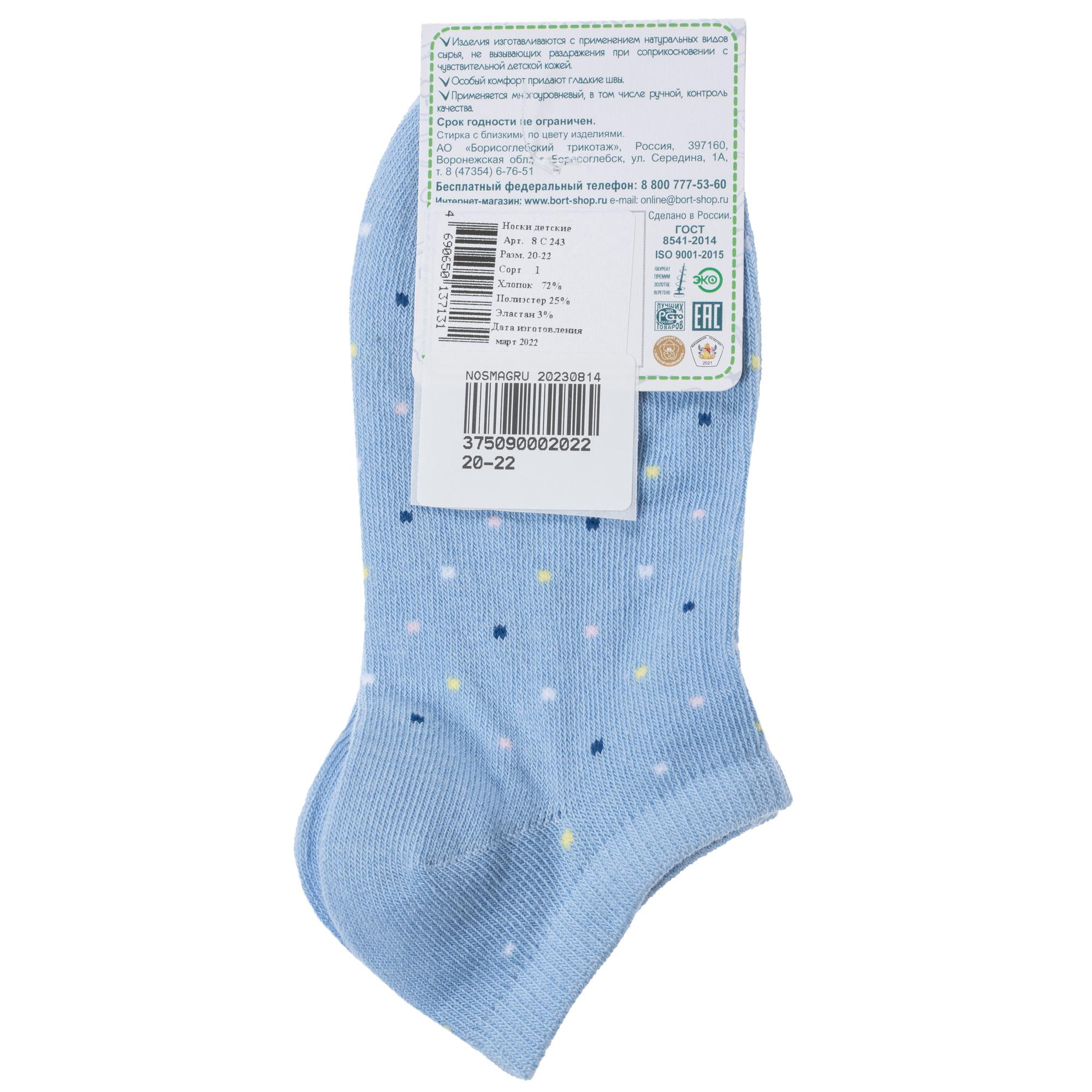 Летние ультракороткие детские носки, цвет голубой, классические, шов обычный (не бесшовные), принт (рисунок): мелкий принт, горох / точка, с узором, состав: 72% хлопок, 25% полиэстер, 3% эластан, арт. 8С243. Производитель «АО Борисоглебский трикотаж, Воронежская обл, Россия» под брендом «Борисоглебский трикотаж».