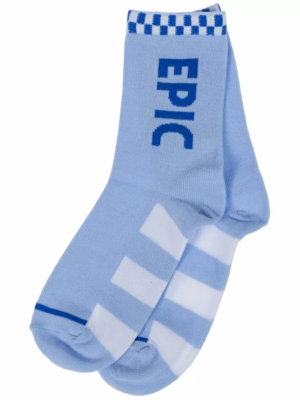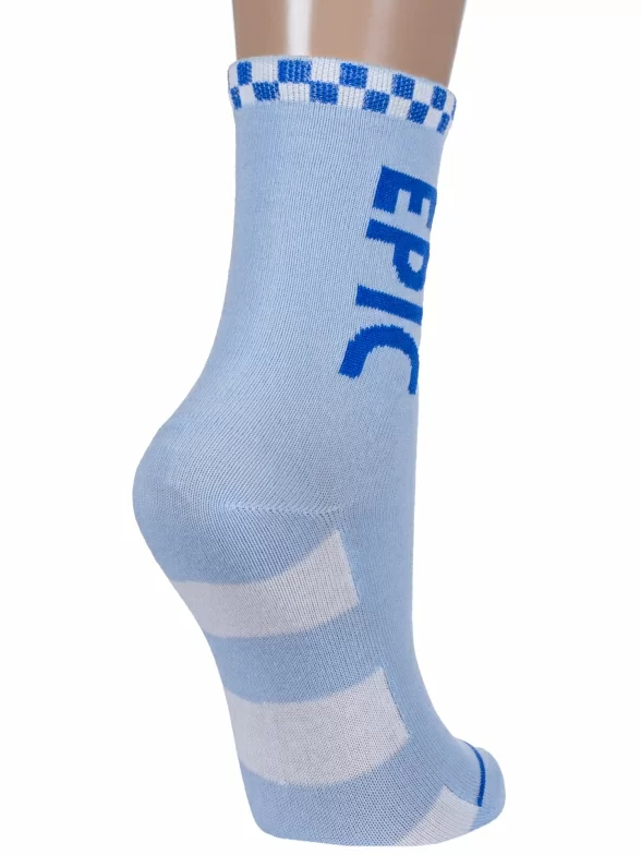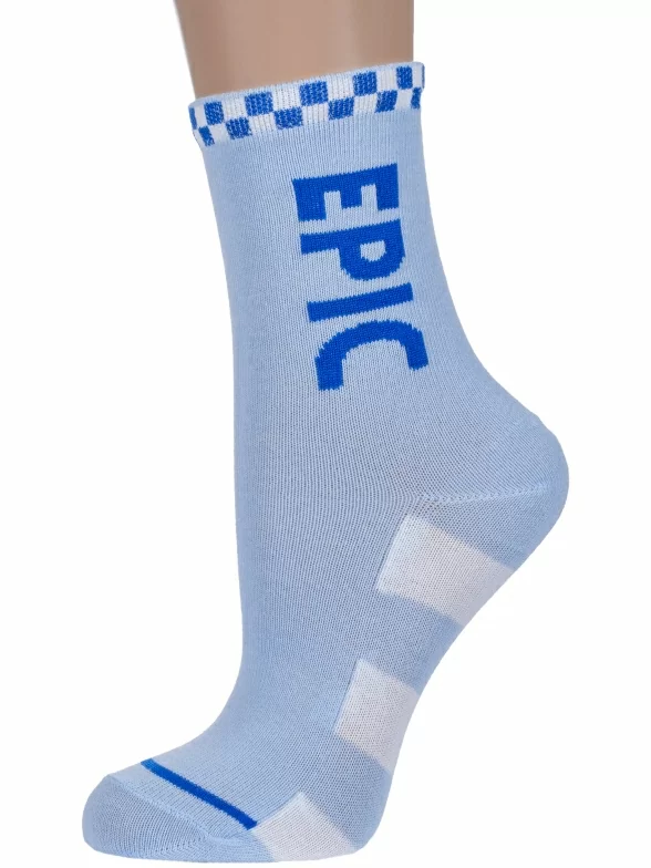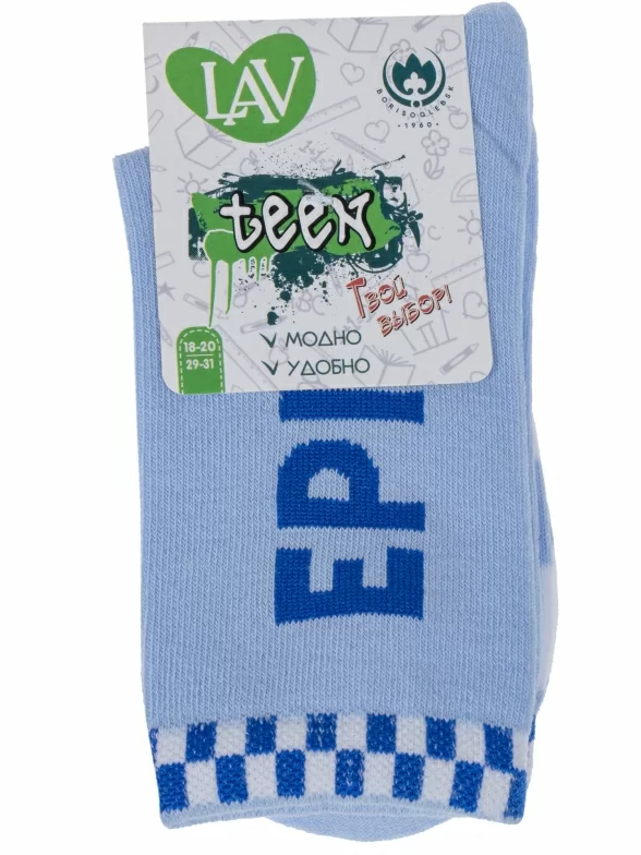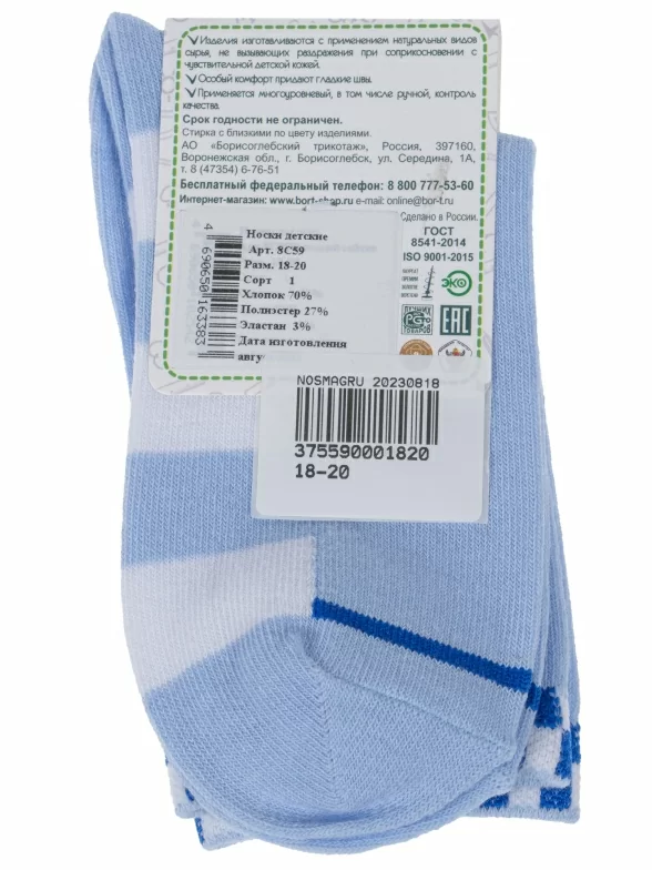 Круглогодичные средней длины детские носки, цвет голубой, повседневные, шов обычный (не бесшовные), принт (рисунок): полоски, надписи, контрастные пятка / мысок / резинка, с узором, состав: 70% хлопок, 27% полиамид, 3% эластан, арт. 8С59. Производитель «АО Борисоглебский трикотаж, Воронежская обл, Россия» под брендом «Борисоглебский трикотаж».