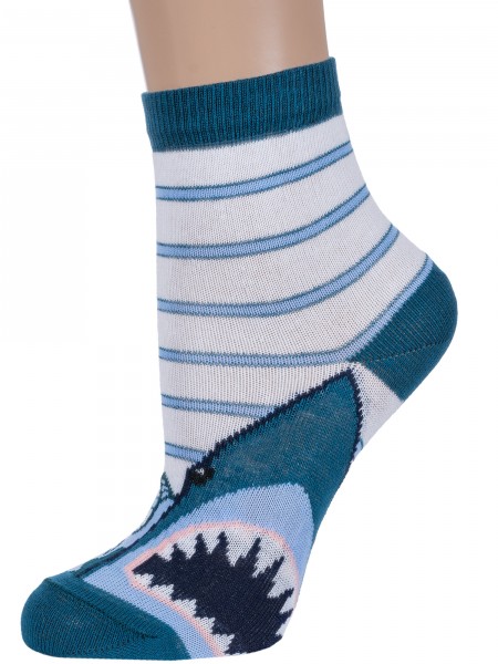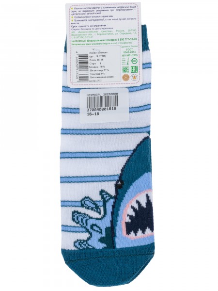 Круглогодичные средней длины детские носки, цвет голубой, повседневные, шов обычный (не бесшовные), принт (рисунок): полоски, надписи, контрастные пятка/мысок/резинка, с узором, состав: 70% хлопок, 27% полиамид, 3% эластан, арт. 8С59. Производитель «АО Борисоглебский трикотаж, Воронежская обл, Россия» под брендом «Борисоглебский трикотаж».