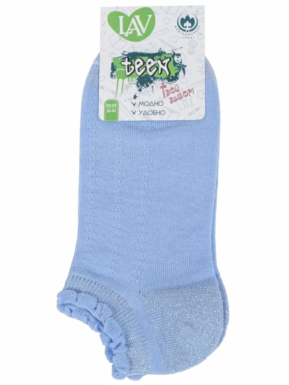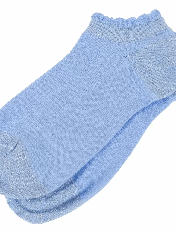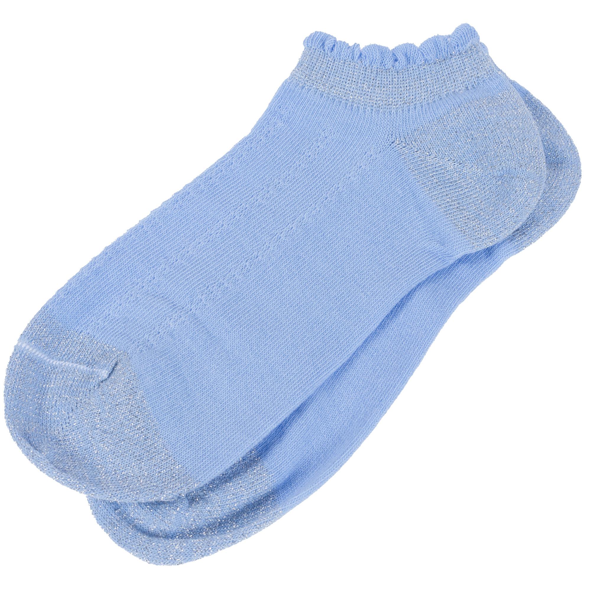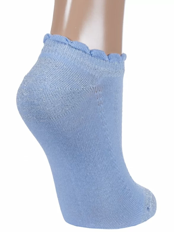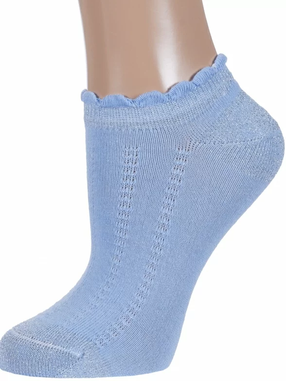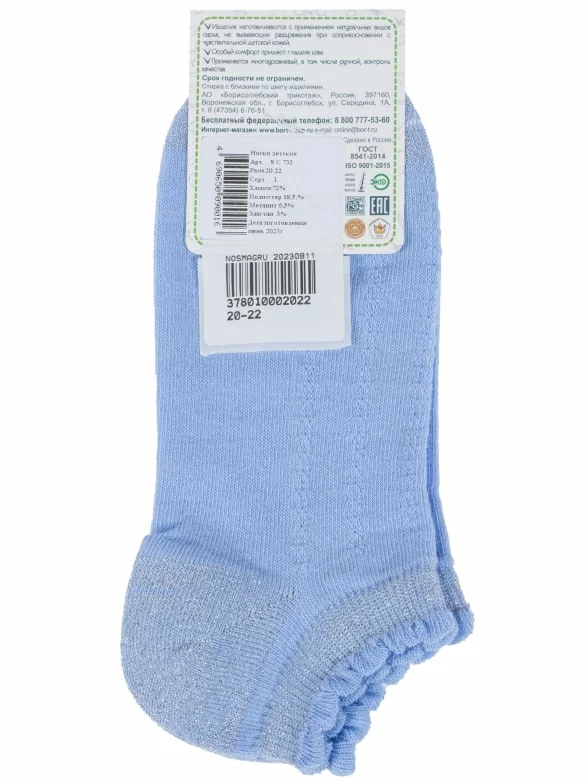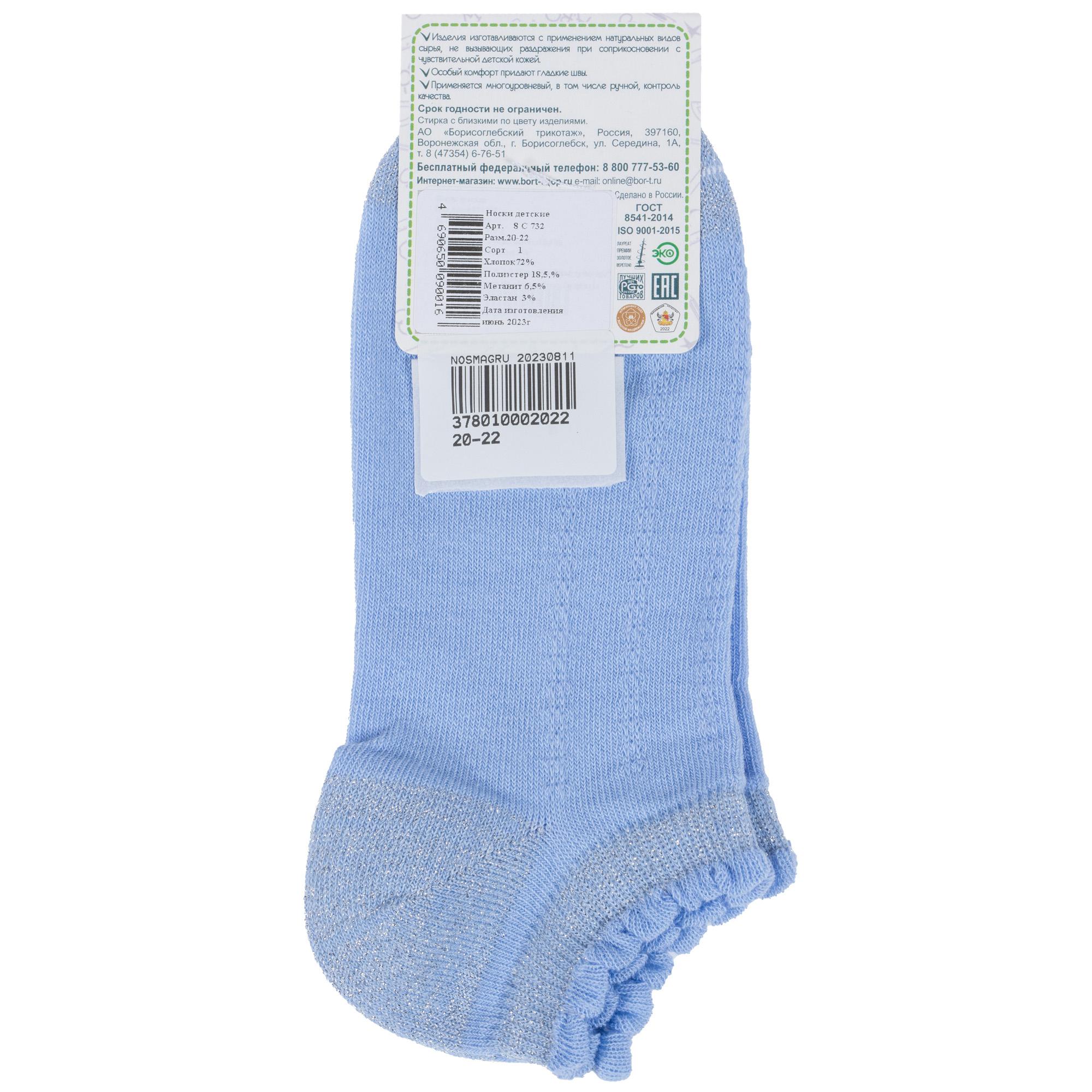 Летние ультракороткие детские носки, цвет голубой, в сеточку, классические, шов кеттельный (бесшовная технология), принт (рисунок): контрастные пятка / мысок / резинка, блеск люрекса, однотонный, состав: 72% хлопок, 18.5% полиэстер, 6.5% метанит, 3% эластан, арт. 8С732. Производитель «АО Борисоглебский трикотаж, Воронежская обл, Россия» под брендом «Борисоглебский трикотаж».
