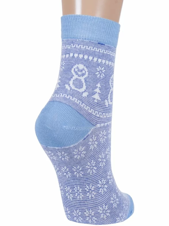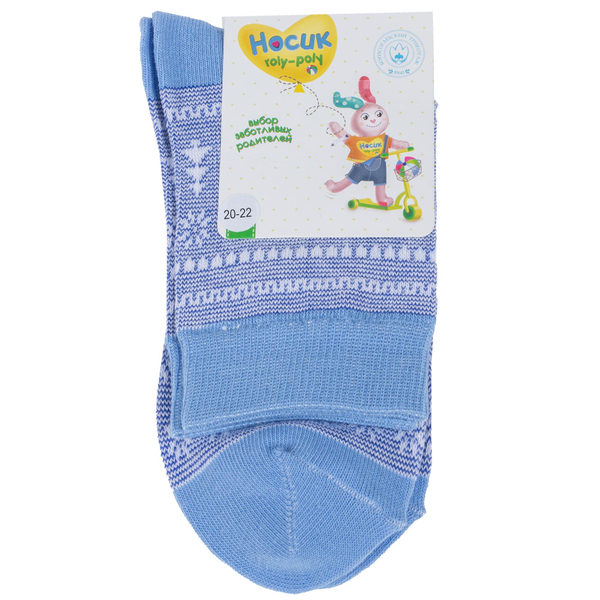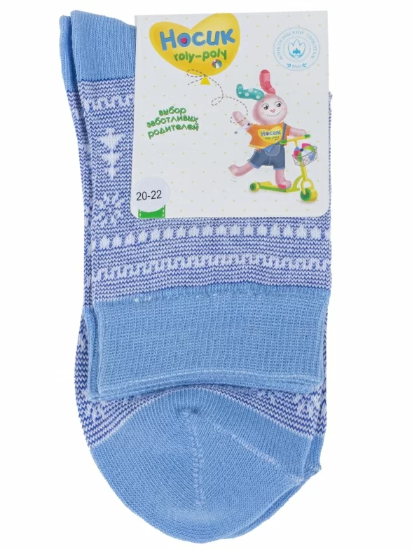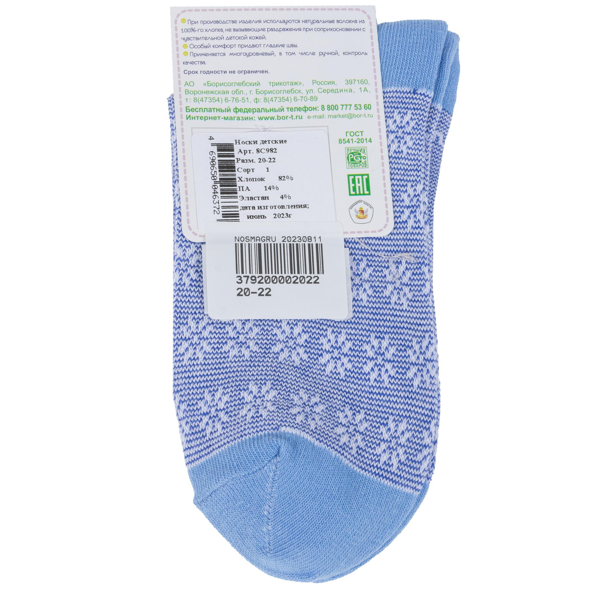 Круглогодичные укороченные детские носки, цвет голубой, повседневные, шов обычный (не бесшовные), принт (рисунок): норвежский жаккард, контрастные пятка / мысок / резинка, зимний, с узором, состав: 82% хлопок, 14% полиамид, 4% эластан, арт. 8С982. Производитель «АО Борисоглебский трикотаж, Воронежская обл, Россия» под брендом «Борисоглебский трикотаж».