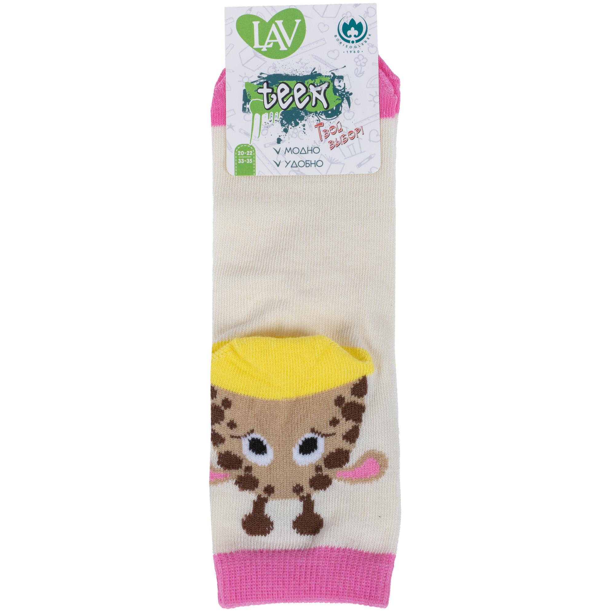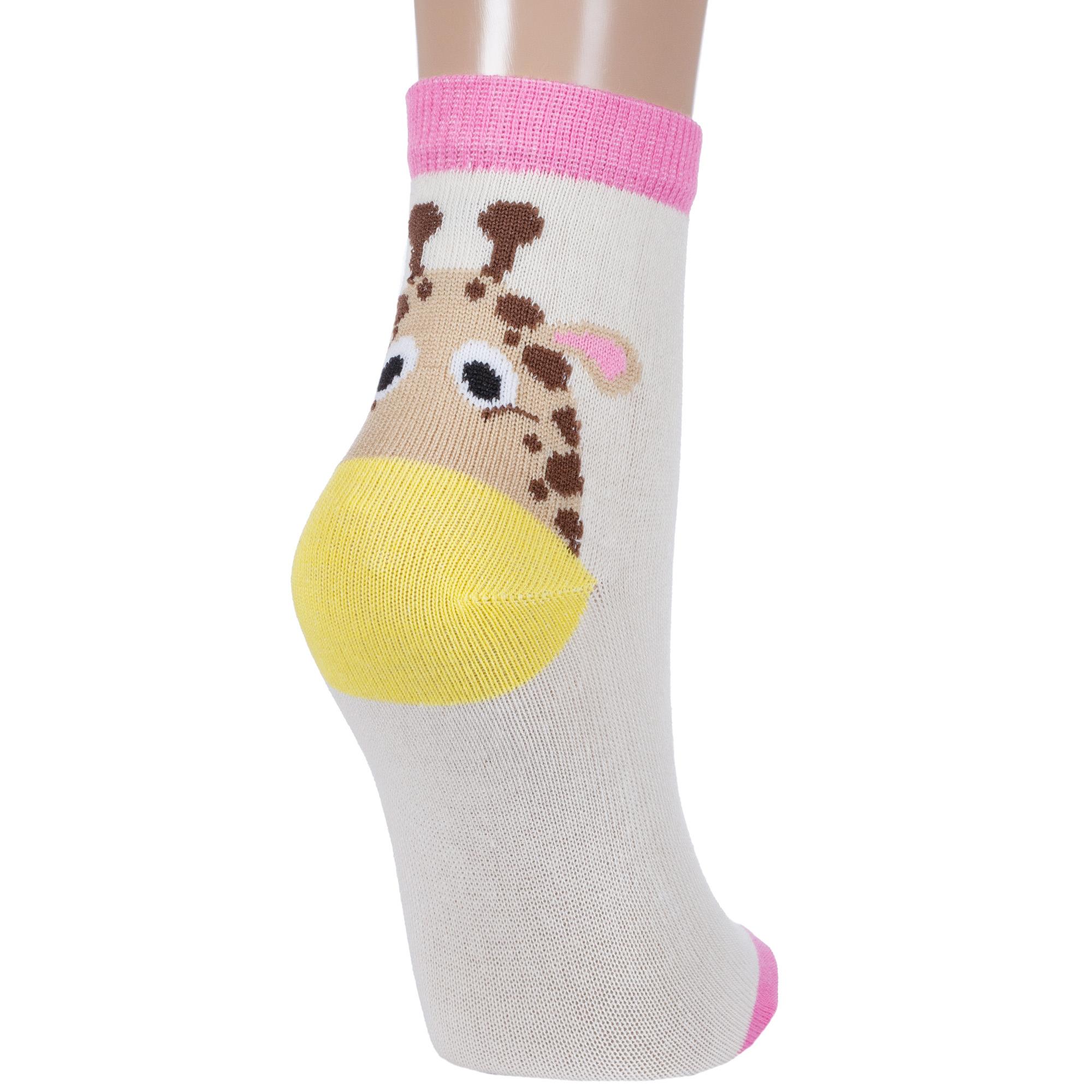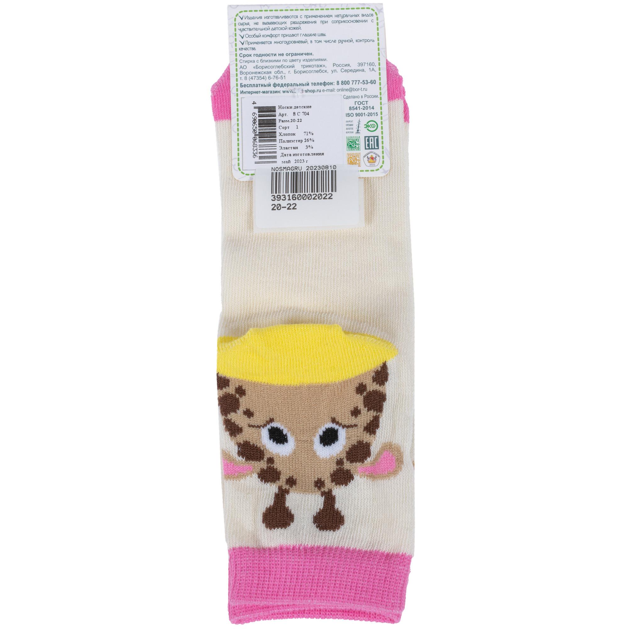 Круглогодичные укороченные детские носки, цвет кремовый, повседневные, шов обычный (не бесшовные), принт (рисунок): контрастные пятка / мысок / резинка, животные, с узором, состав: 71% хлопок, 26% полиэстер, 3% эластан, арт. 8С704. Производитель «АО Борисоглебский трикотаж, Воронежская обл, Россия» под брендом «Борисоглебский трикотаж».