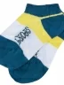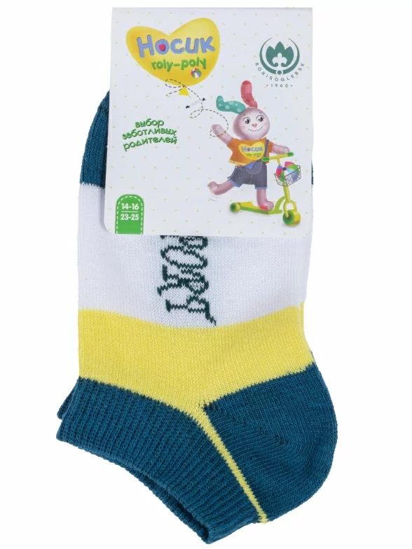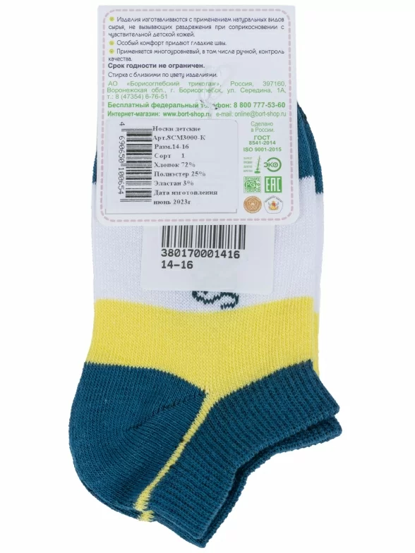 Круглогодичные ультракороткие детские носки, цвет синий-многоцветные (мультиколор), спортивные, возможно бесшовные, принт (рисунок): спортивные, надписи, контрастные пятка / мысок / резинка, с узором, состав: 72% хлопок, 25% полиэстер, 3% эластан, арт. 8СМ3000-К. Производитель «АО Борисоглебский трикотаж, Воронежская обл, Россия» под брендом «Борисоглебский трикотаж».