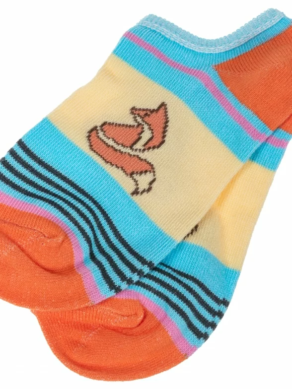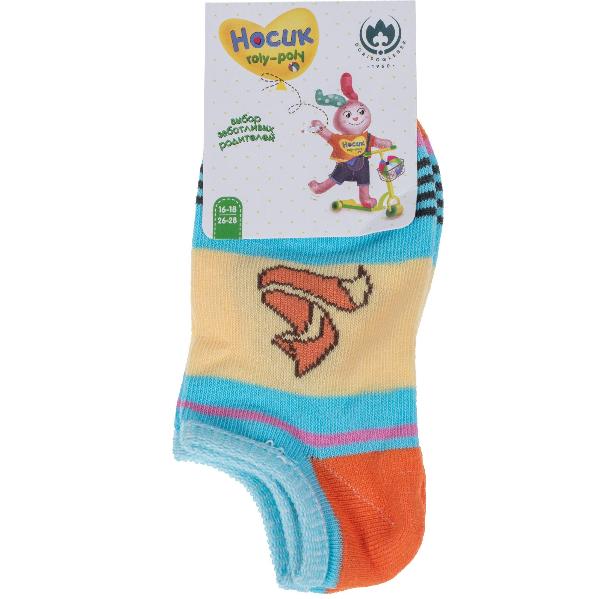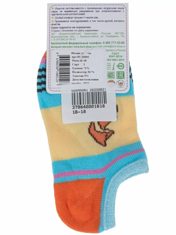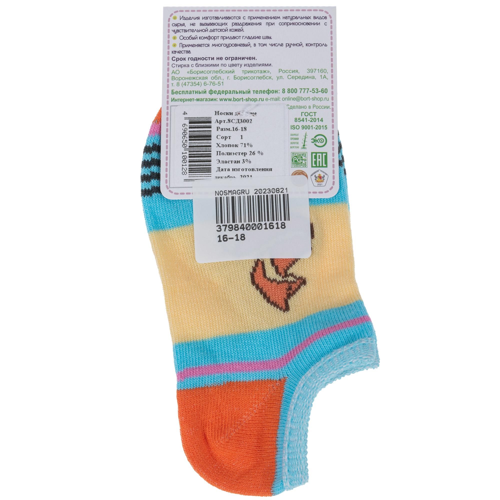 Летние ультракороткие детские носки, цвет многоцветные (мультиколор), повседневные, шов обычный (не бесшовные), принт (рисунок): полоски, контрастные пятка / мысок / резинка, животные, с узором, состав: 71% хлопок, 26% полиамид, 3% эластан, арт. 8СД3002. Производитель «АО Борисоглебский трикотаж, Воронежская обл, Россия» под брендом «Борисоглебский трикотаж».