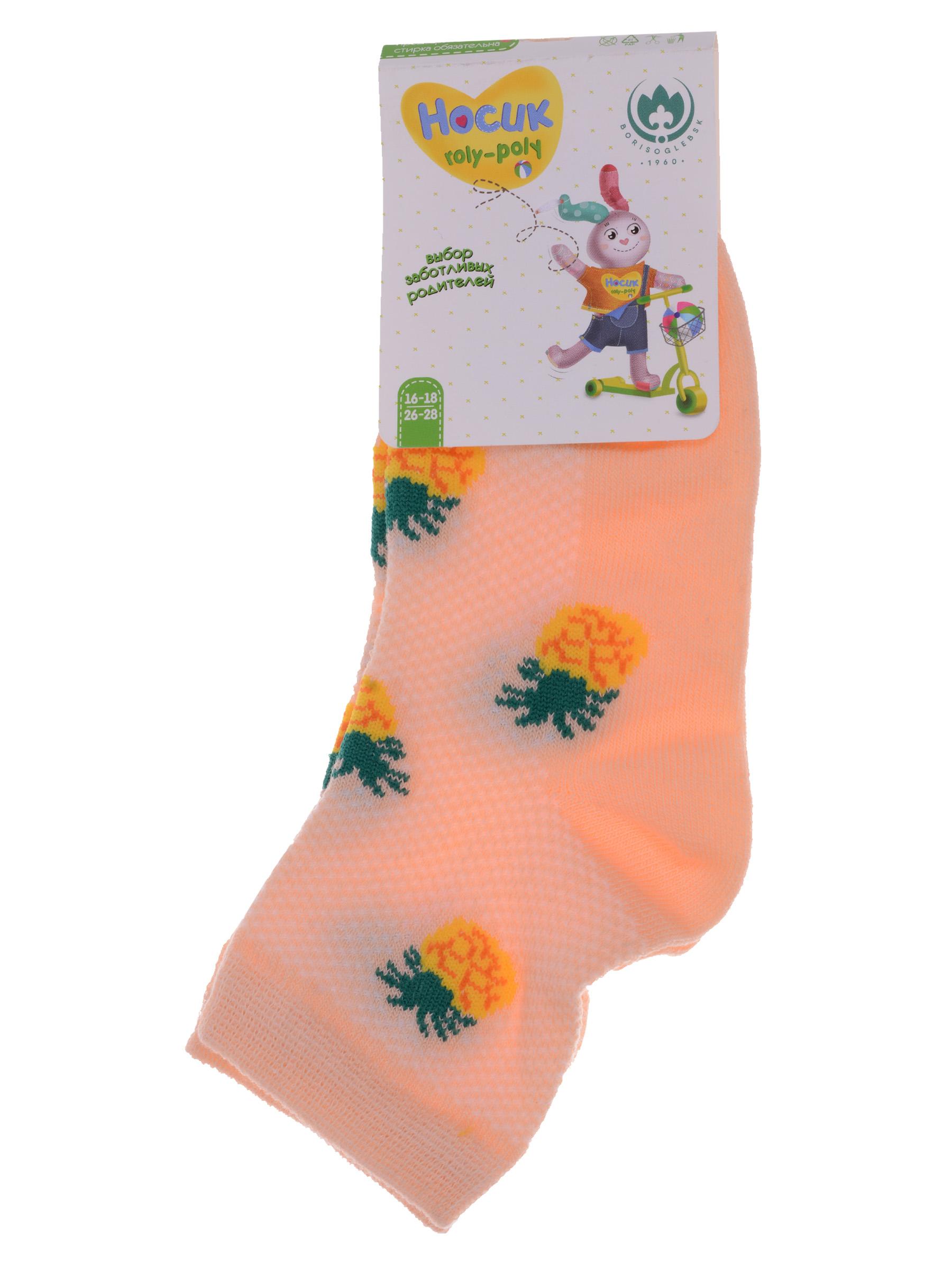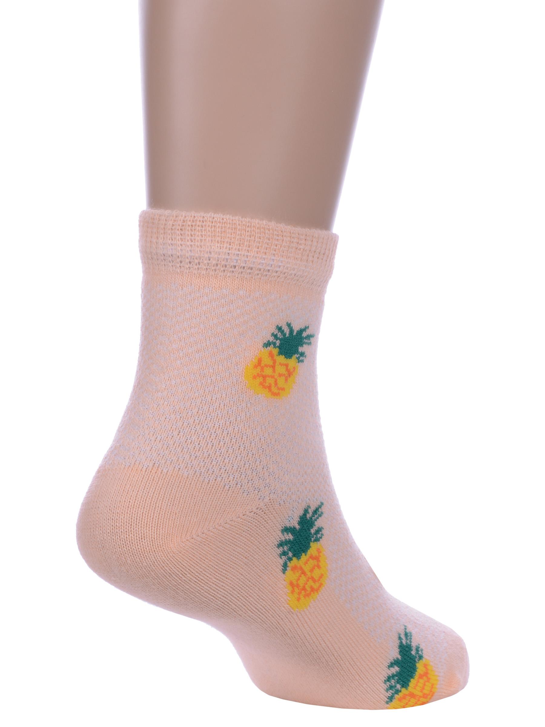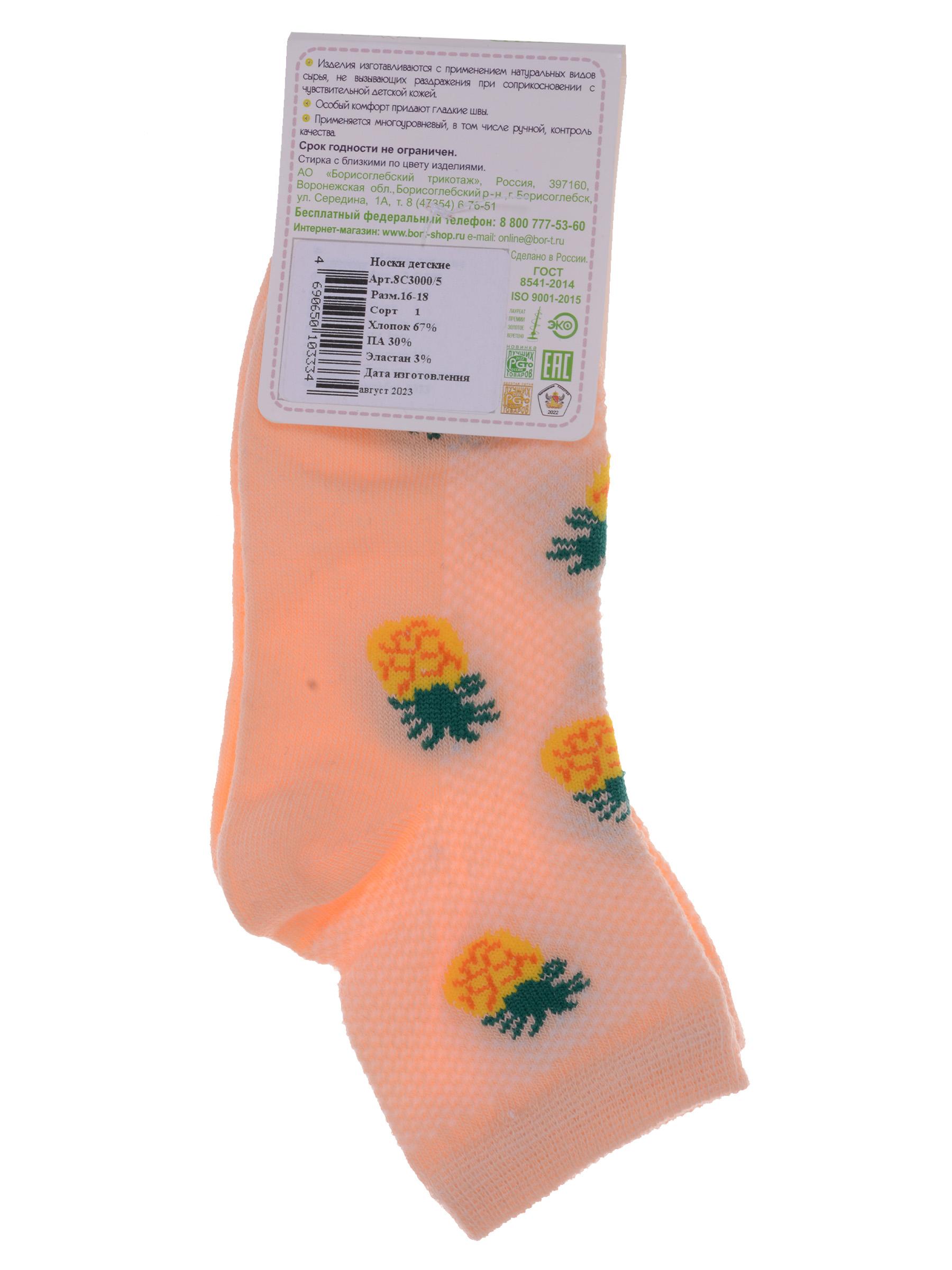Летние укороченные детские носки, цвет бежевый, в сеточку, шов обычный (не бесшовные), принт (рисунок): овощи / фрукты / ягоды, состав: 67% хлопок, 30% полиамид, 3% эластан, арт. 8С3000/5. Производитель «АО Борисоглебский трикотаж, Воронежская обл, Россия» под брендом «Борисоглебский трикотаж».