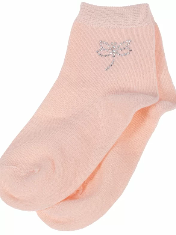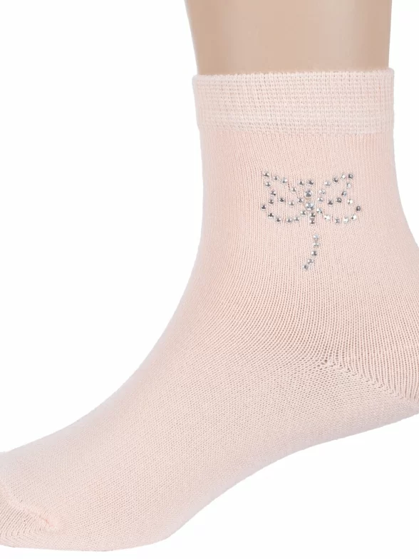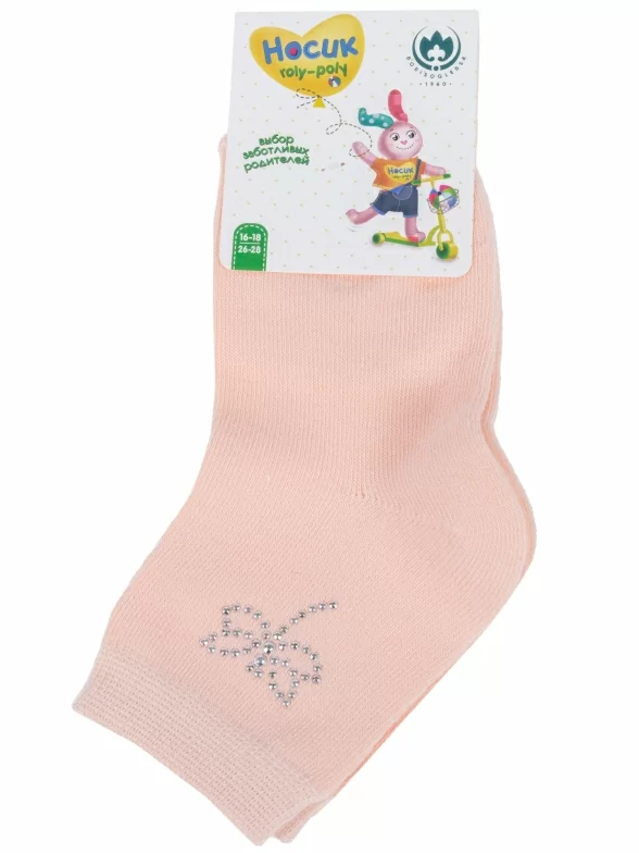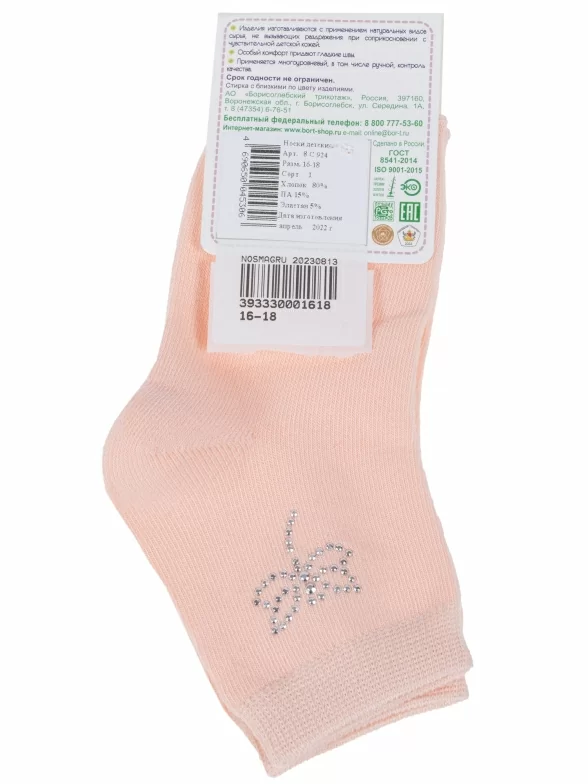 Круглогодичные укороченные детские носки, цвет розовый-оранжевый, с украшениями, классические, шов обычный (не бесшовные), принт (рисунок): бабочки / бантики, с узором, однотонный, состав: 80% хлопок, 15% полиамид, 5% эластан, арт. 8С924. Производитель «АО Борисоглебский трикотаж, Воронежская обл, Россия» под брендом «Борисоглебский трикотаж».