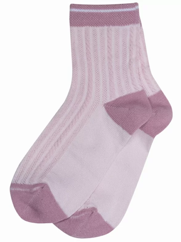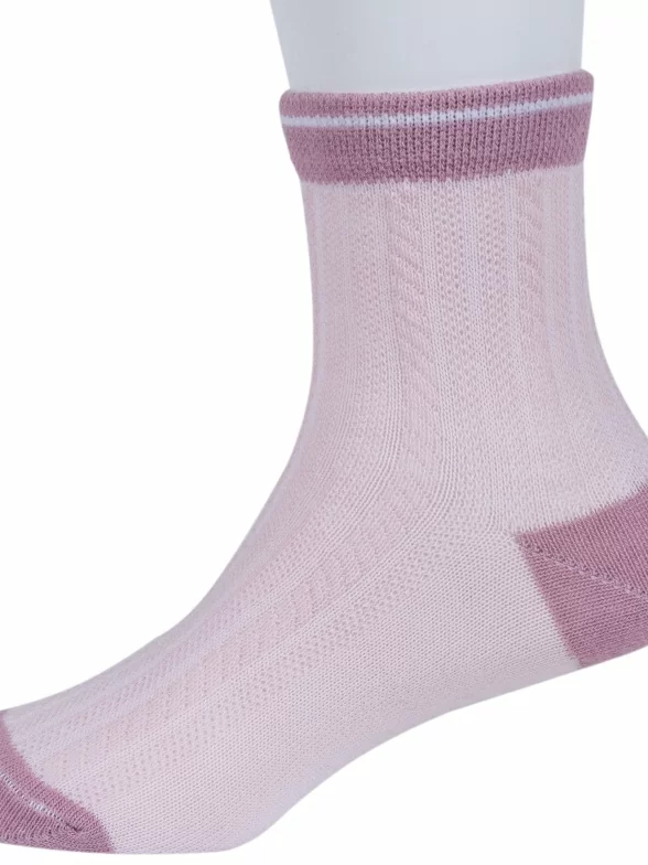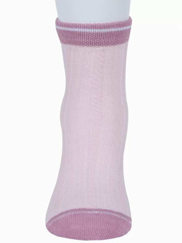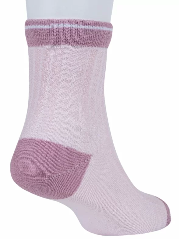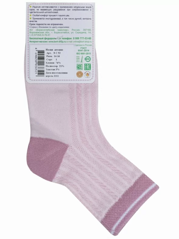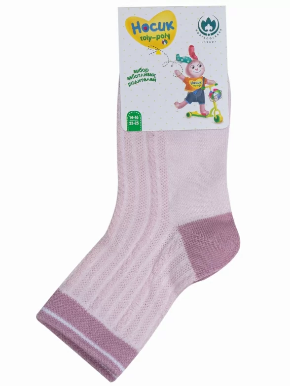 Летние укороченные детские носки, цвет розовый, в сеточку, классические, шов обычный (не бесшовные), принт (рисунок): контрастные пятка / мысок / резинка, с узором, состав: 76% хлопок, 21% полиэстер, 3% эластан, арт. 8С52. Производитель «АО Борисоглебский трикотаж, Воронежская обл, Россия» под брендом «Борисоглебский трикотаж».