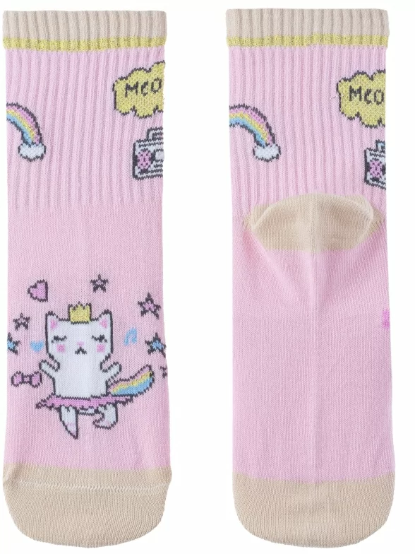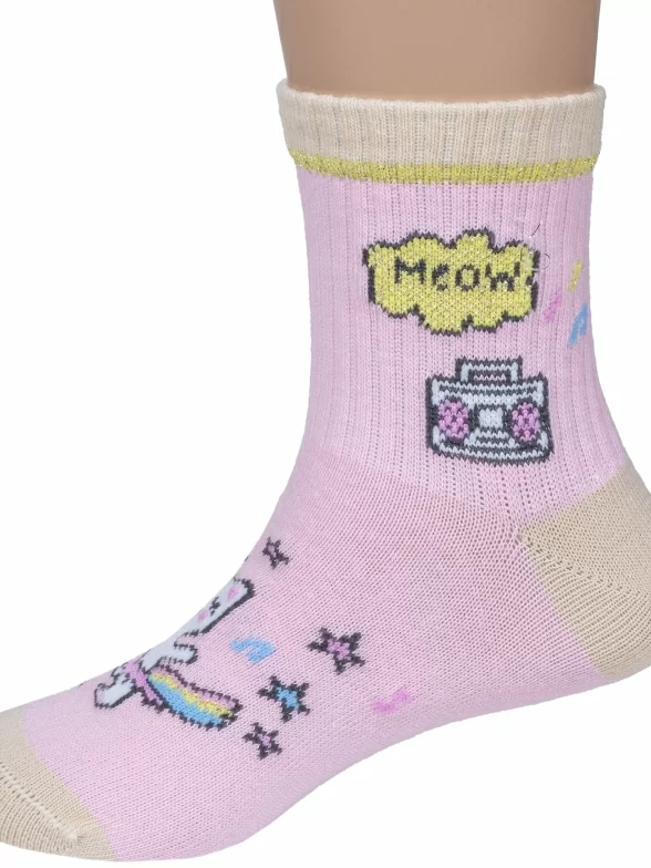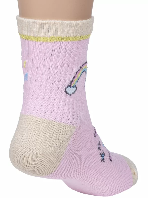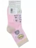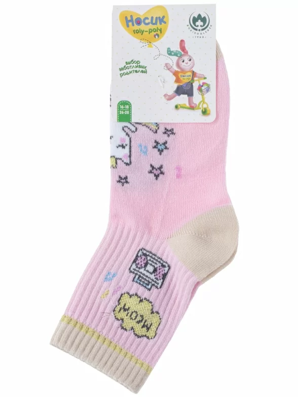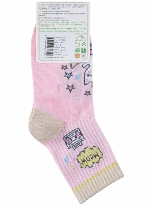 Круглогодичные укороченные детские носки, цвет розовый, повседневные, шов кеттельный (бесшовная технология), принт (рисунок): надписи, контрастные пятка / мысок / резинка, животные, блеск люрекса, с узором, состав: 60% хлопок, 33% полиамид, 7% эластан, арт. 8С231. Производитель «АО Борисоглебский трикотаж, Воронежская обл, Россия» под брендом «Борисоглебский трикотаж».