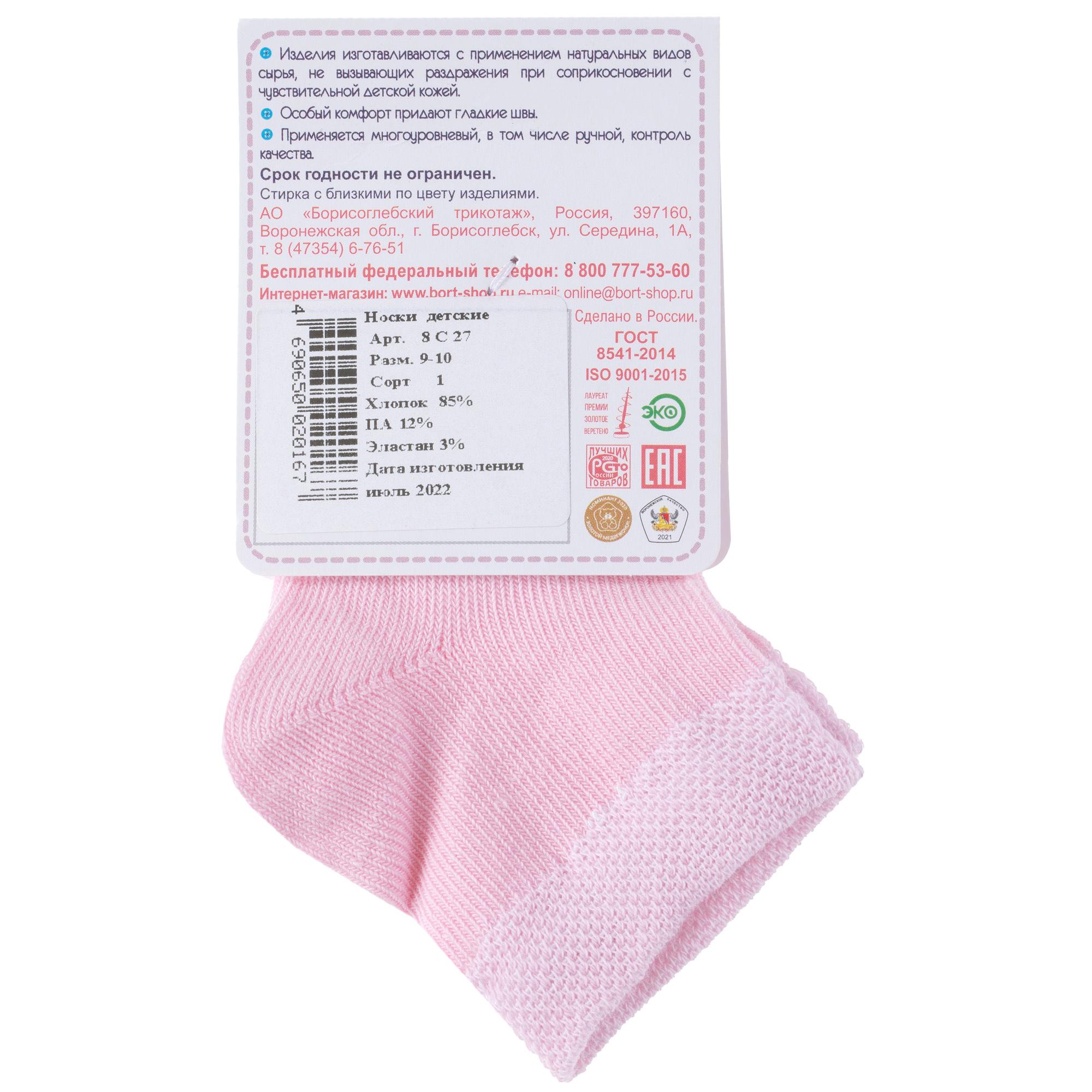 Круглогодичные короткие детские носки, цвет розовый, классические, шов обычный (не бесшовные), принт (рисунок): однотонный, без рисунков/узоров, состав: 85% хлопок, 12% полиамид, 3% эластан, арт. 8С27. Производитель «АО Борисоглебский трикотаж, Воронежская обл, Россия» под брендом «Борисоглебский трикотаж».