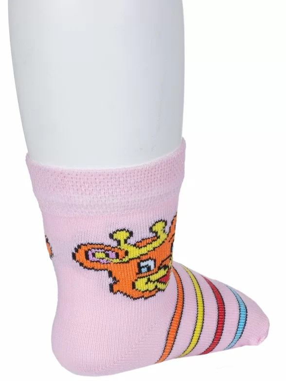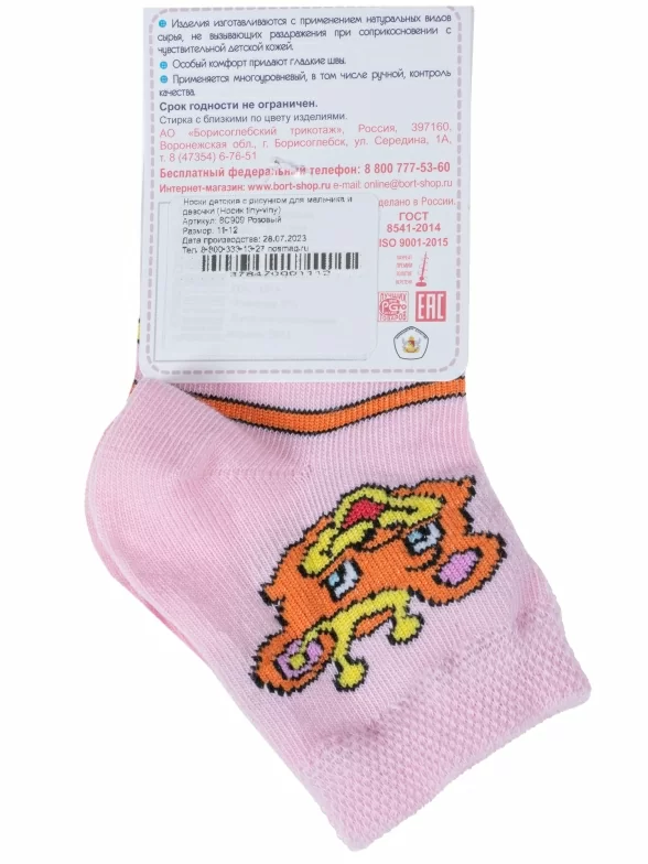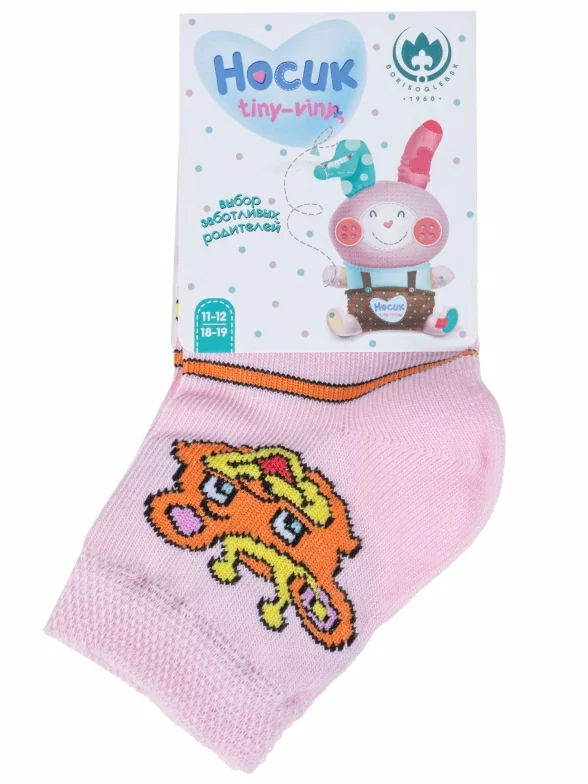 Круглогодичные укороченные детские носки, цвет розовый, повседневные, шов обычный (не бесшовные), принт (рисунок): полоски, животные, с узором, крупные контрастные рисунки, состав: 80% хлопок, 15% полиамид, 5% эластан, арт. 8С909. Производитель «АО Борисоглебский трикотаж, Воронежская обл, Россия» под брендом «Борисоглебский трикотаж».